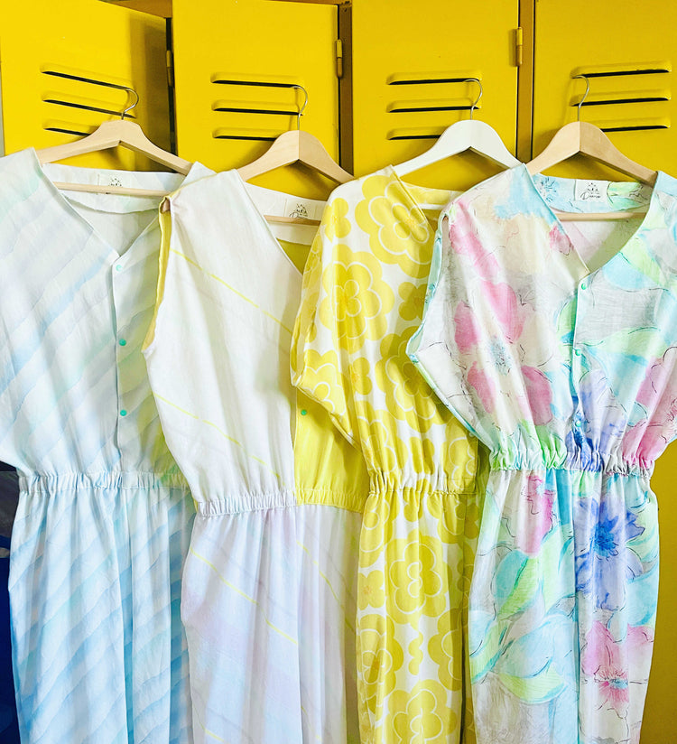 Buksedragterne er syet af de blødeste retrotekstiler og designet, så de sidder flot og er virkelig komfortable at have på. Buksedragterne er lavet med elastik i taljen, så den ikke strammer nogen steder.