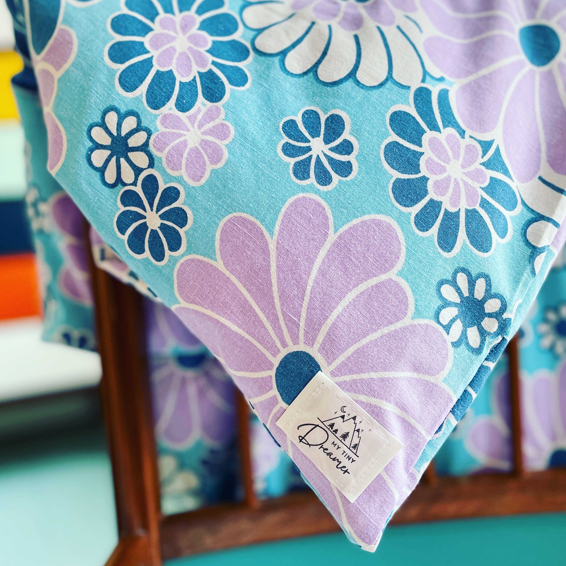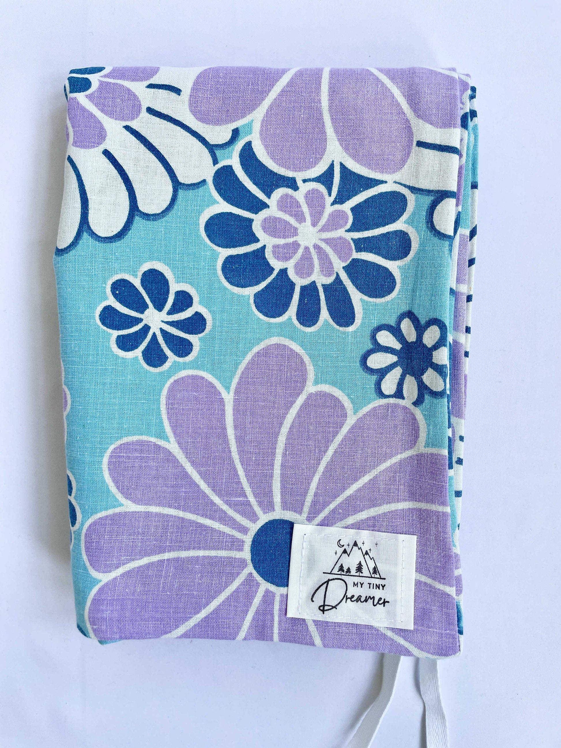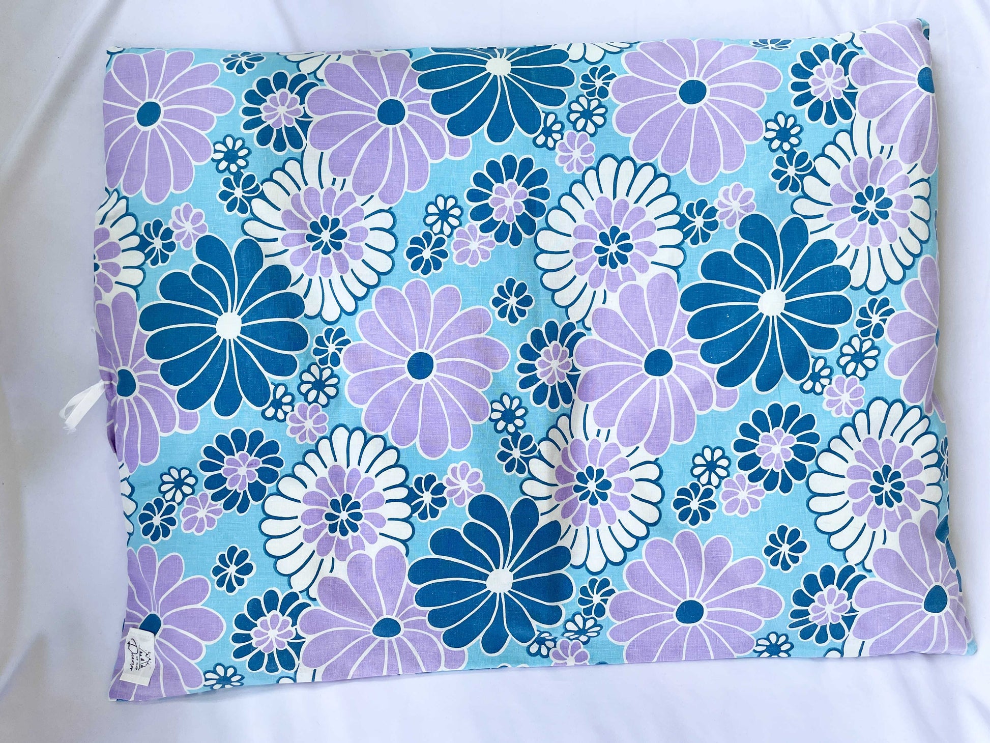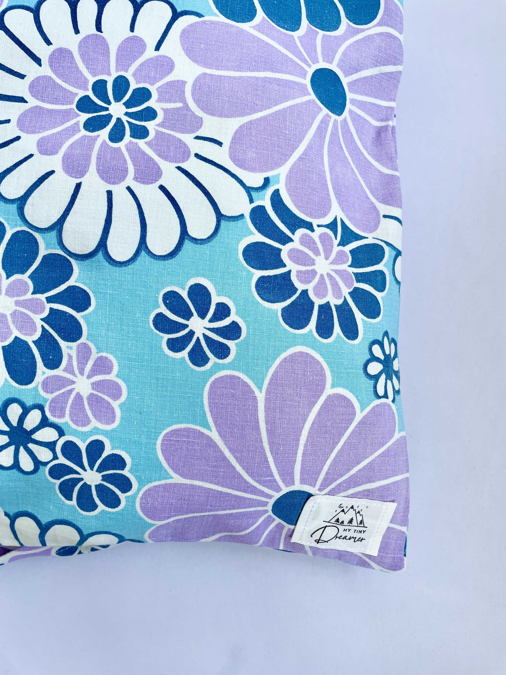 Det blødeste babydynebetræk, syet af fint blomstret retrosengetøj med blå og lilla blomster.