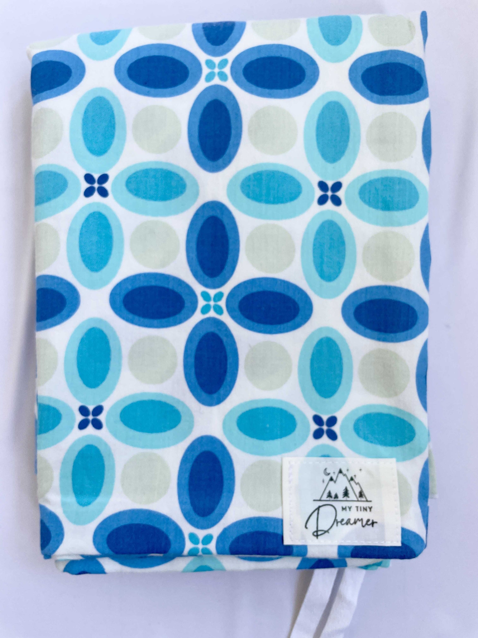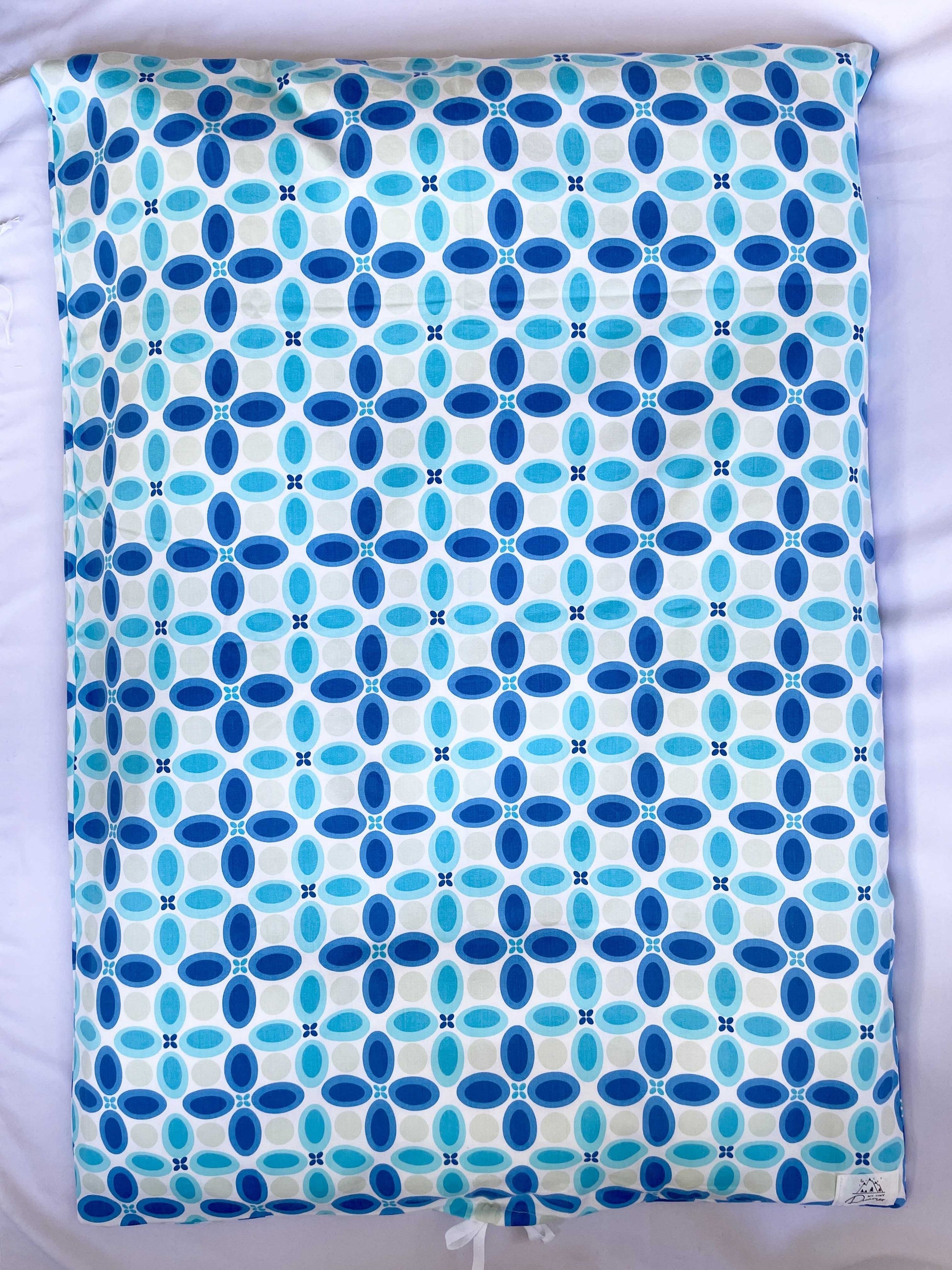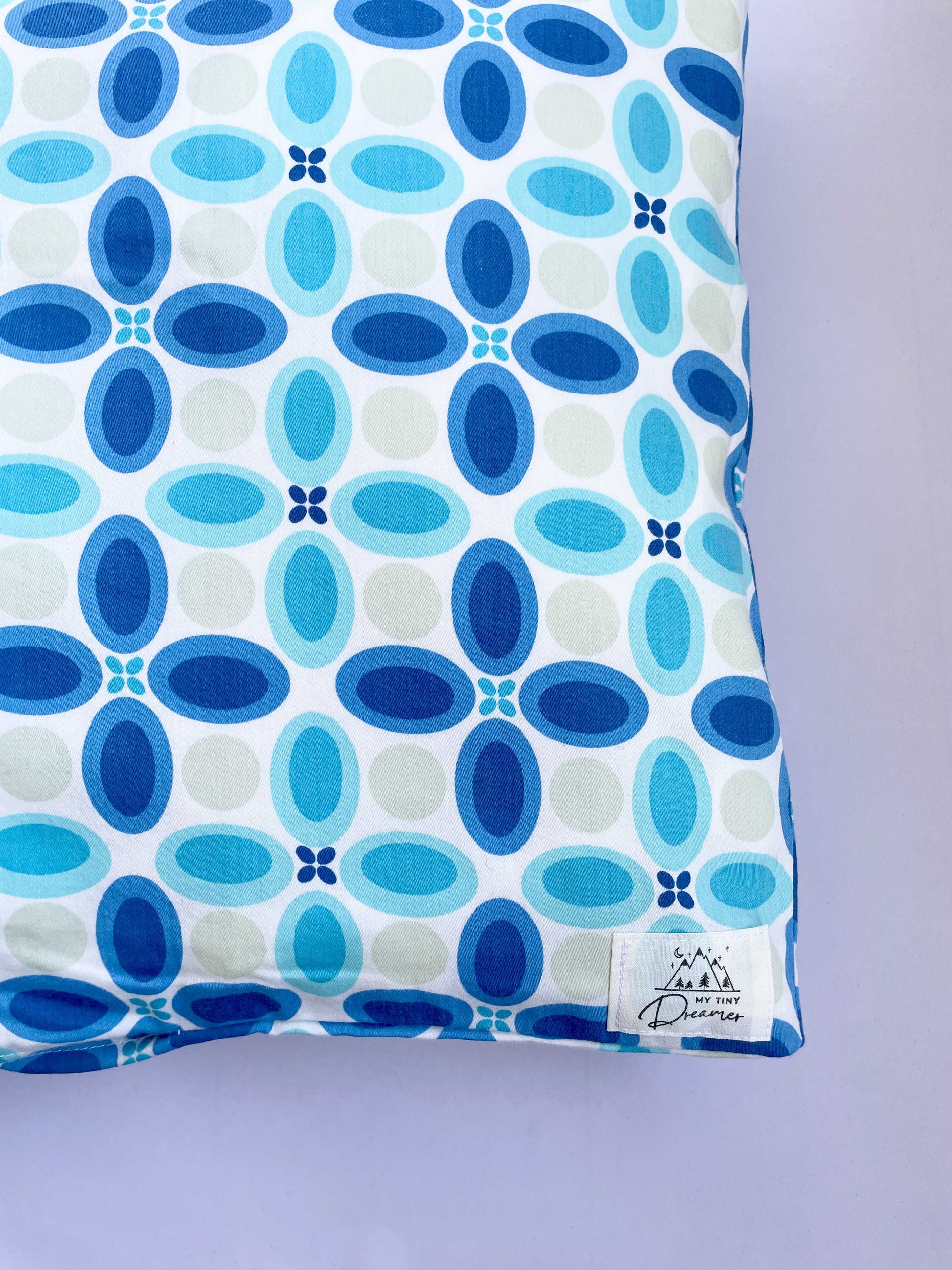 Sødt babydynebetræk syet af retrotekstiler, med det fineste grafiske mønster i blå nuancer. Blødt og lækkert at sove i.