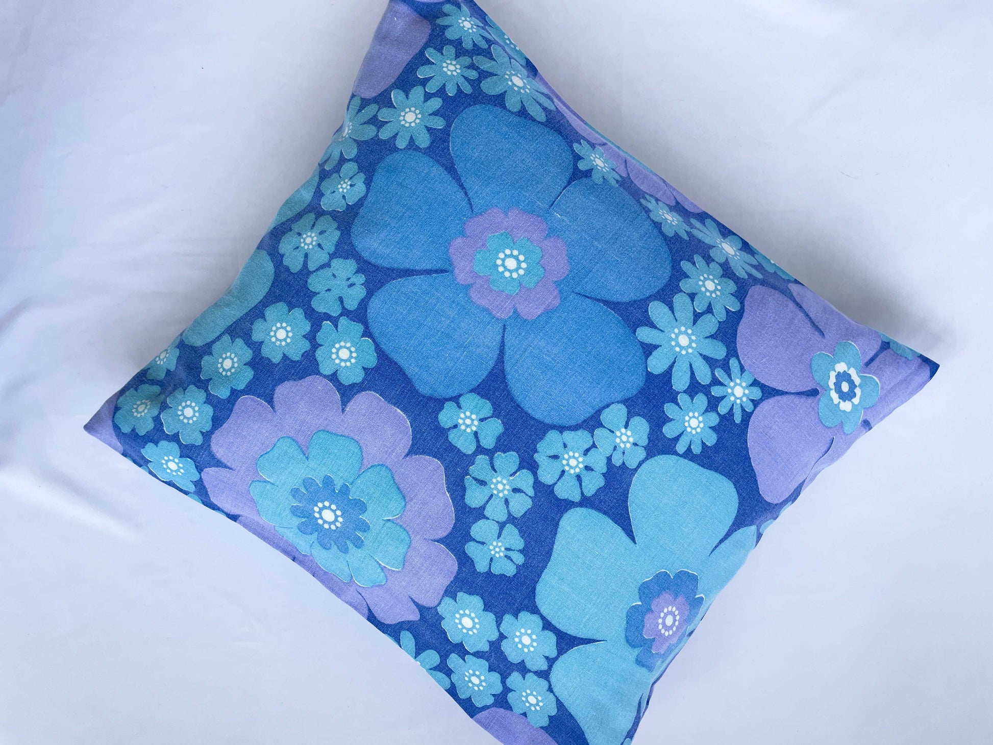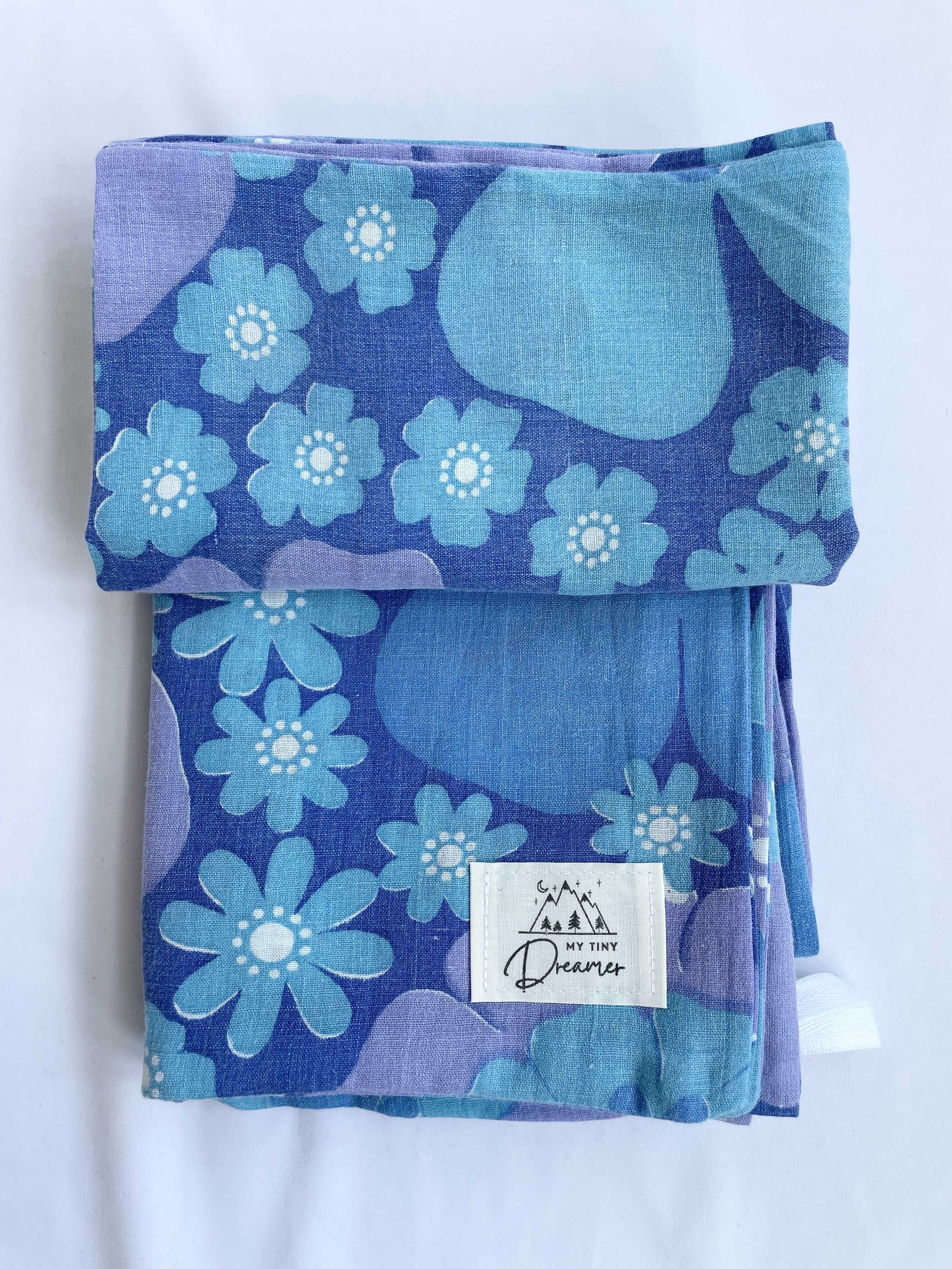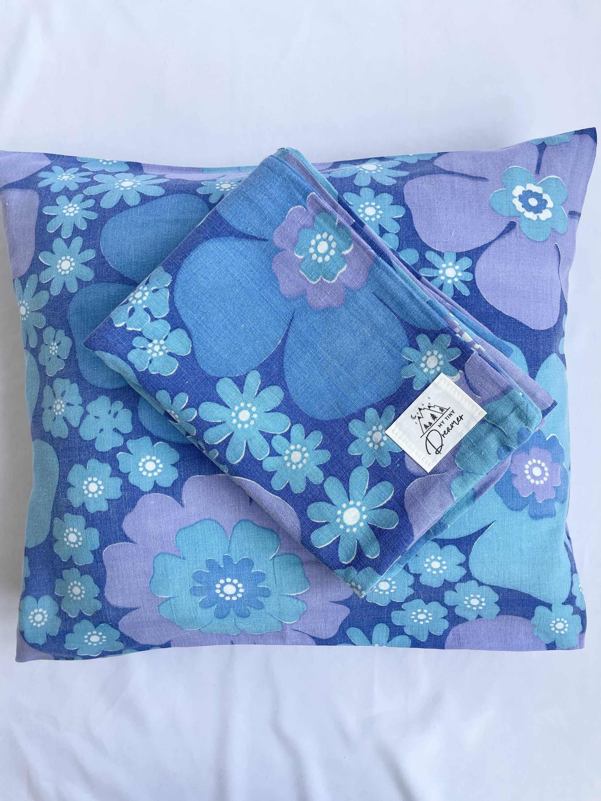 Det blødeste sæt babysengetøj i lækre farver, syet af fint blomstret sengetøj fra 70'erne med blå, og lilla blomster.