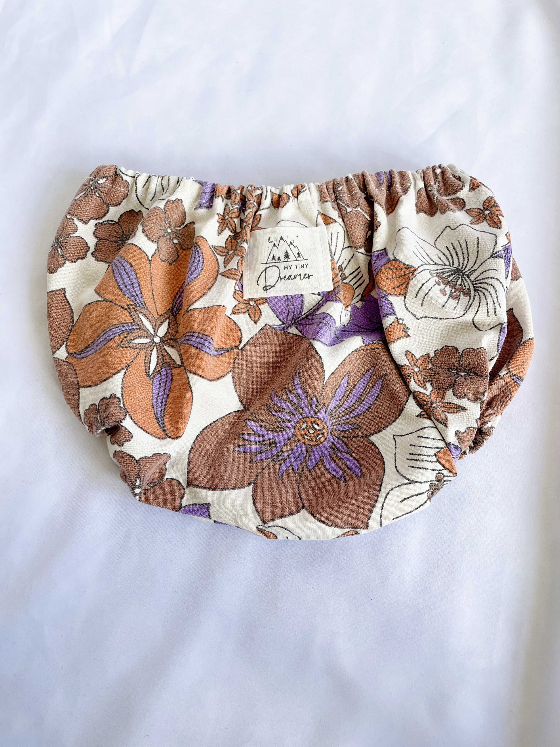 De bæredygtige bloomers er syet af smukke retrotekstiler, i vaskeægte retrofarver. Med sine orange. lilla og brune farver er der ægte 70'er nostalgi til din baby.