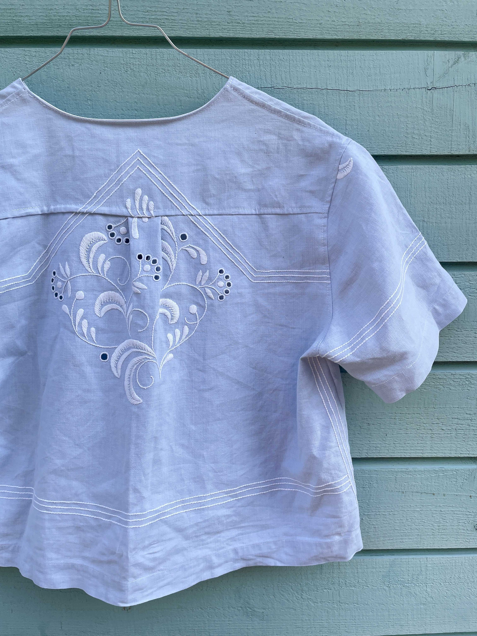 Bluse af den lækreste blågrå dug med smukke hvide broderier. Blusen lukkes med tre hvide trykknapper. Blusen er let og behagelig at have på.