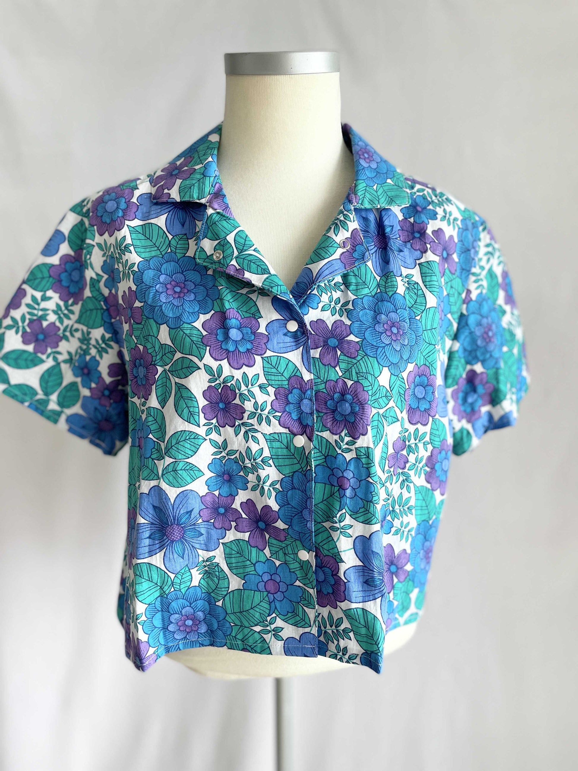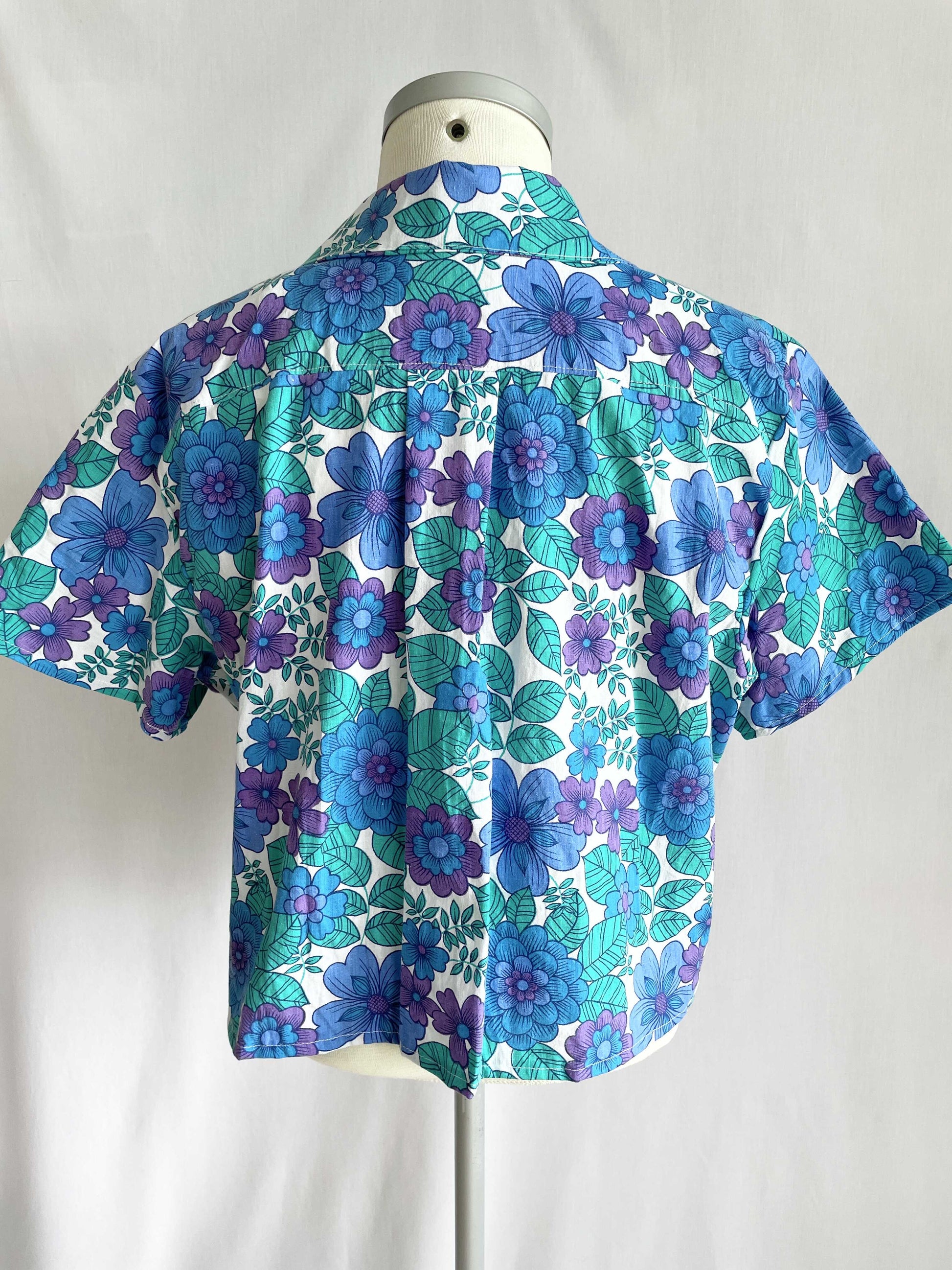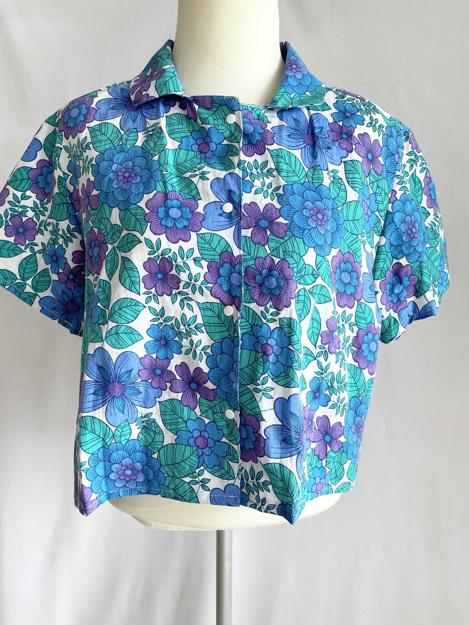 Bluse i det fineste mønster med blå, lilla og grønne blomster i ubrugt sengetøj fra 70'erne. Blusen lukkes med hvide trykknapper.