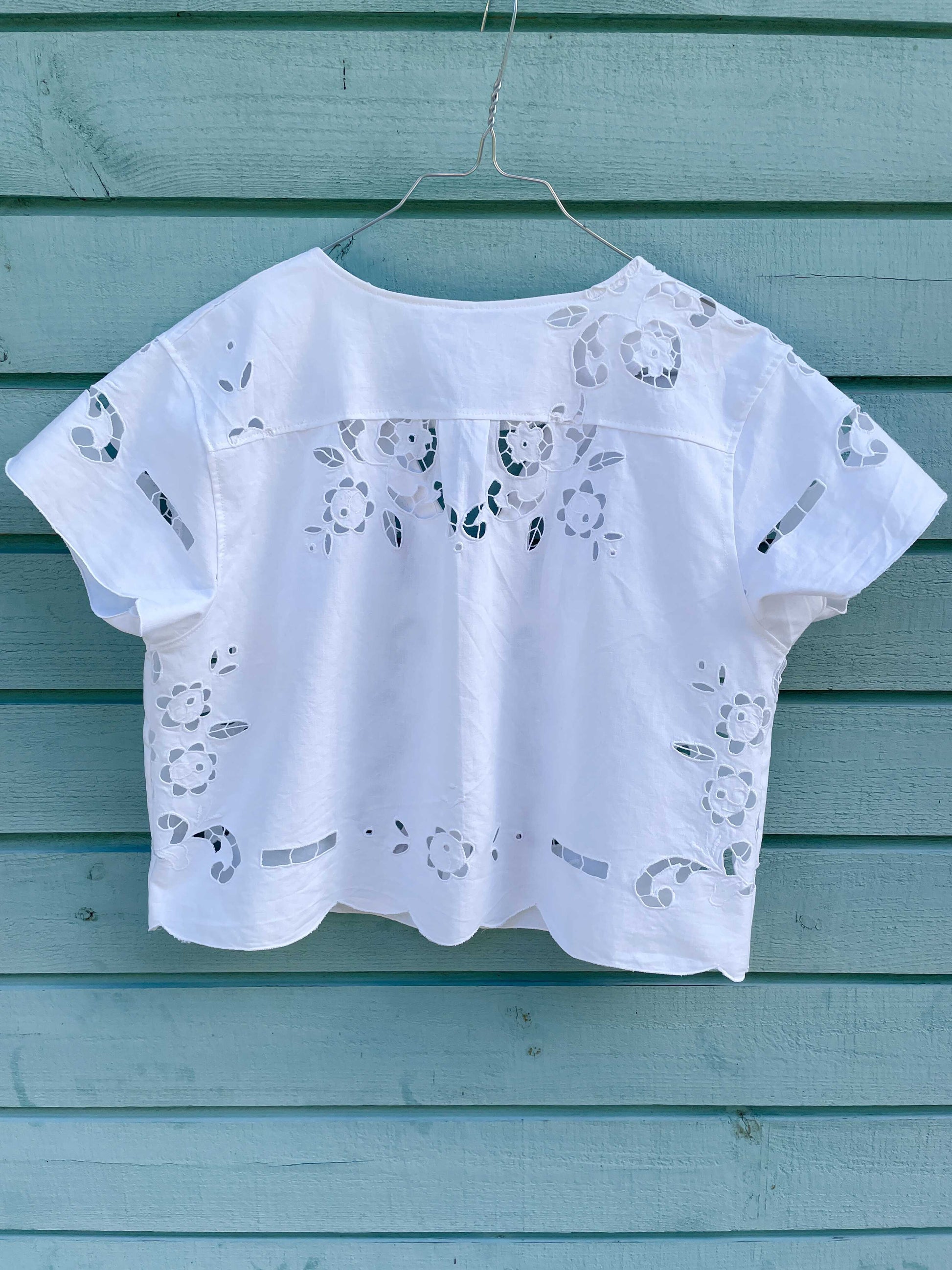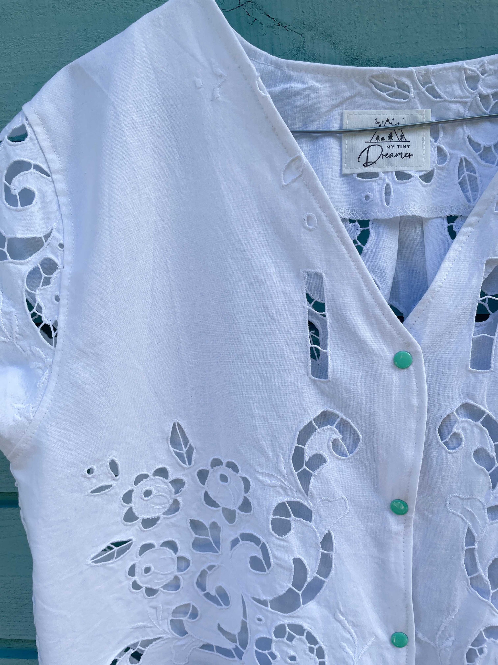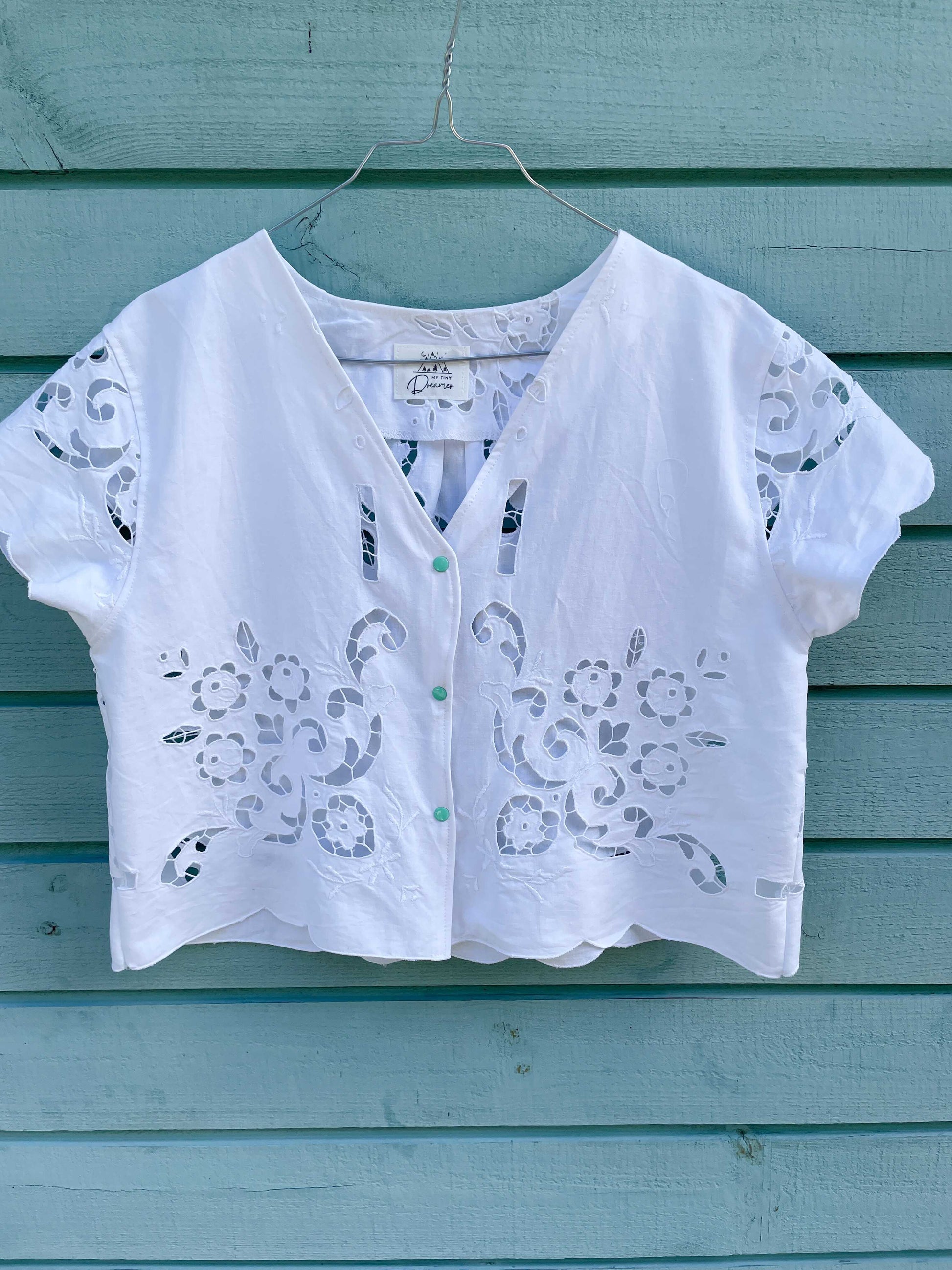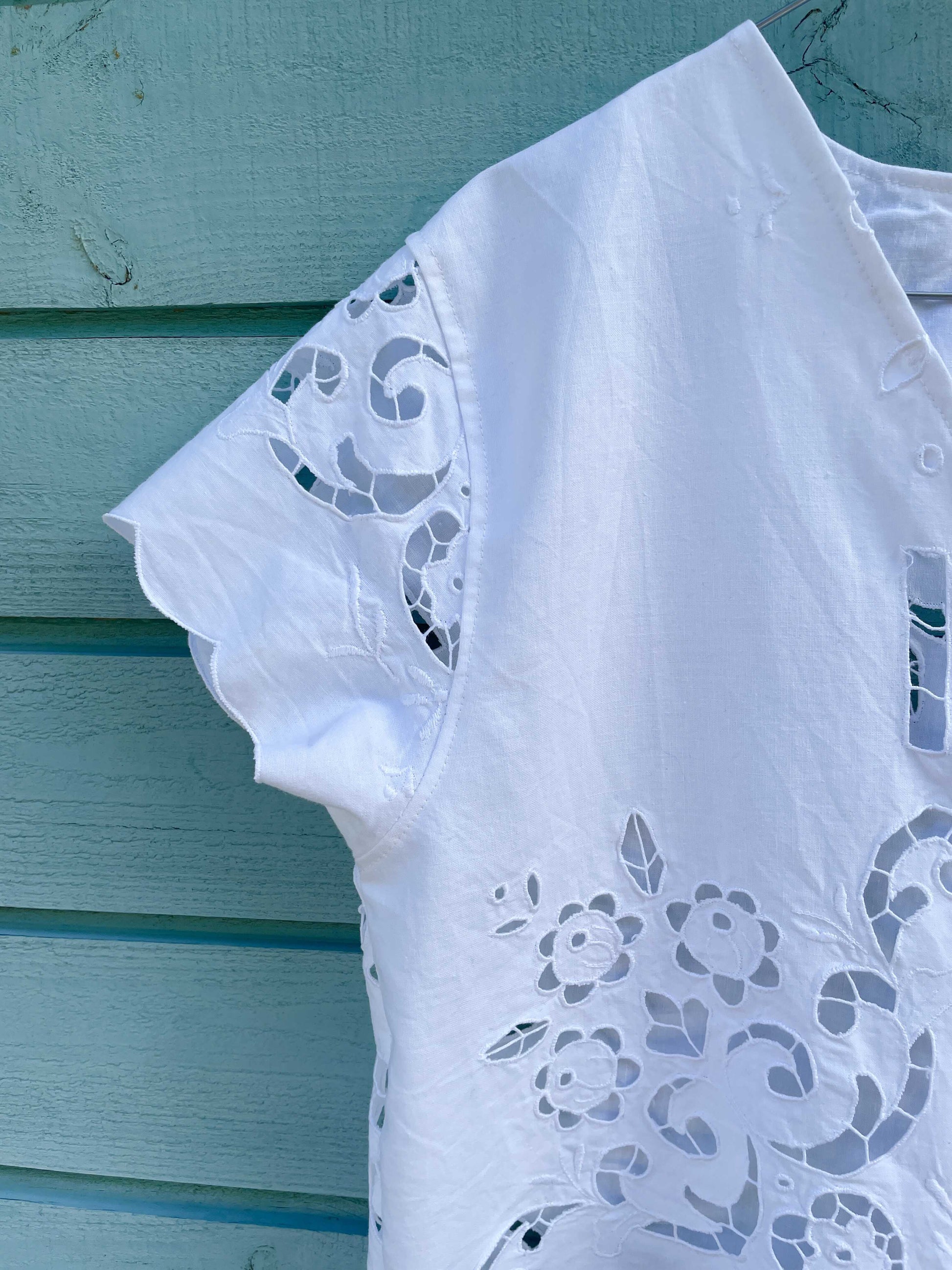 Lækker hvid bluse af en smuk kaffedug med hvidt hulbroderi. Blusen lukkes med tre trykknapper. Blusen er let og luftig at have på.