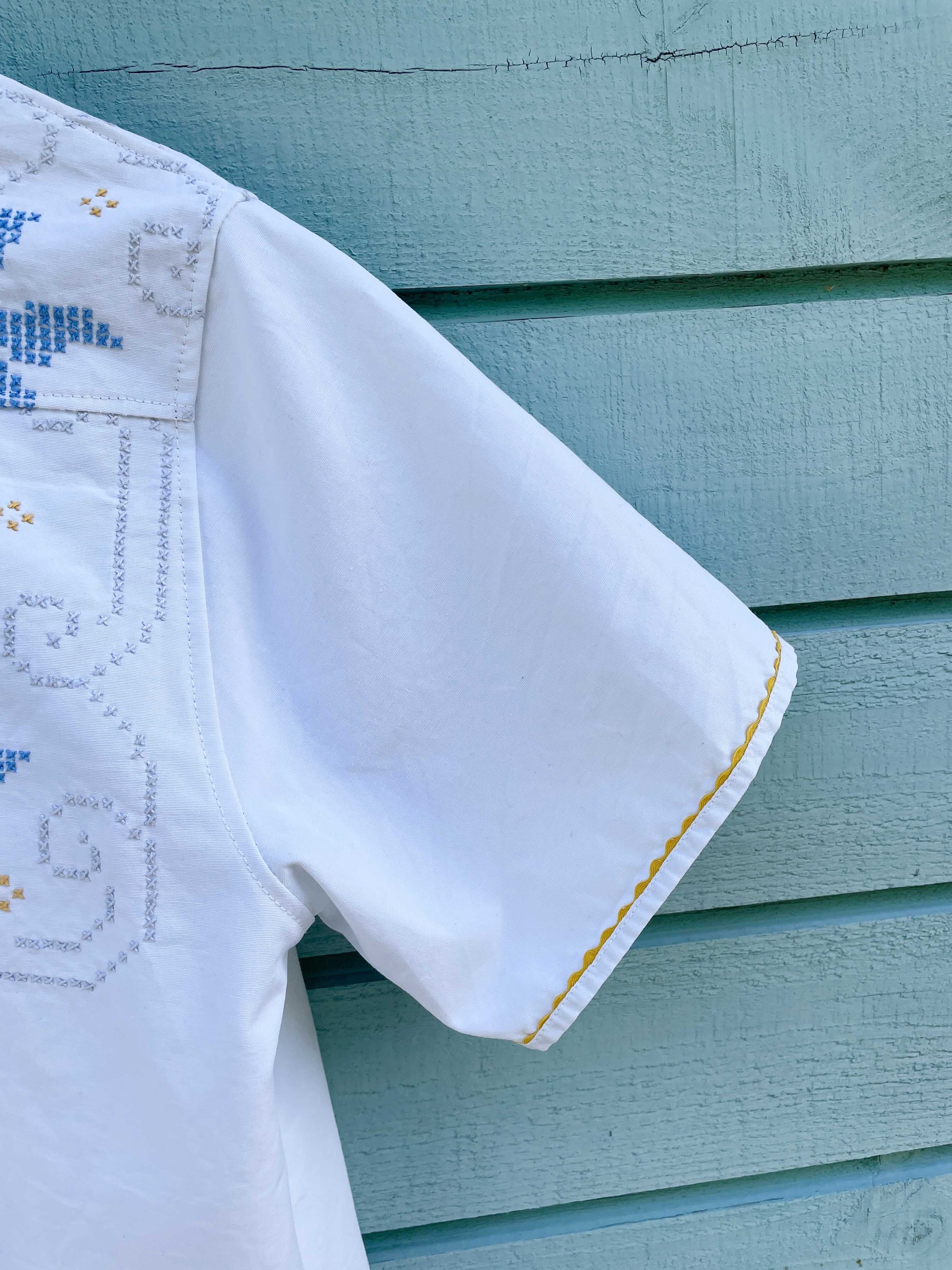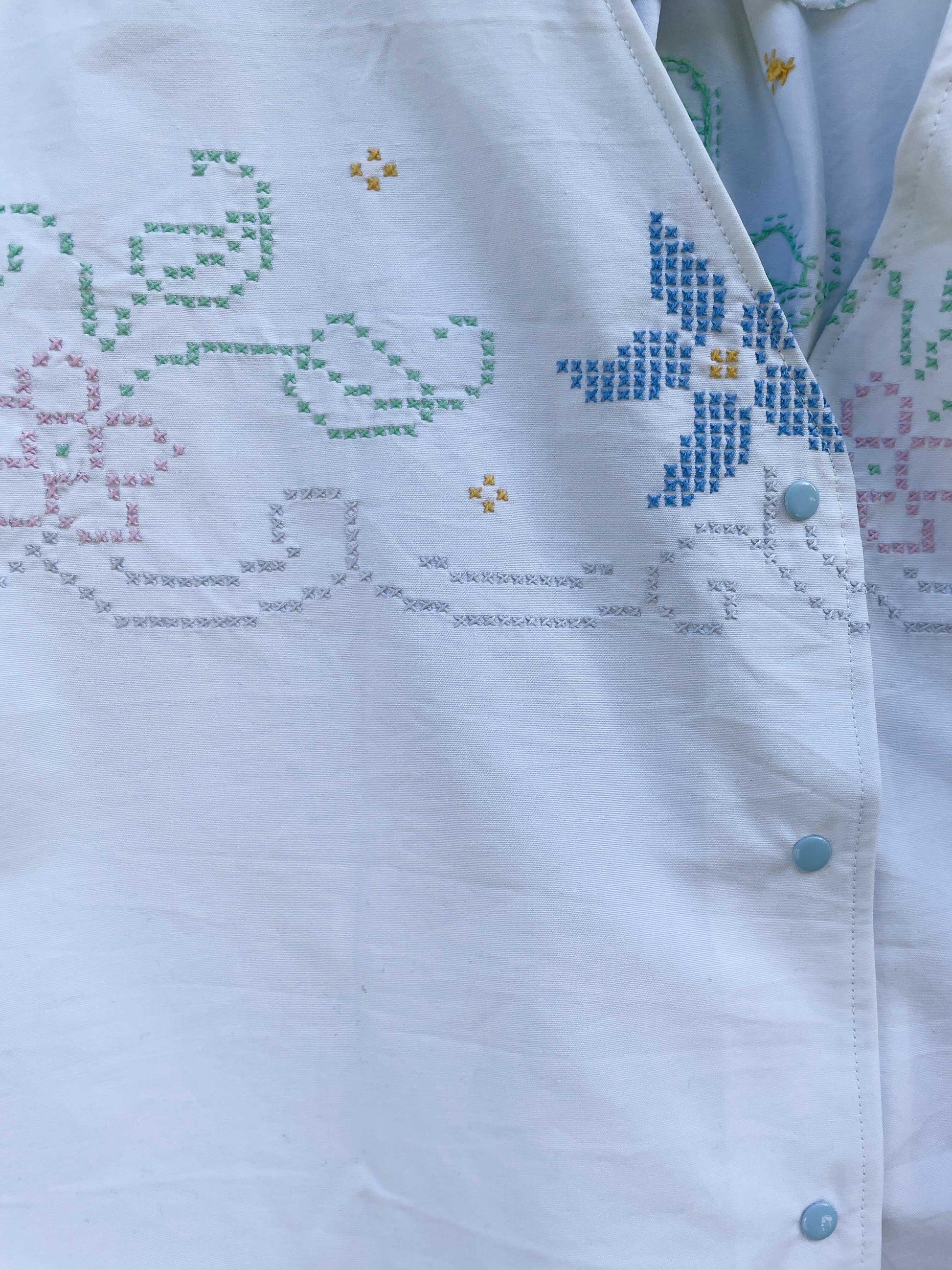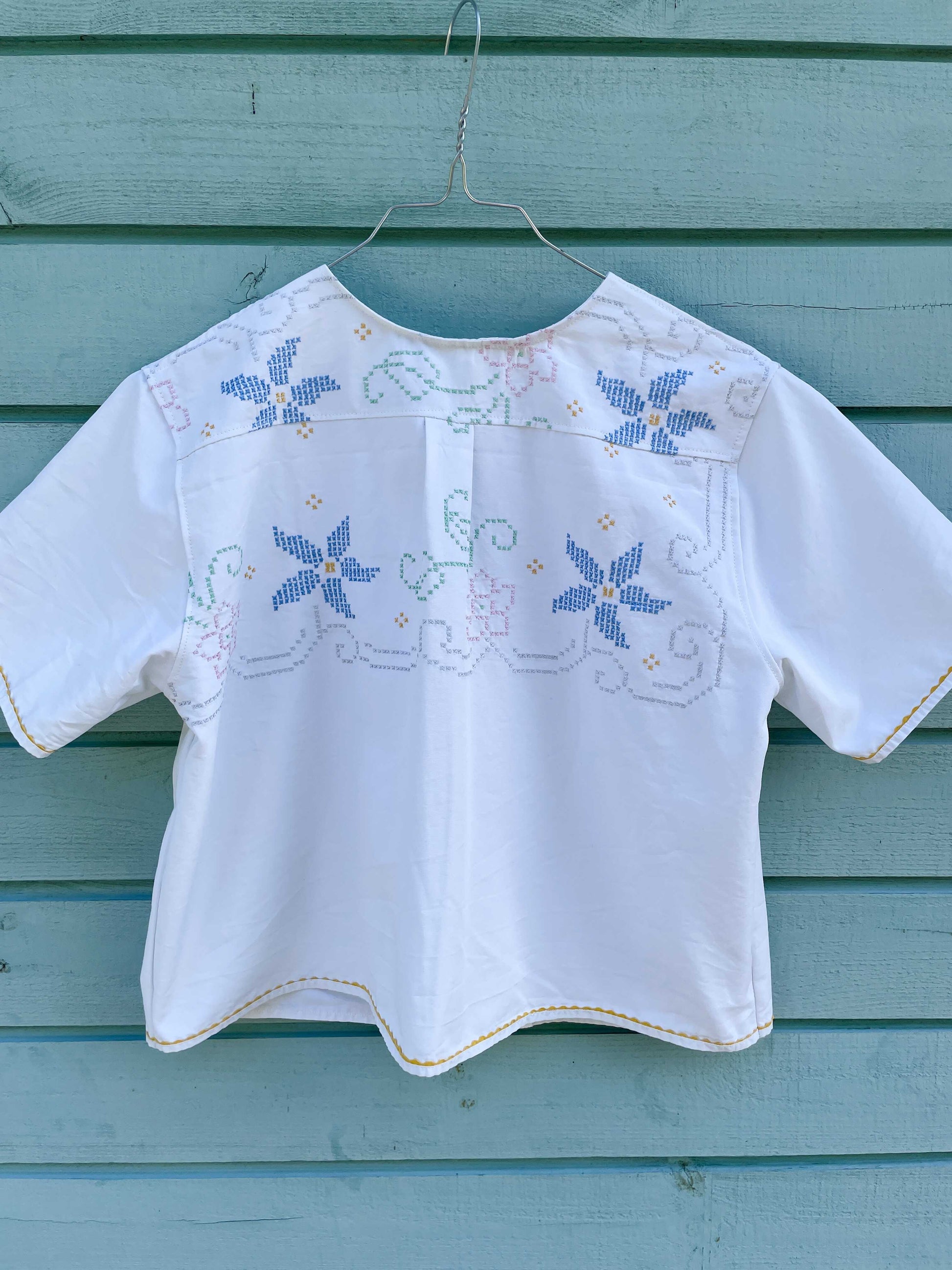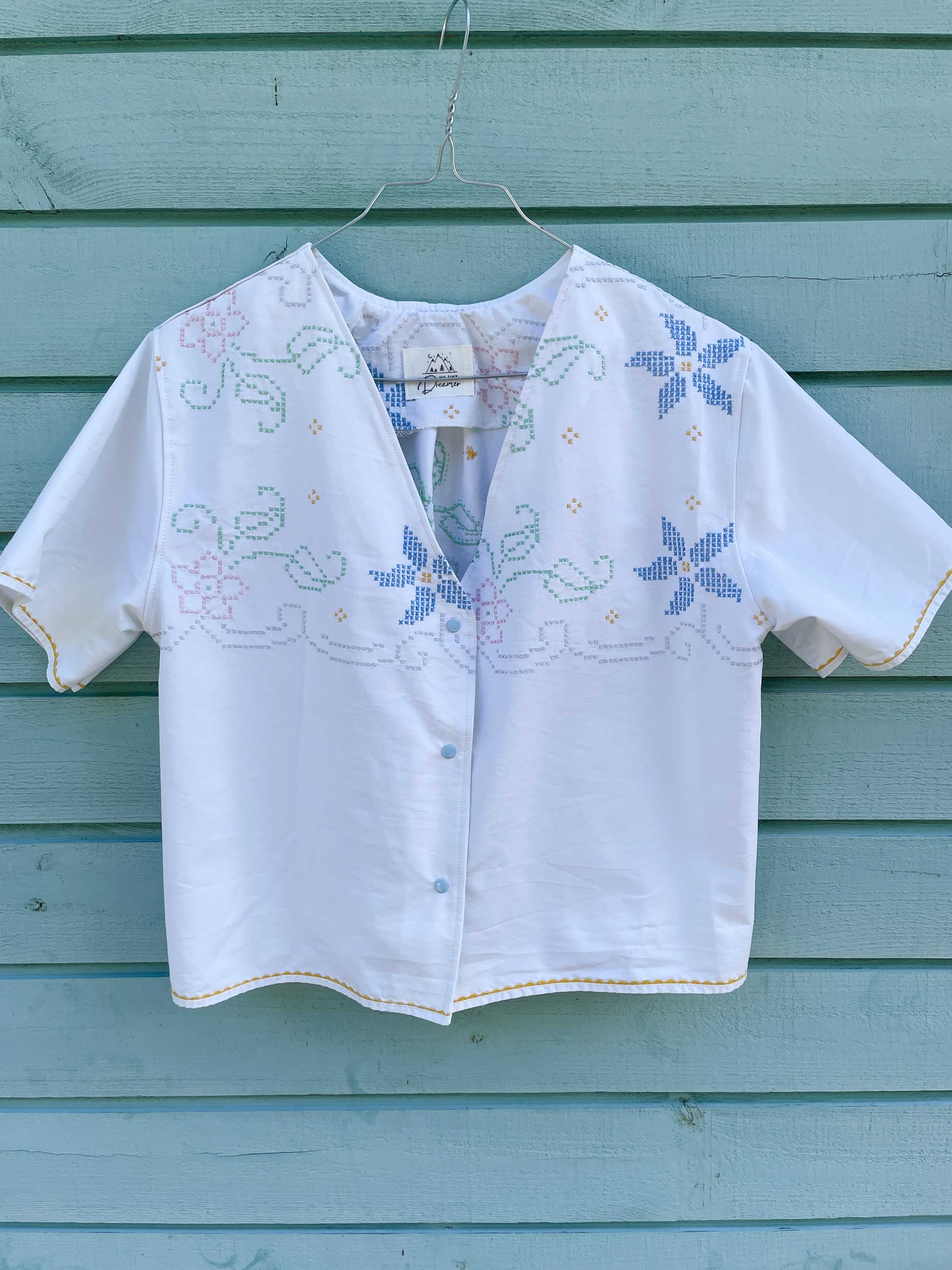 Bluse af den smukkeste broderede dug. Farven er en knækket hvid med korsstingsbroderi i blå, lyserød, grøn og grå. Blusen lukkes med tre trykknapper.