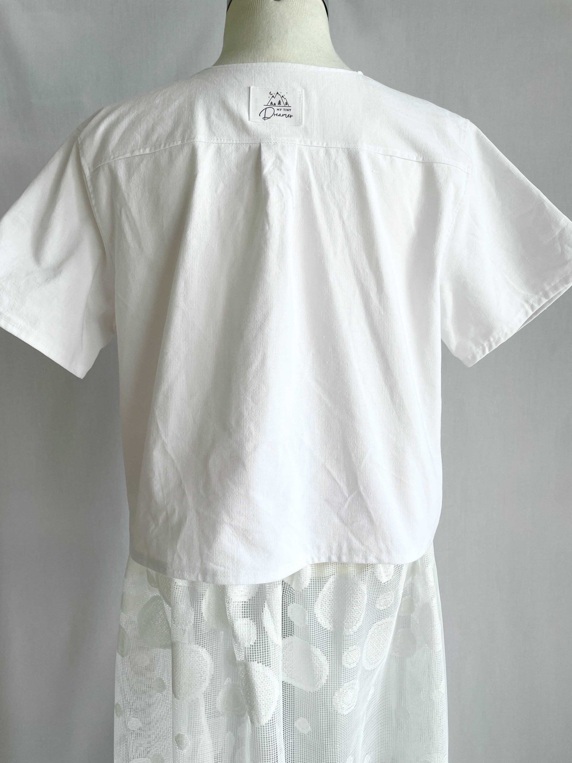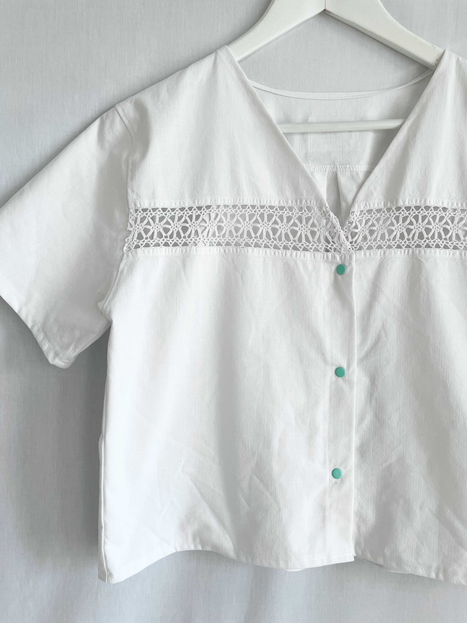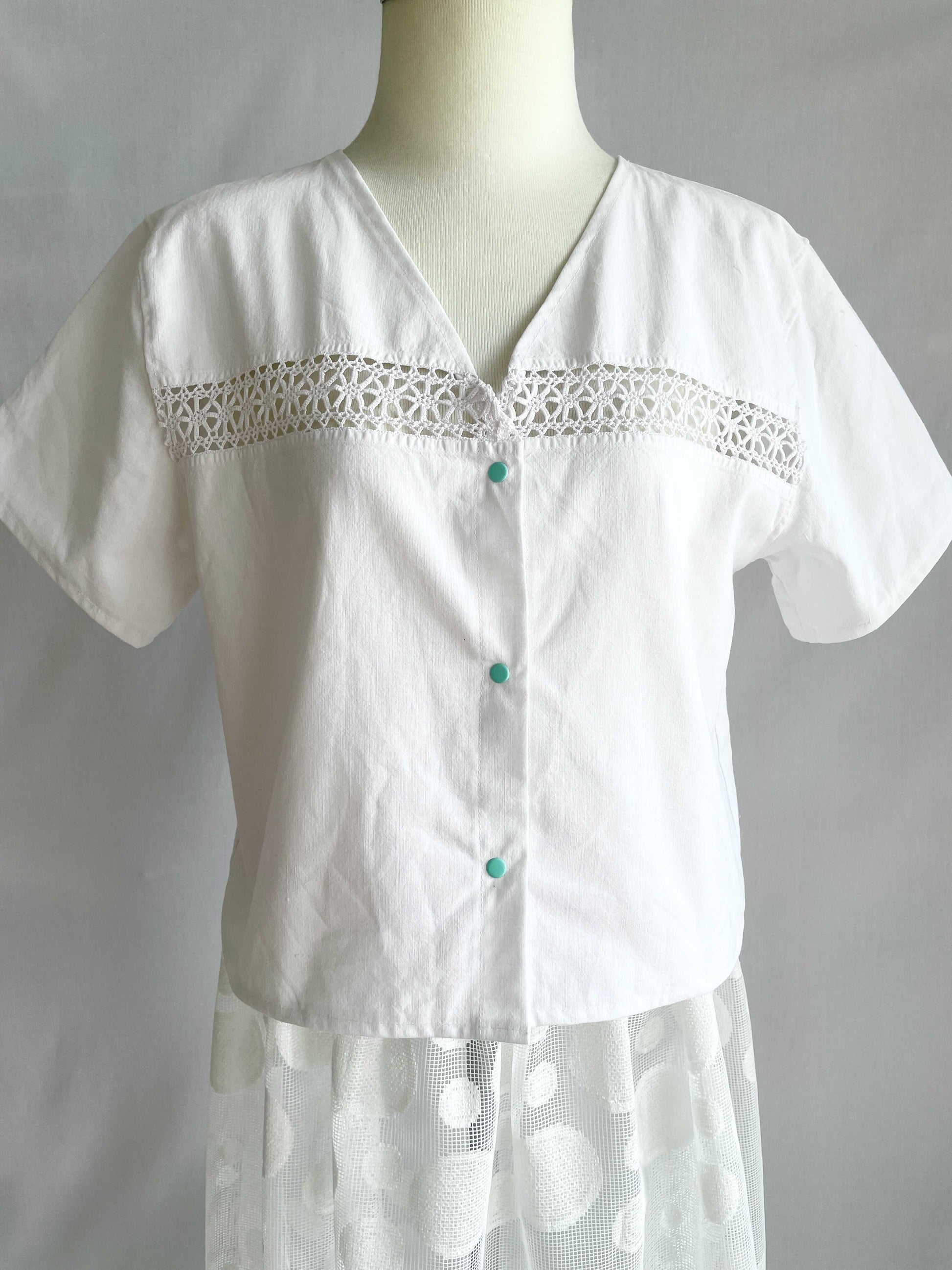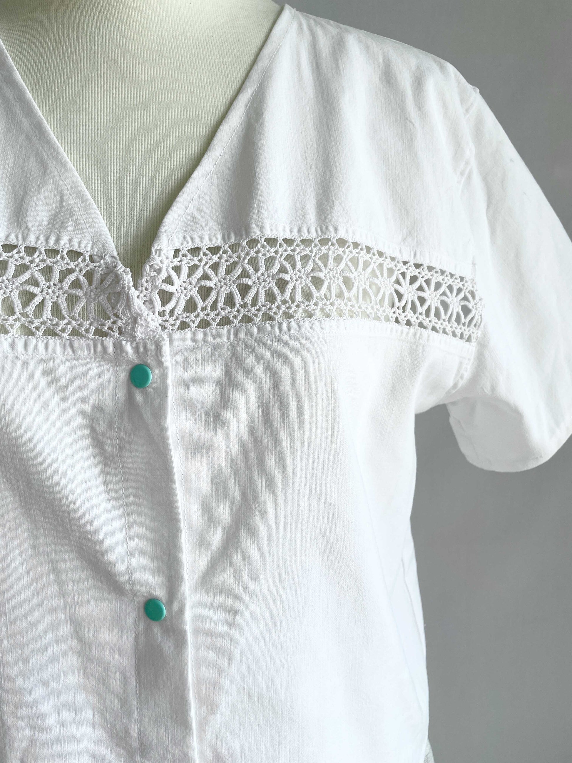 Lækker hvid bluse af et fint pudebetræk med mellemværk. Blusen lukkes med tre turkise trykknapper. Blusen er blød og behagelig at have på.