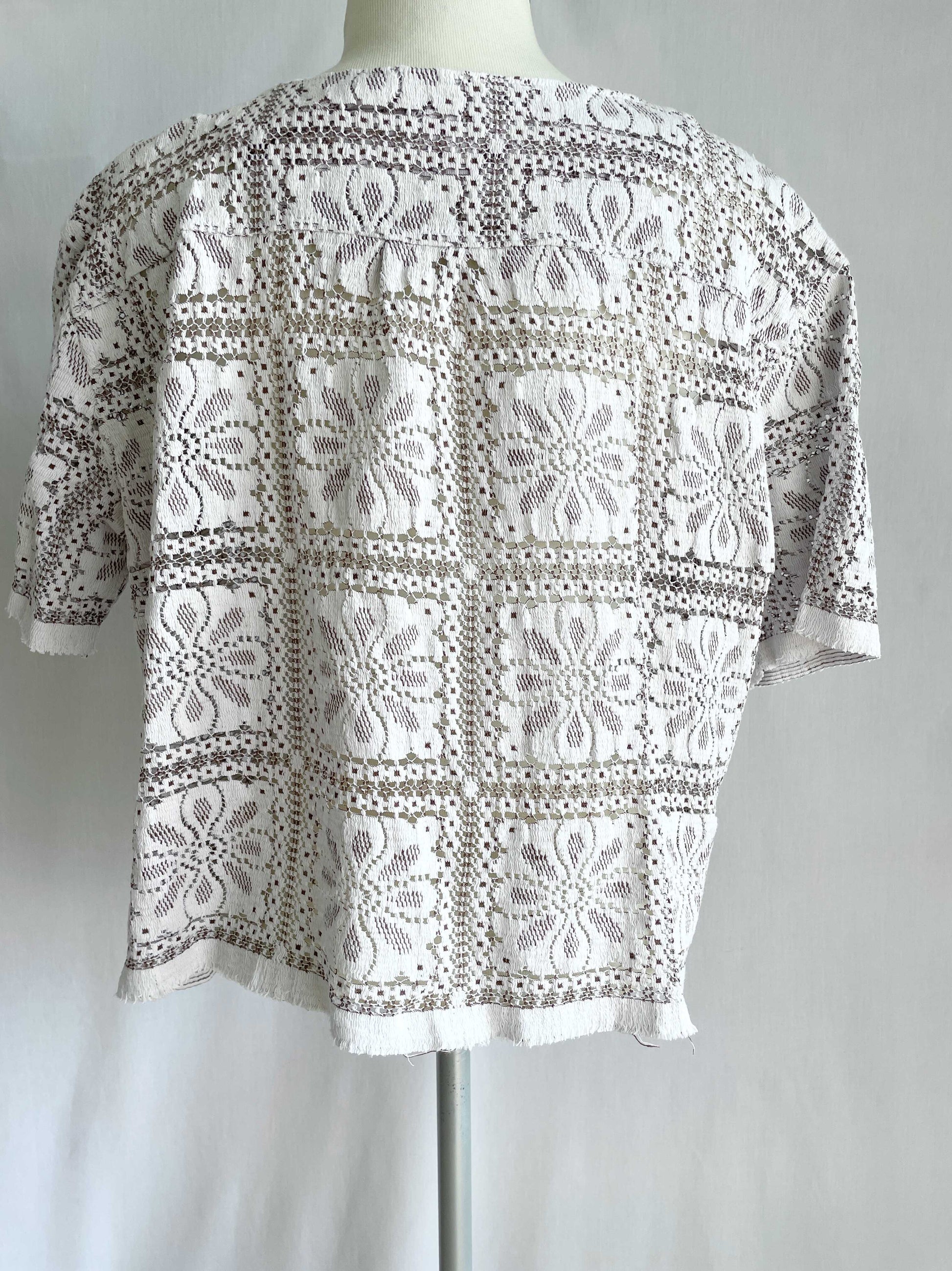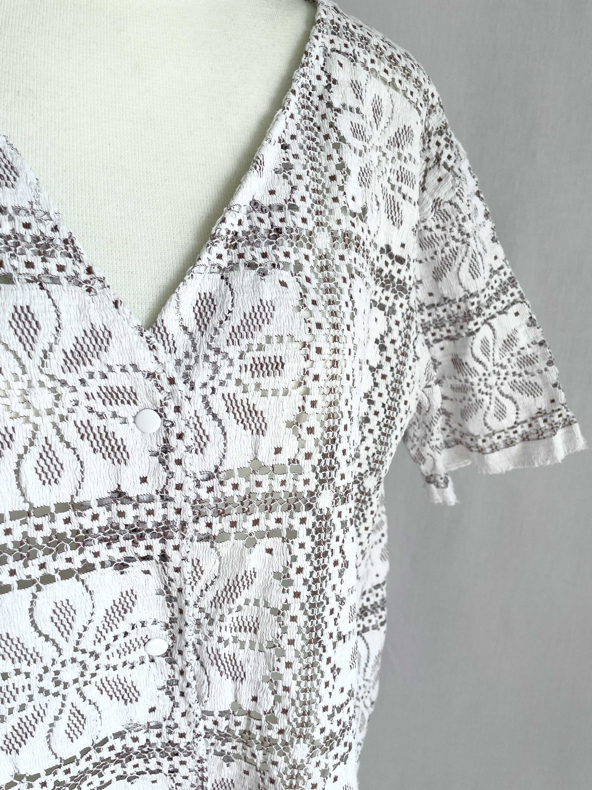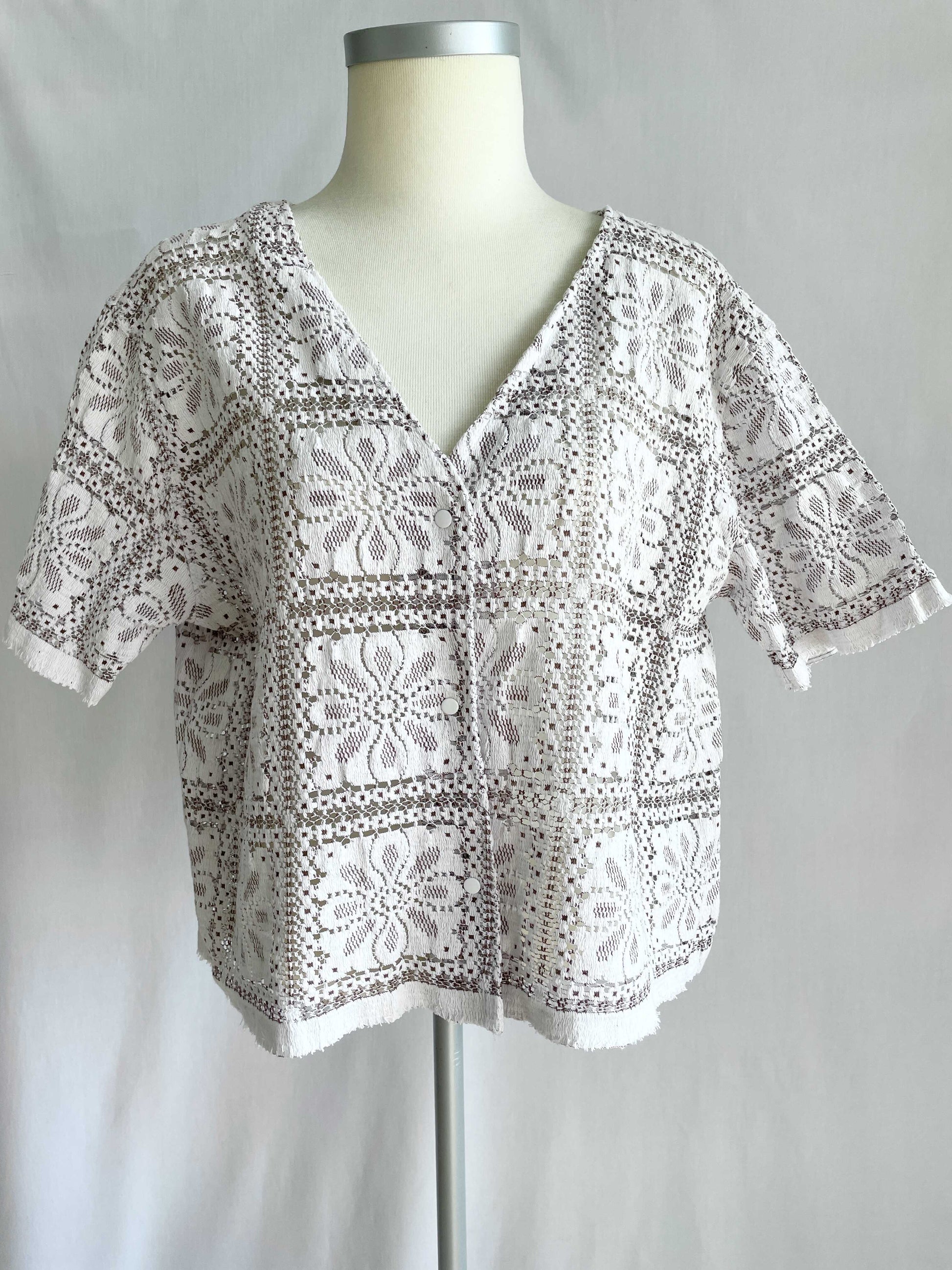 Bluse af lækker dug i hvid og brun. Blusen lukkes med tre hvide trykknapper. Den er let gennemsigtig.