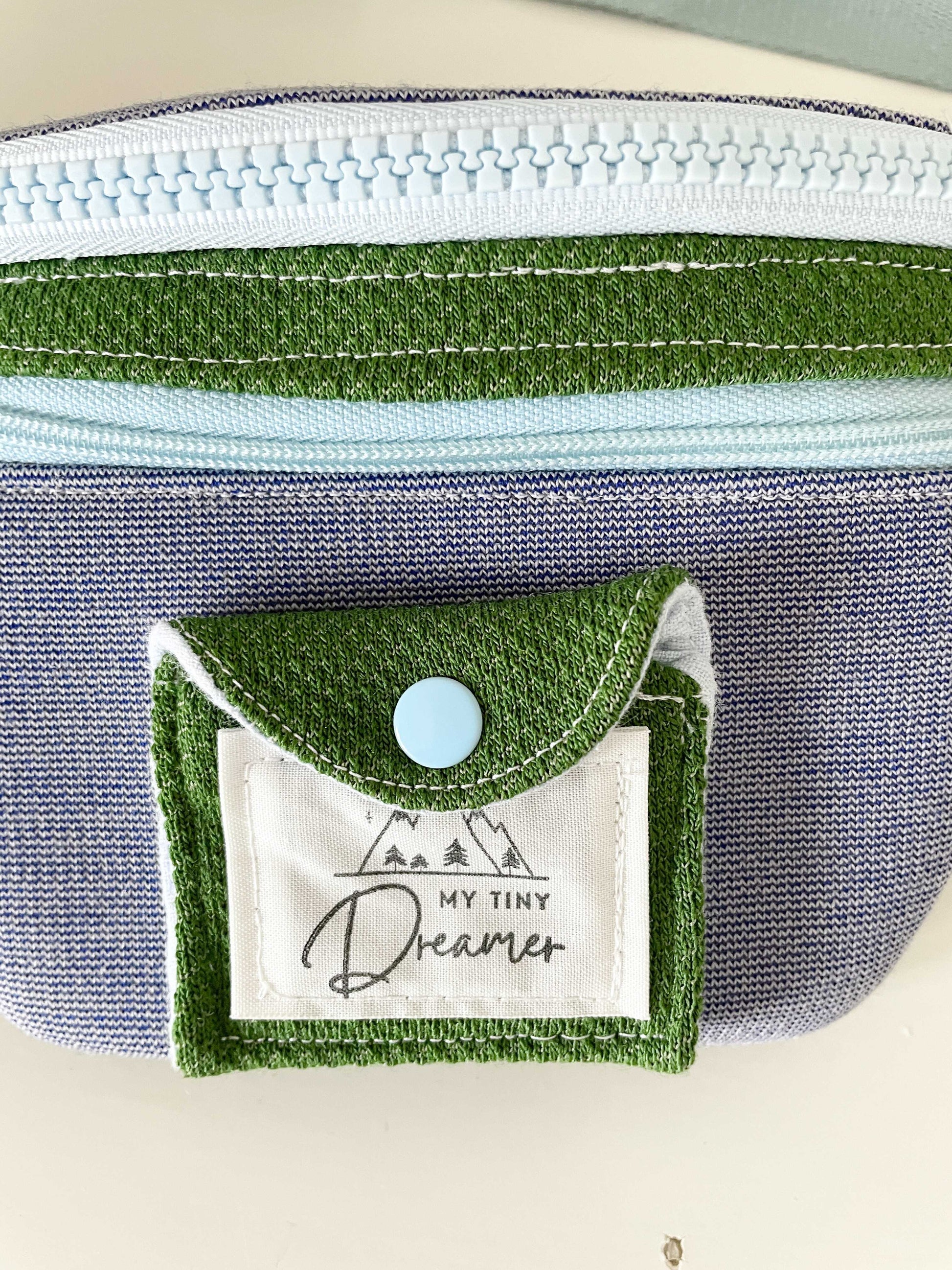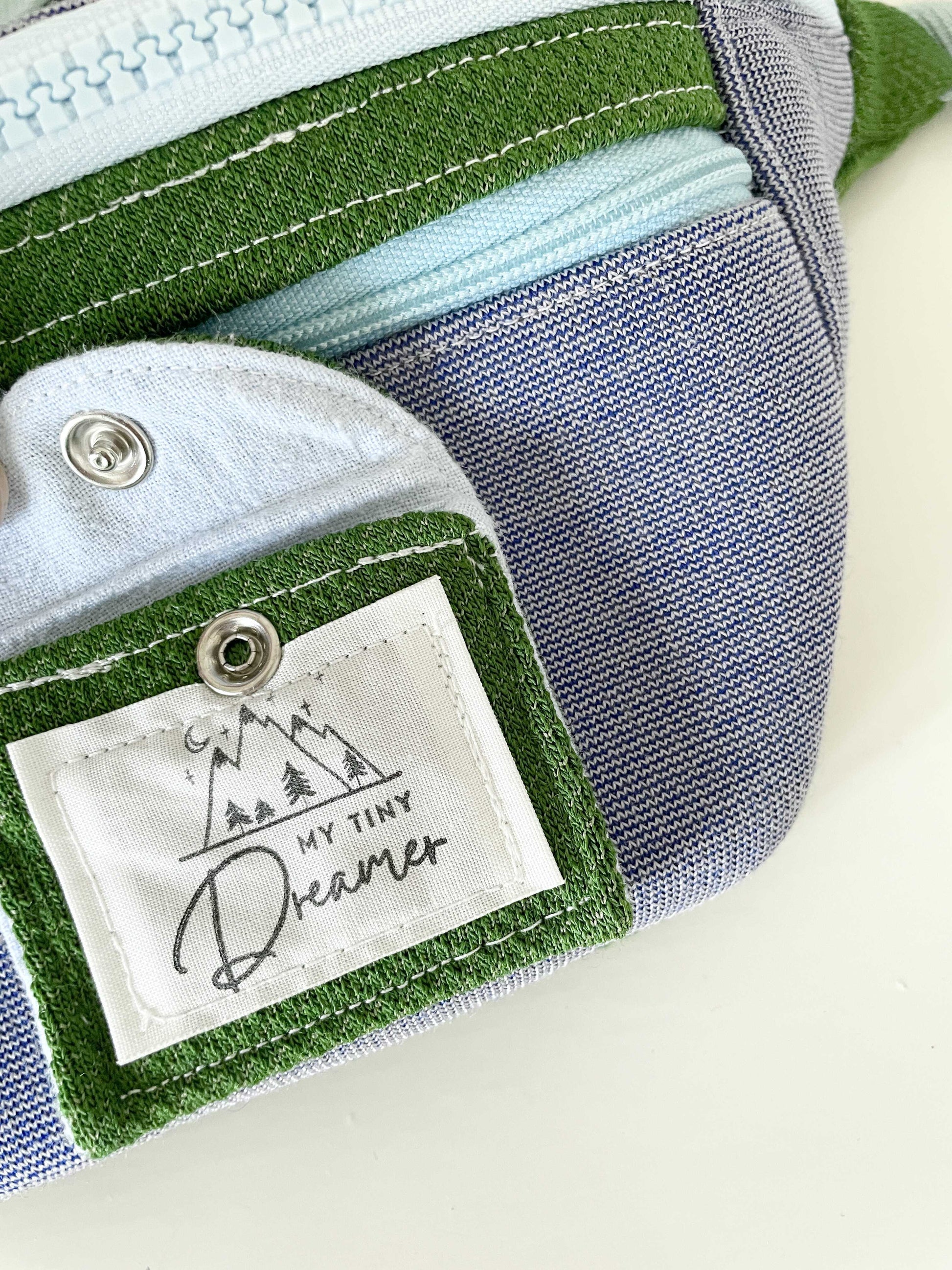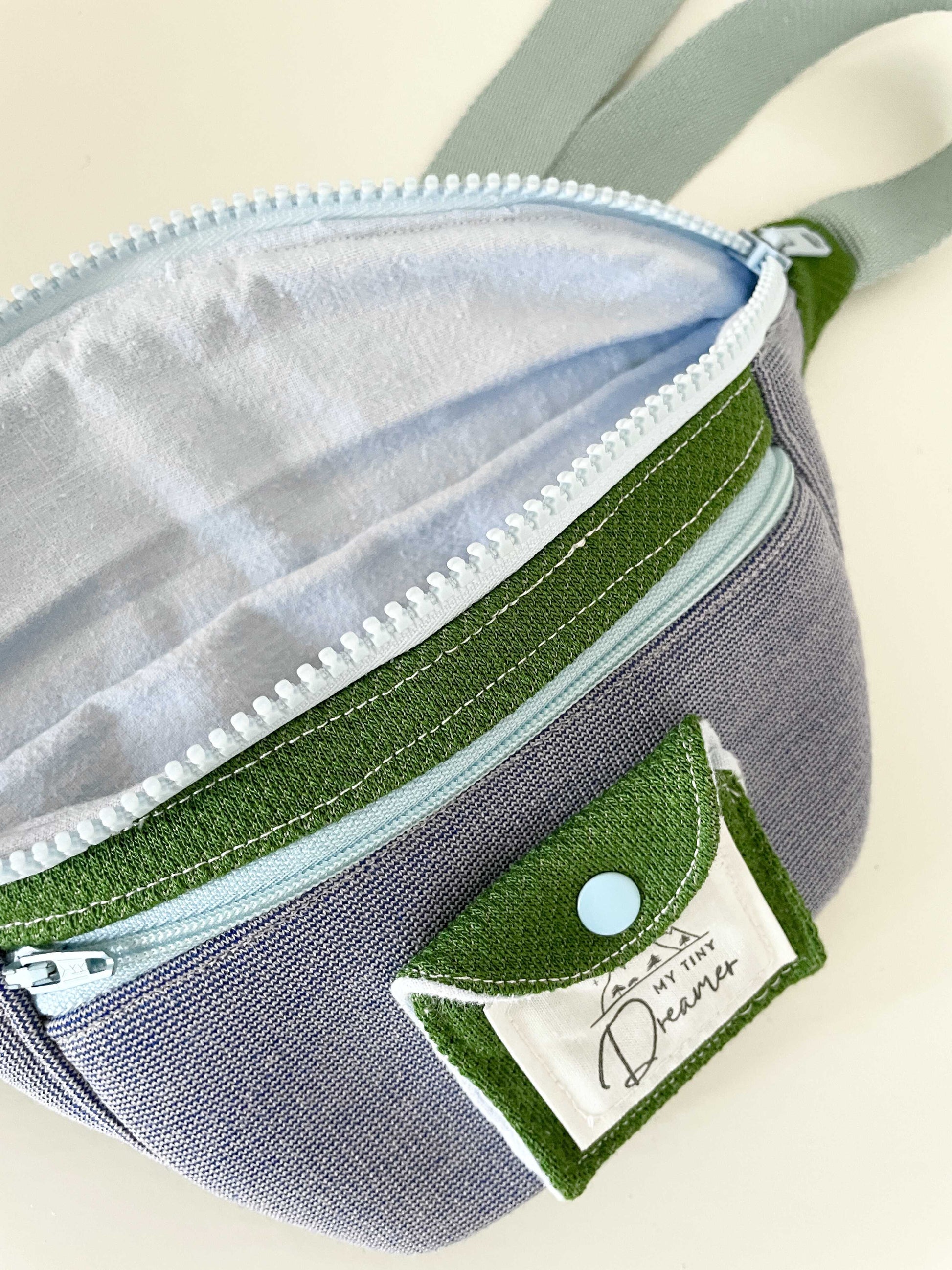 Bumbag syet af de lækreste overskudsmaterialer fra Aarhus møbelpolstrer. I blå og grøn med genanvendte lynlåse i blå nuancer. Bæltetasken har et stort rum og et mindre rum med lynlås samt en lille grøn lomme foran der lukkes med trykknap, med et lille hemmeligt rum bagved. Foret er syet af et lyseblåt lagen og remmen er justerbar.