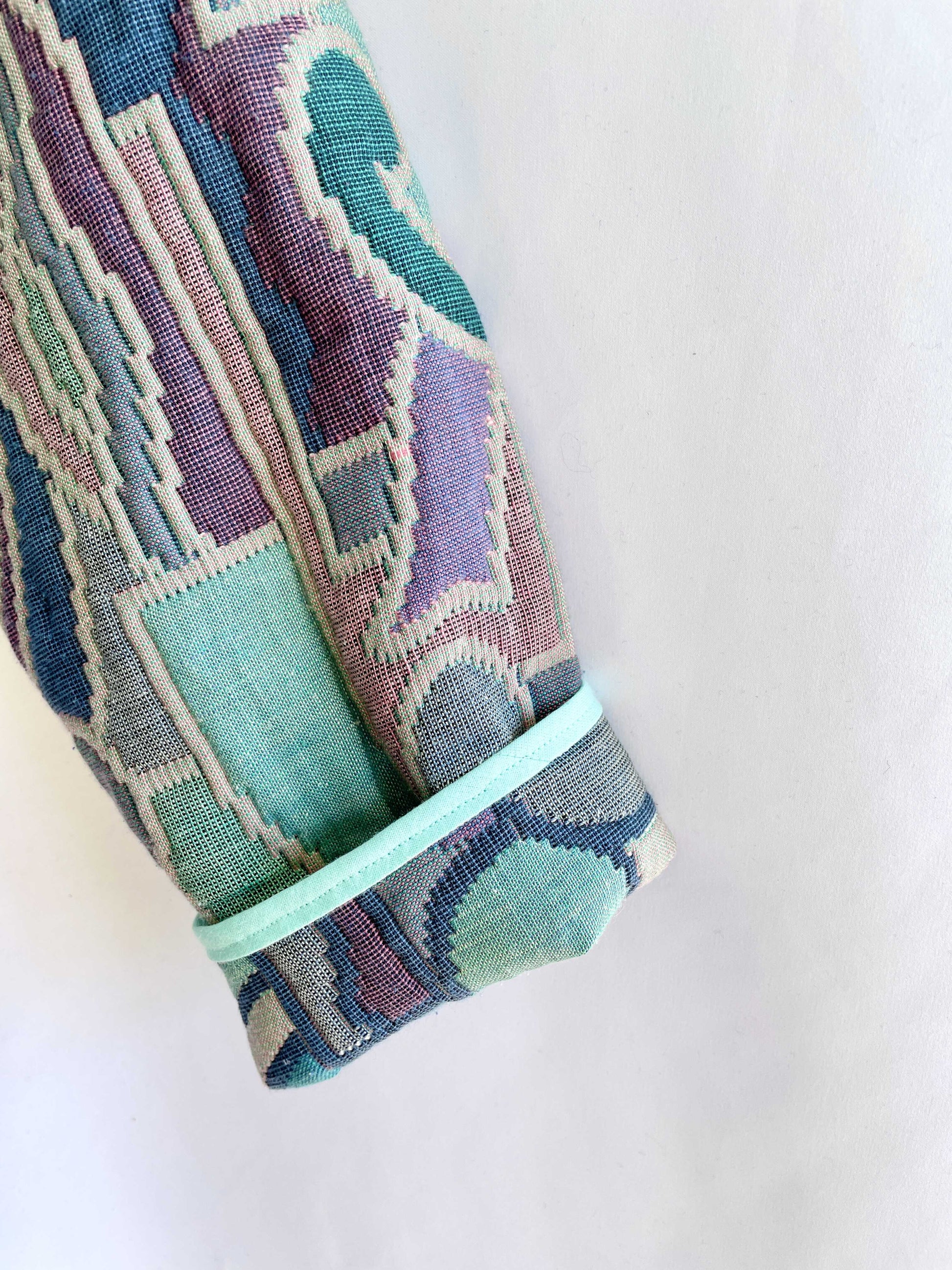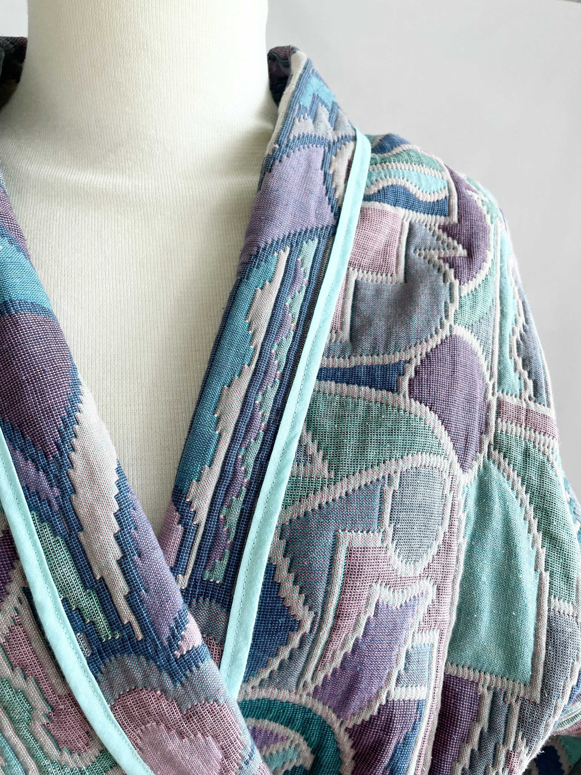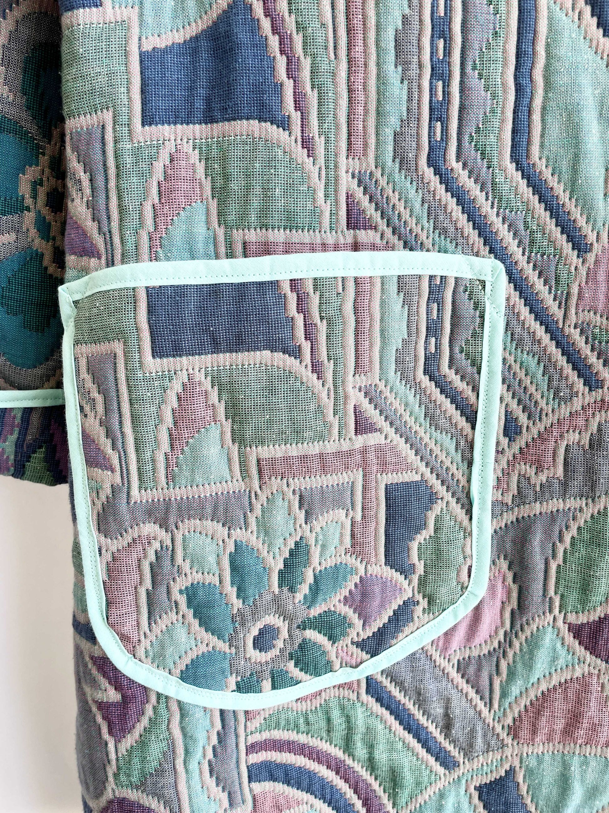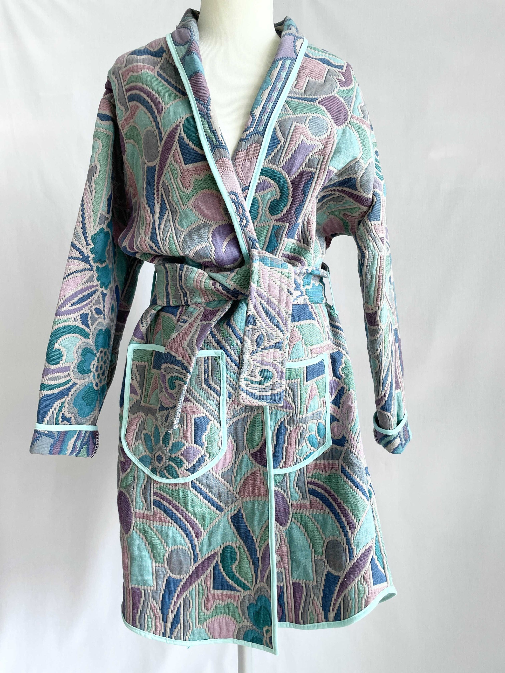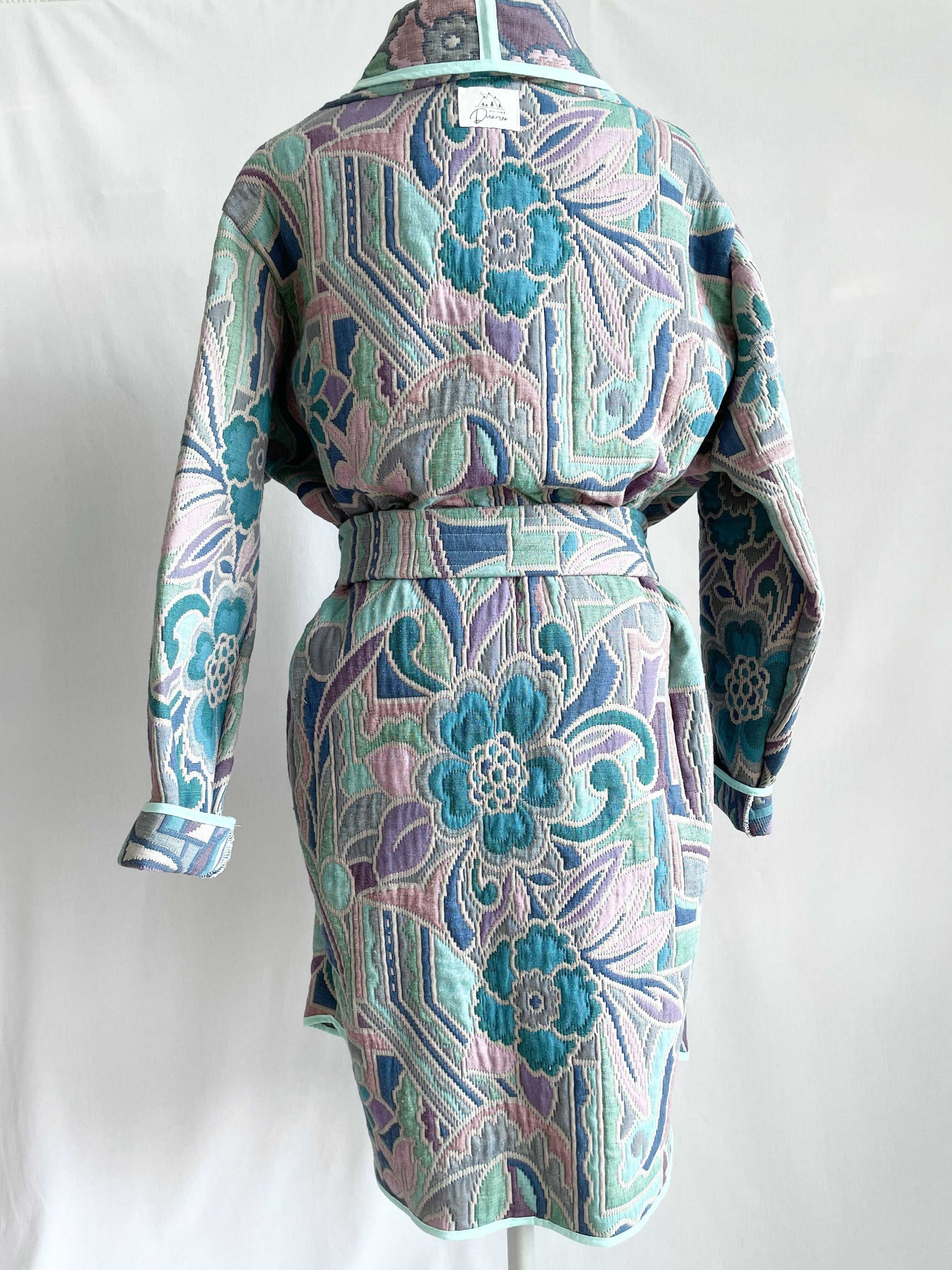 Super lækker unik frakke syet af det fineste sengetæppe med smukt mønster i lækre grønne nuancer. Frakken har Kimonosnit og lukkes med bindebånd i taljen. Jakken har en virkelig lækker tyngde, der gør at den er meget rar at have på, den let vatteret og helt perfekt som både forårs-, sommer- og efterårsjakke. Den har praktiske lommer, der også pynter, så du altid har et sted til dine ting og dine hænder. Frakken er afsluttet med turkis kantebånd for en smuk finish.