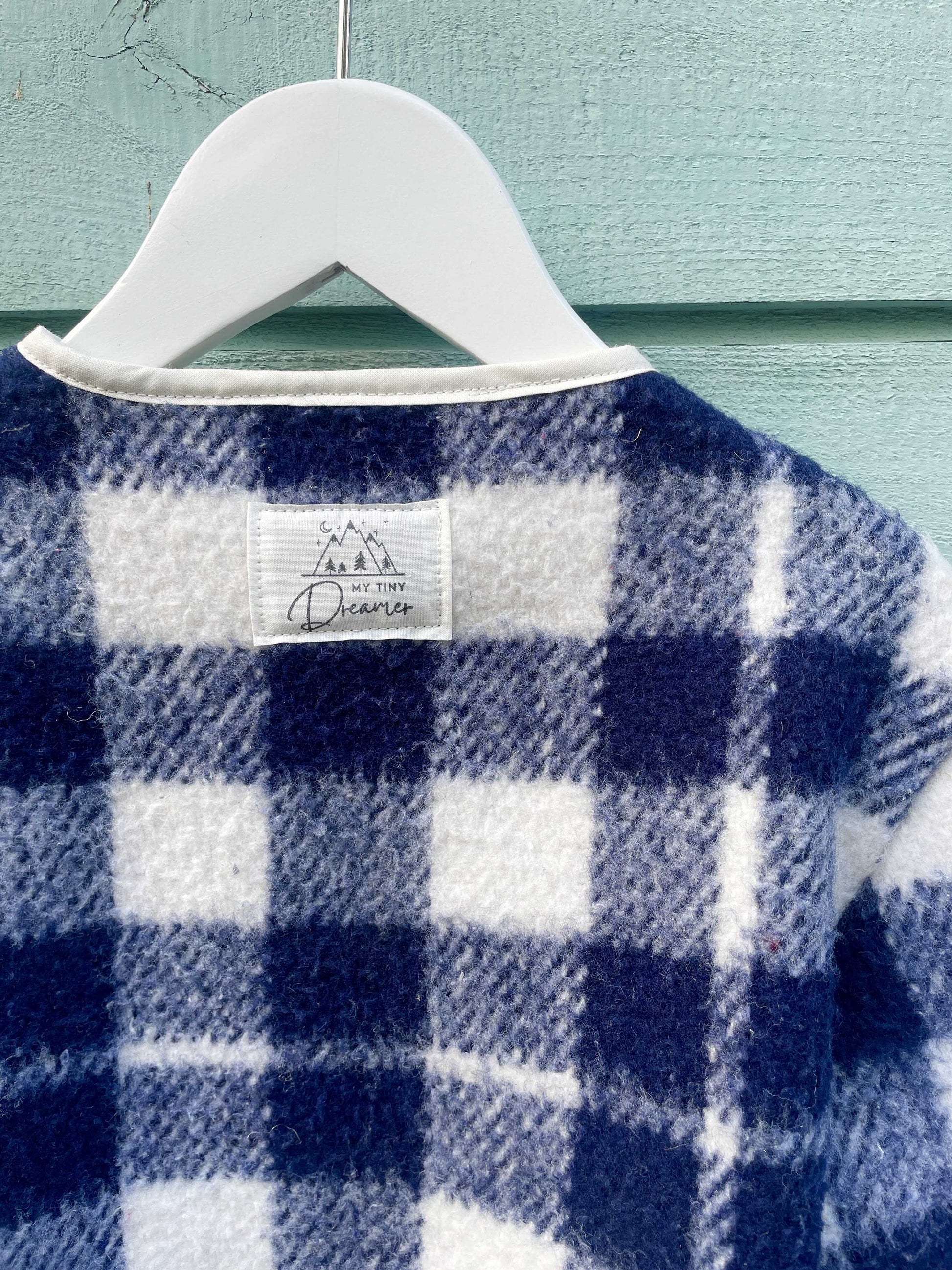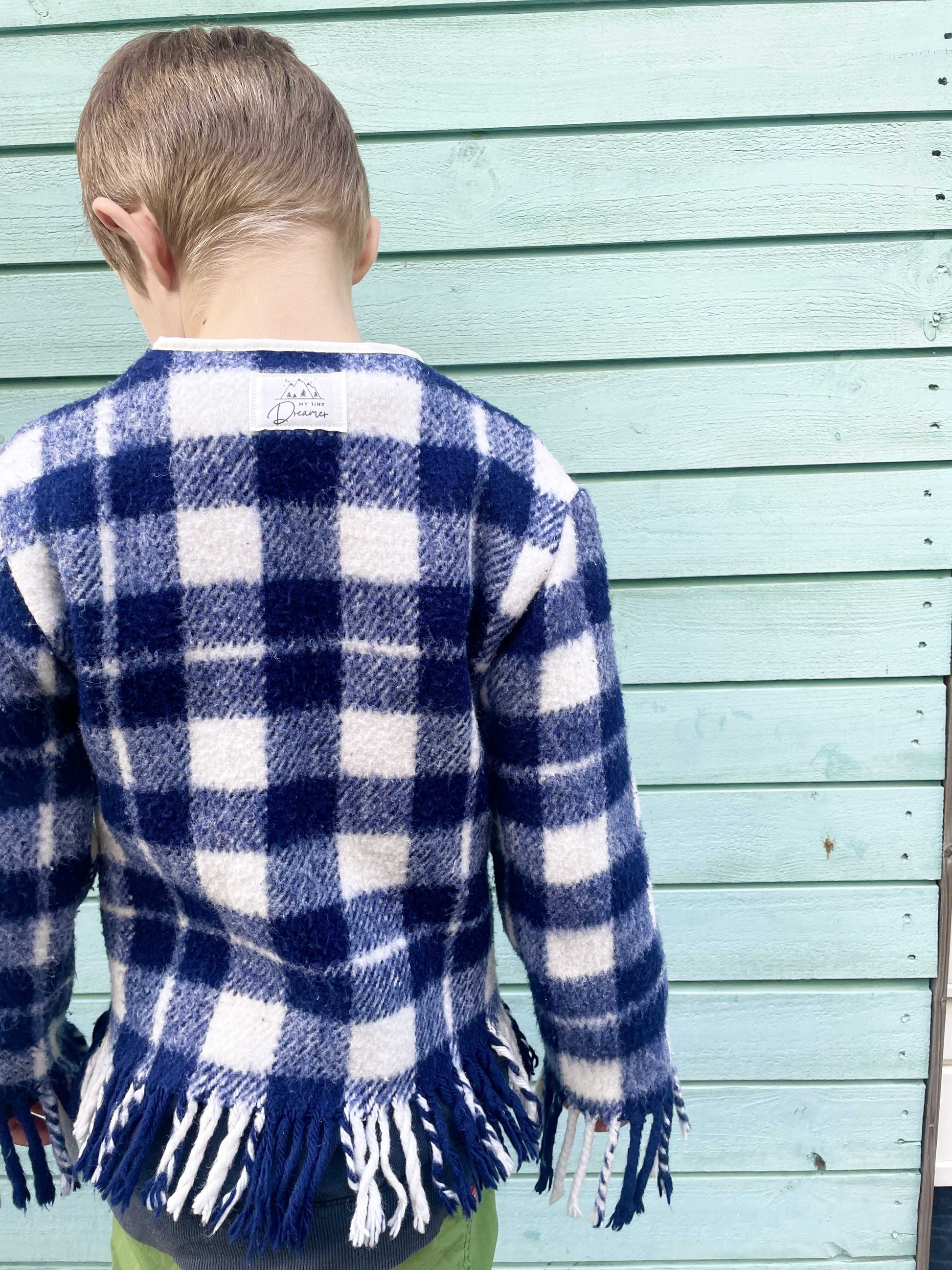 Smuk og unik børnejakke syet af det fineste lille tæppe med hvide og mørkeblå tern. Jakken er i syntetiske materialer og kradser derfor ikke, men er helt blød og lækker at have på og er perfekt som overgangsjakke både forår, sommer og efterår. Jakken er festlig med de originale frynser fra tæppet både i bunden og ved ærmerne. Den lukket med hvide trykknapper så den er nem selv at tage af og på.