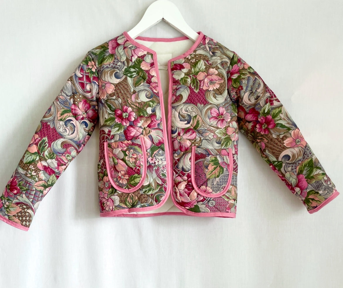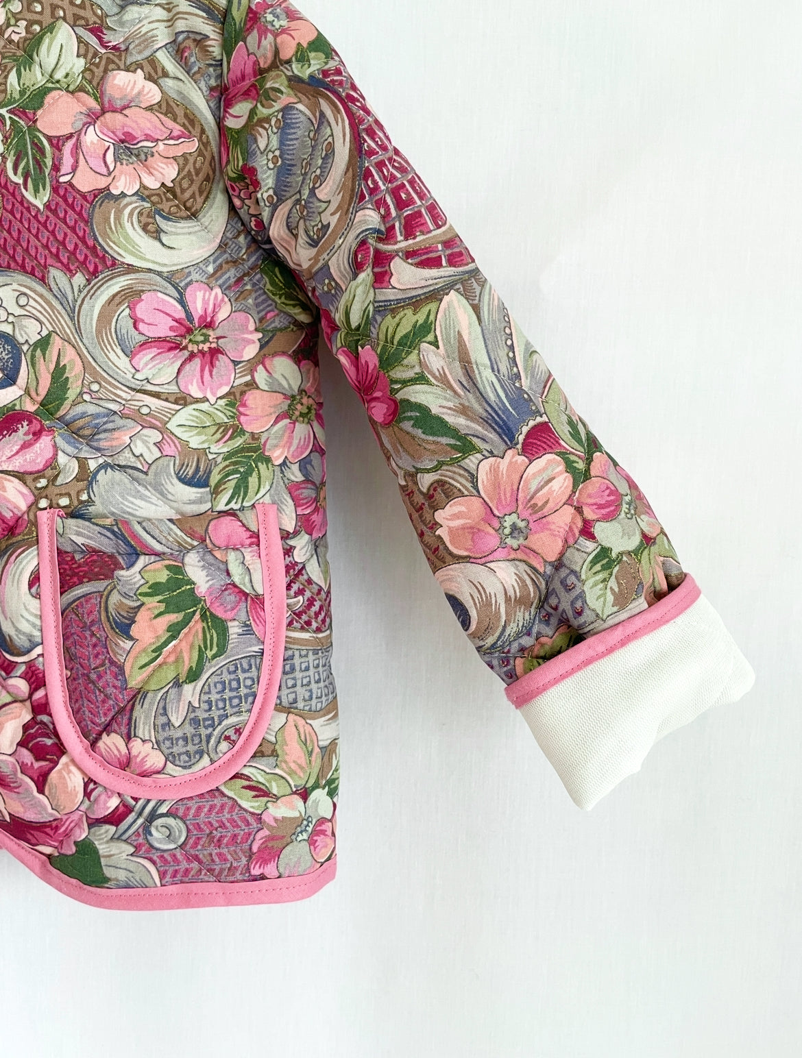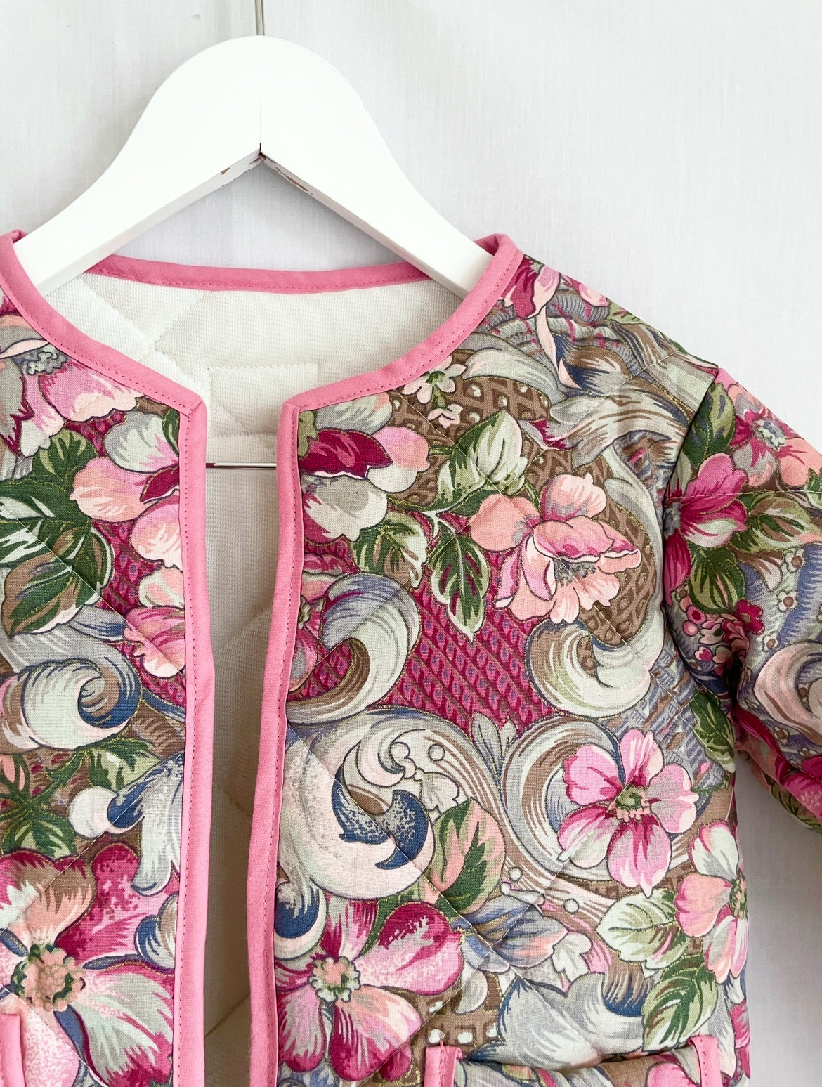 Smuk og unik børnejakke syet af skønt blomstret sengetæppe i lyserøde og grønne nuancer. Jakken er vatteret og kan bruges både forår, sommer og efterår. Den har praktiske lommer, der også pynter, så der altid er plads til småting, de samler op undervejs. Jakken er syet med kantebånd for en smuk finish. Jakken er åbenstående.