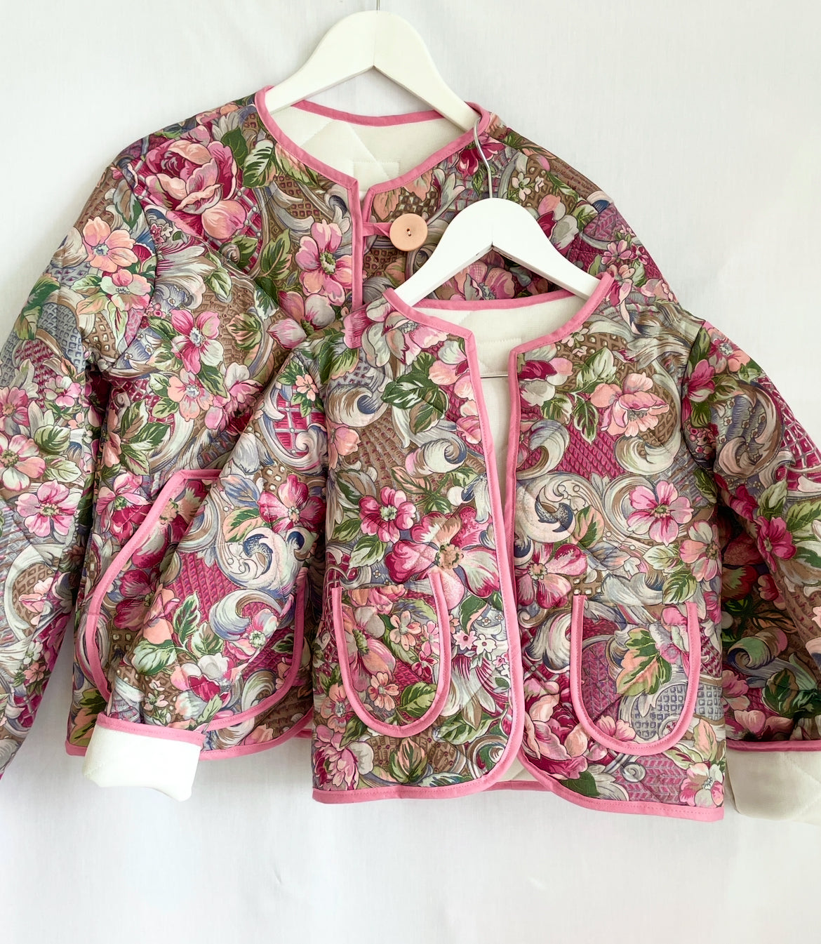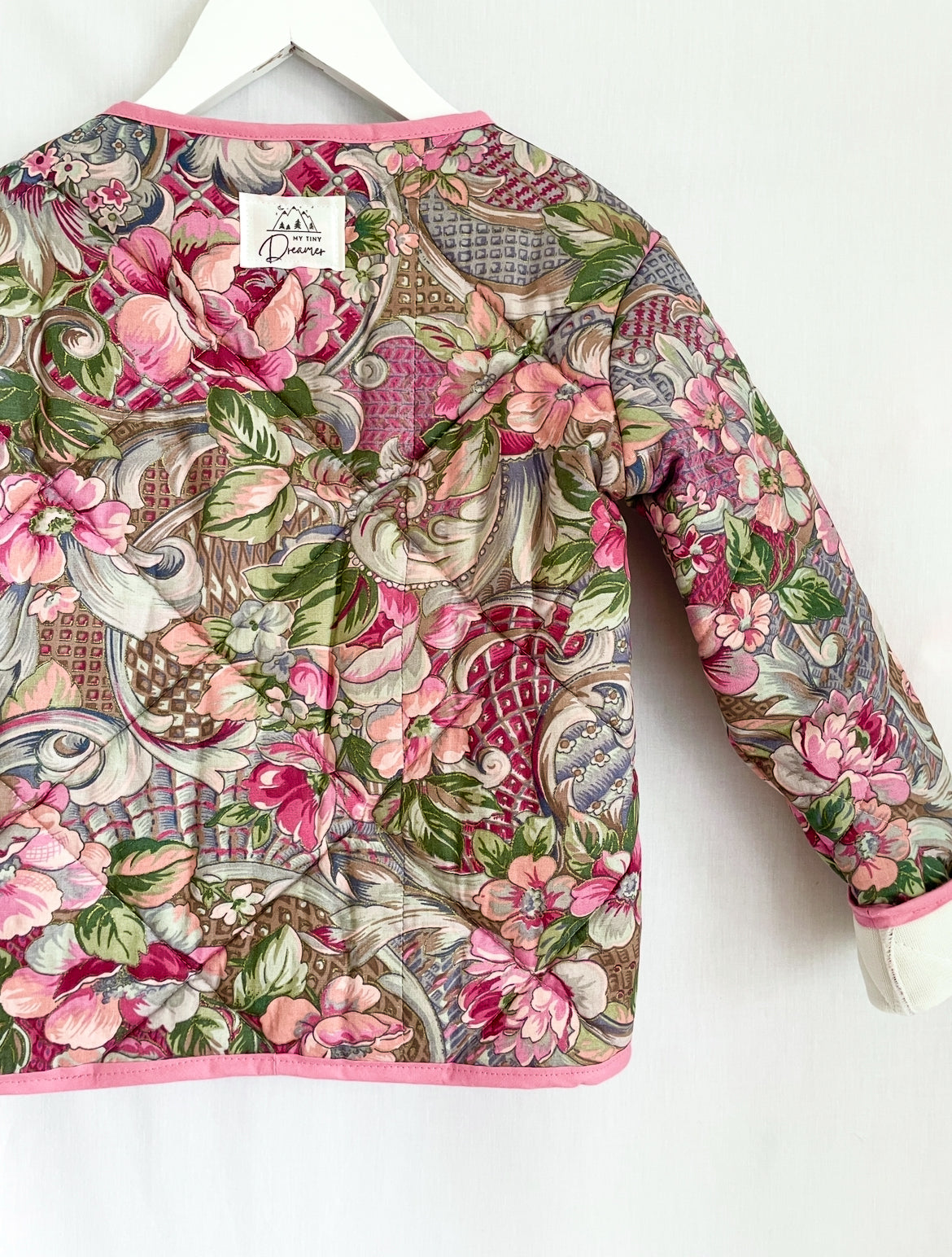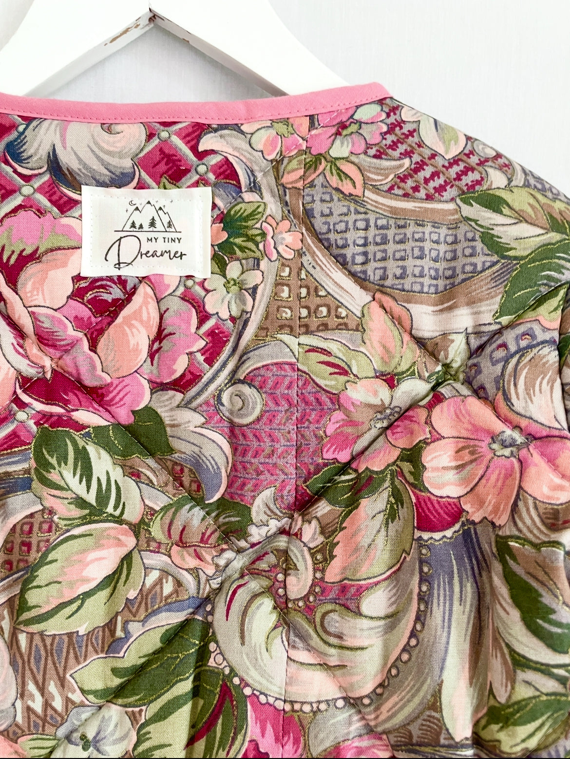 Smuk og unik børnejakke syet af skønt blomstret sengetæppe i lyserøde og grønne nuancer. Jakken er vatteret og kan bruges både forår, sommer og efterår. Den har praktiske lommer, der også pynter, så der altid er plads til småting, de samler op undervejs. Jakken er syet med kantebånd for en smuk finish. Jakken er åbenstående.