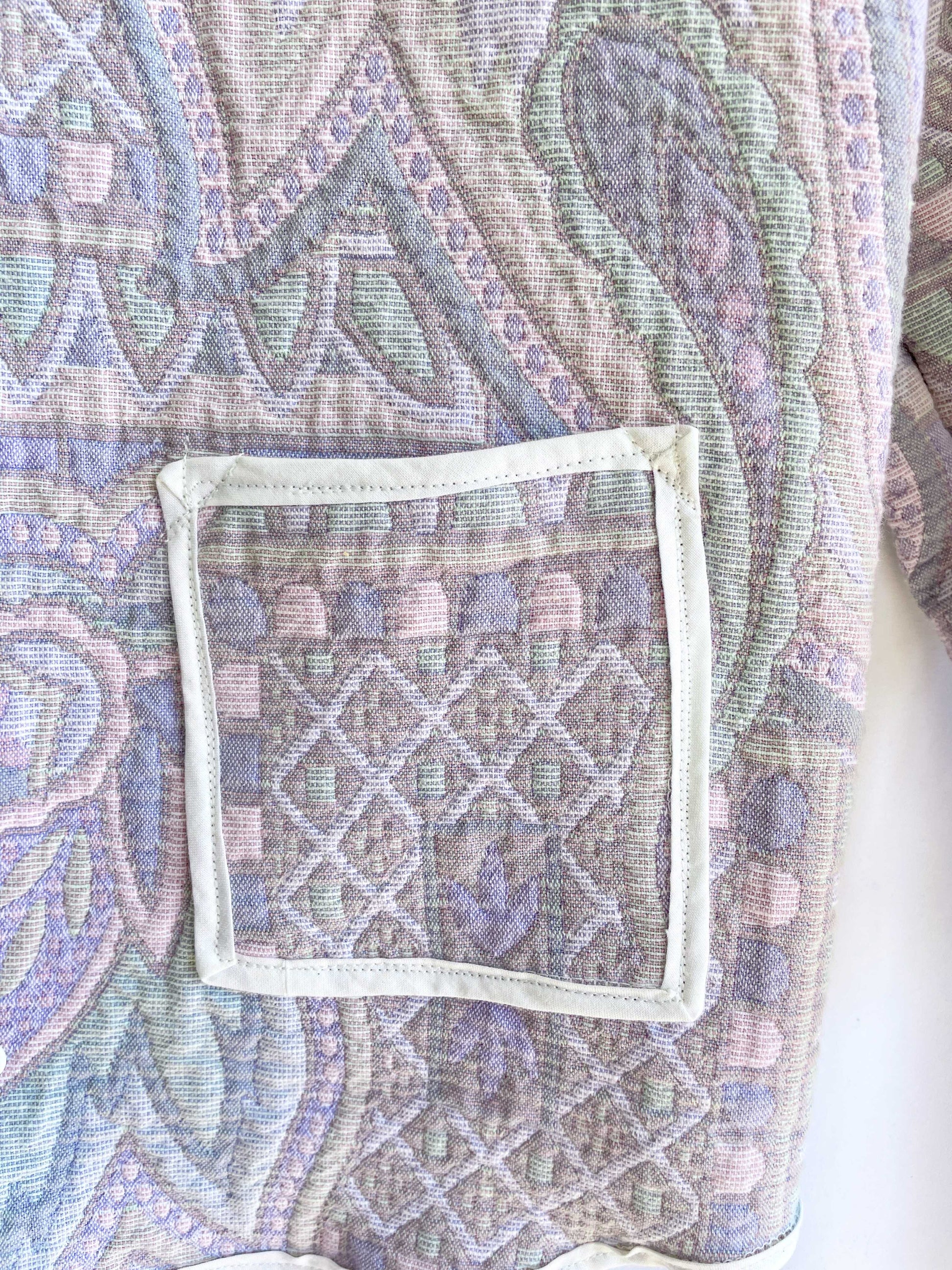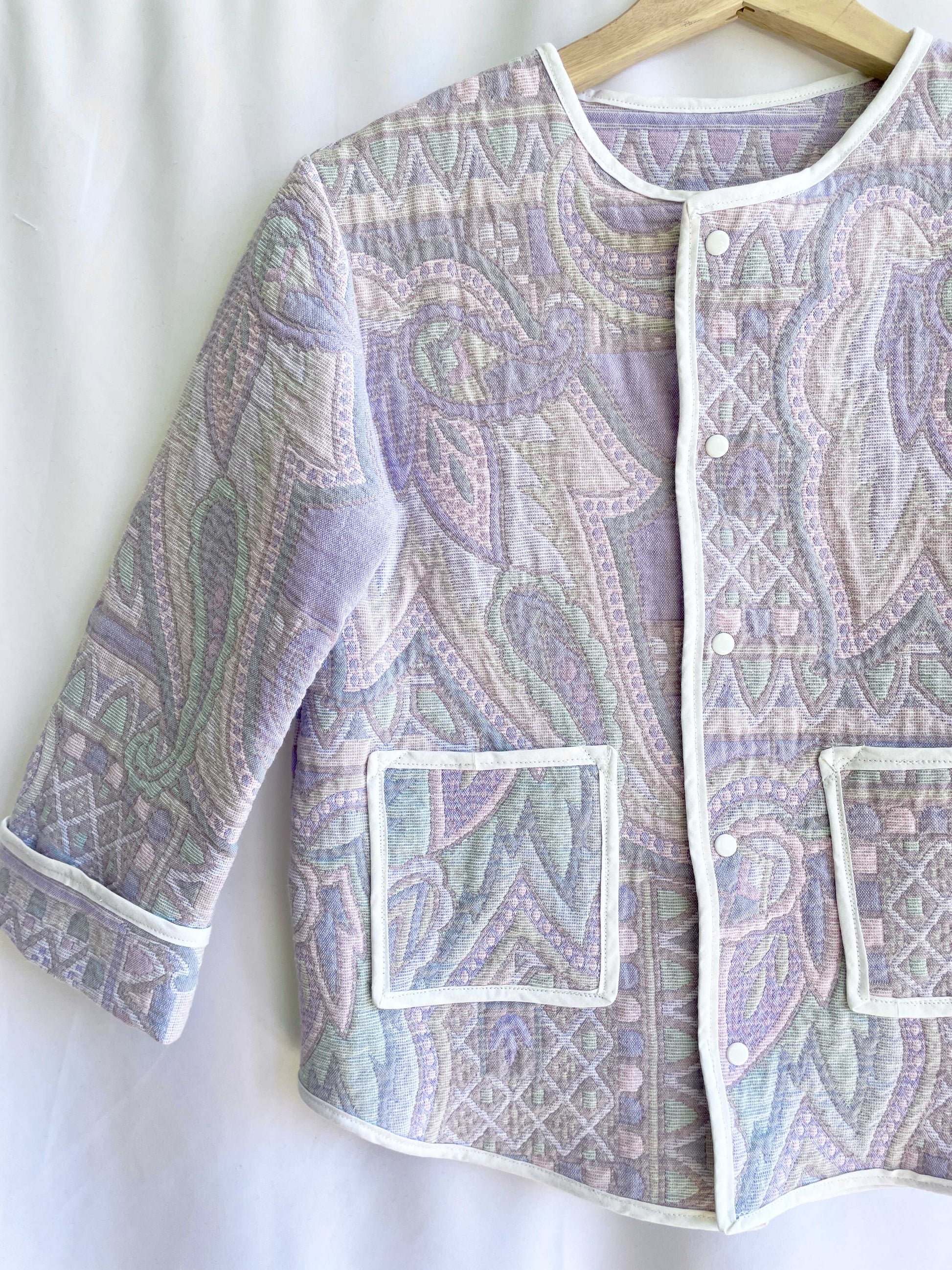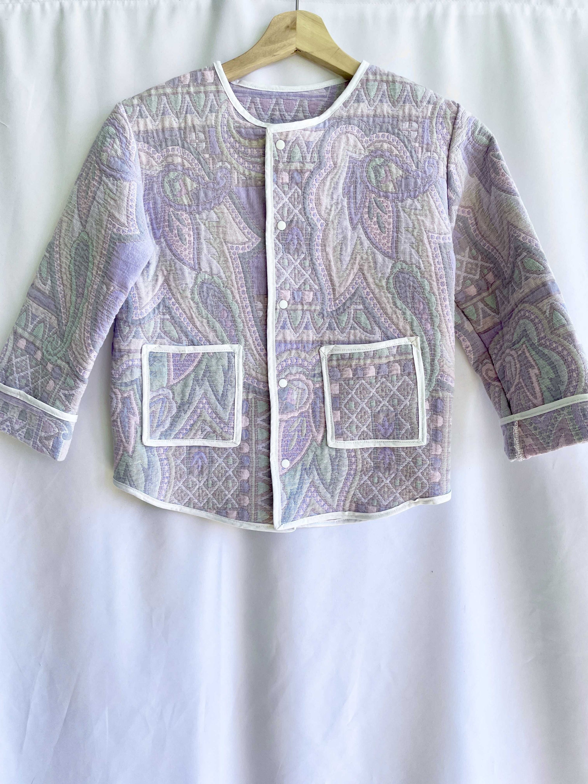 Fineste unikke børnejakke syet af lækkert sengetæppe med smukt mønster i lækre pasteller. Jakken er let vatteret og helt perfekt som sommer- og overgangsjakke. Den har praktiske lommer, der også pynter, så der altid er plads til småting, de samler op undervejs. Jakken er syet med kantebånd for en smuk finish. Den lukkes med trykknapper der er nemme selv at åbne og lukke.