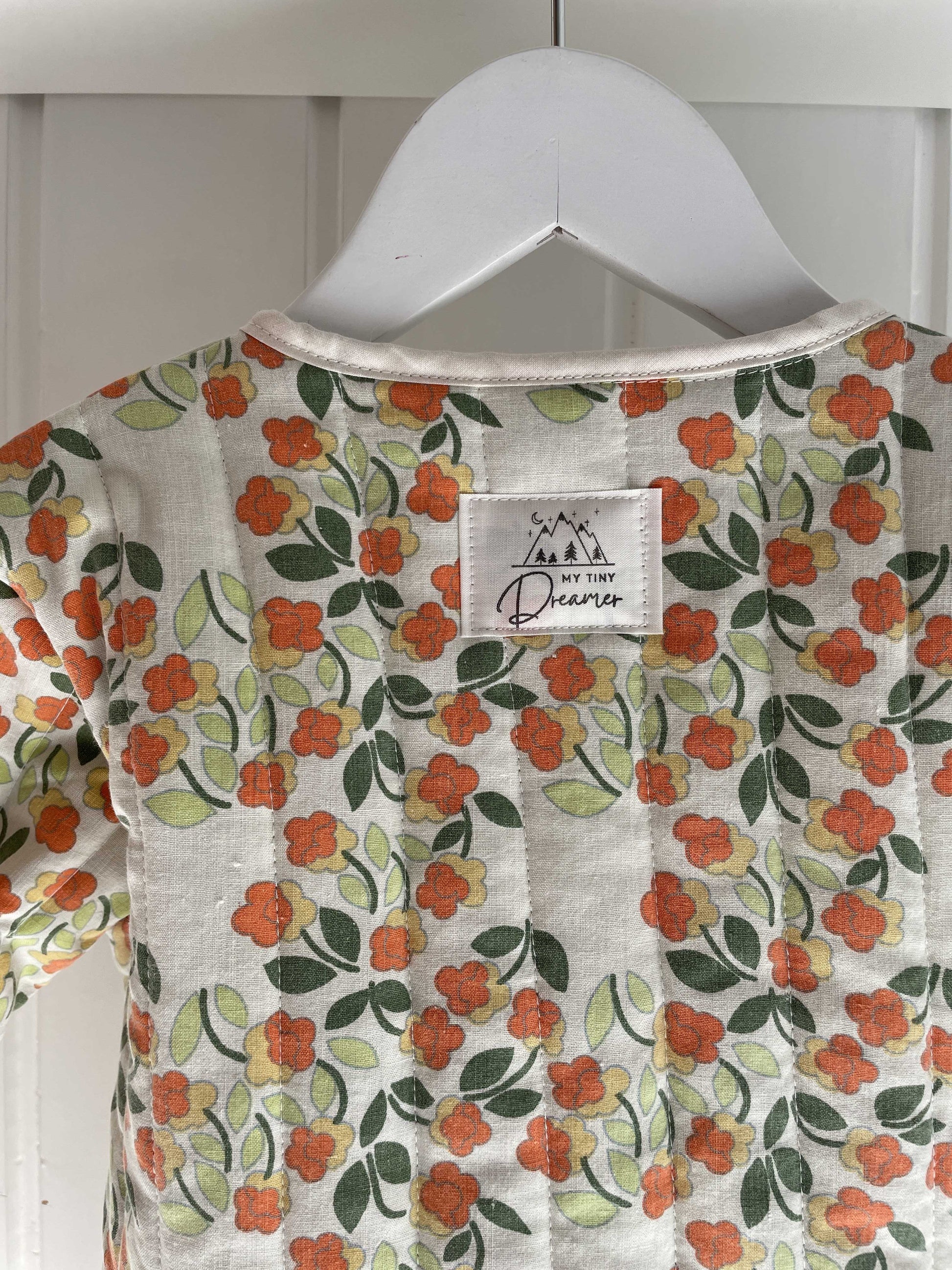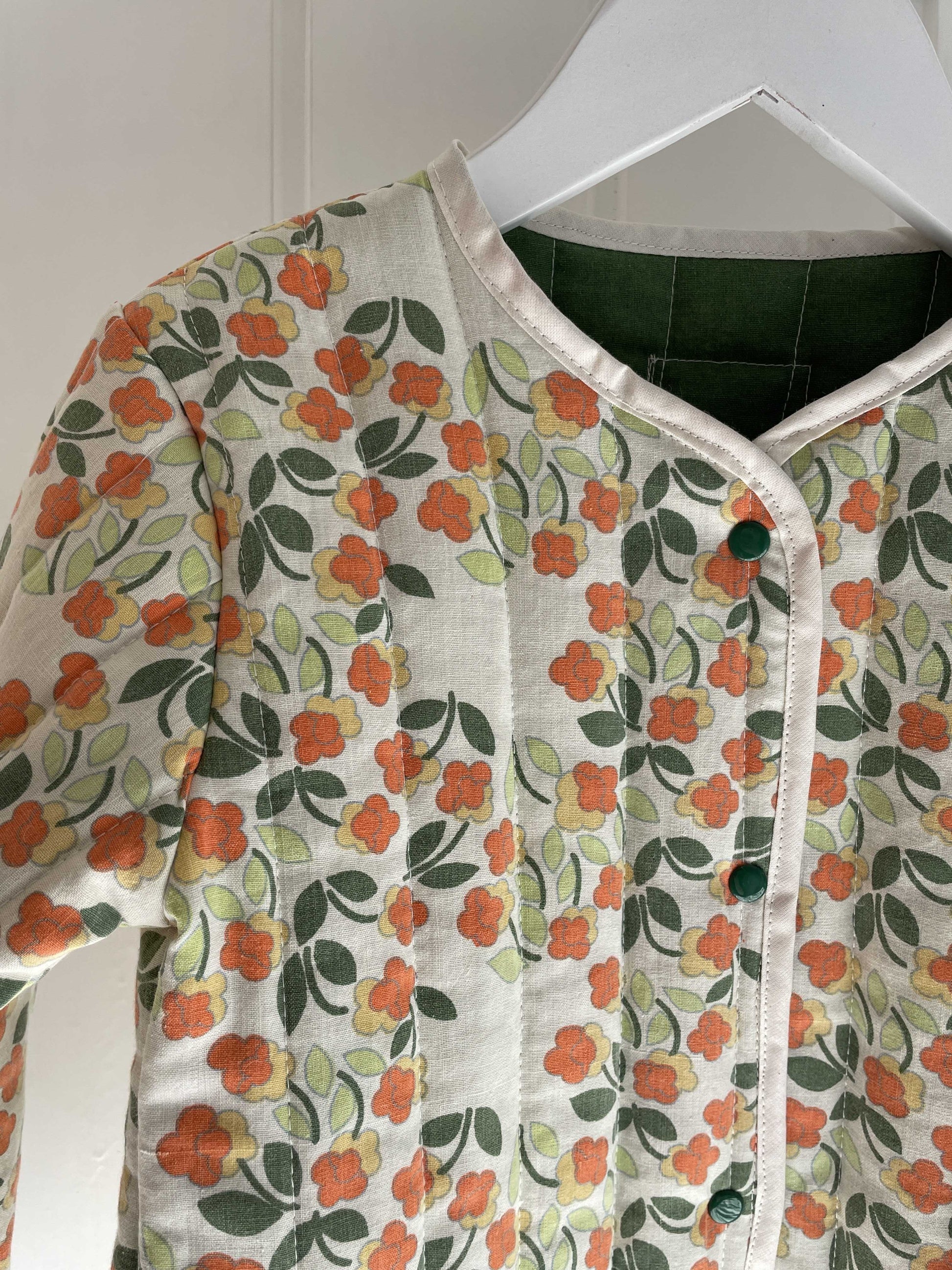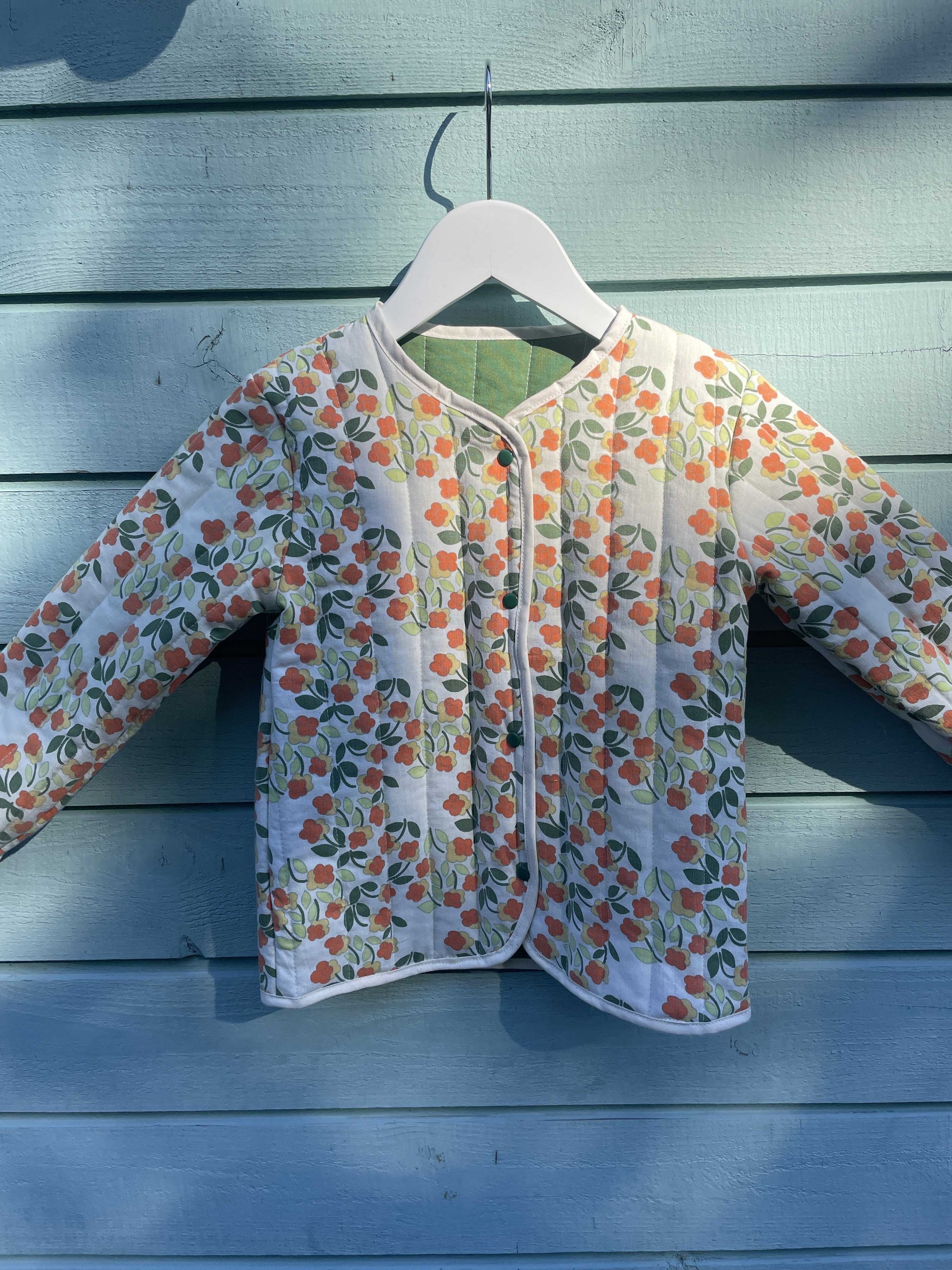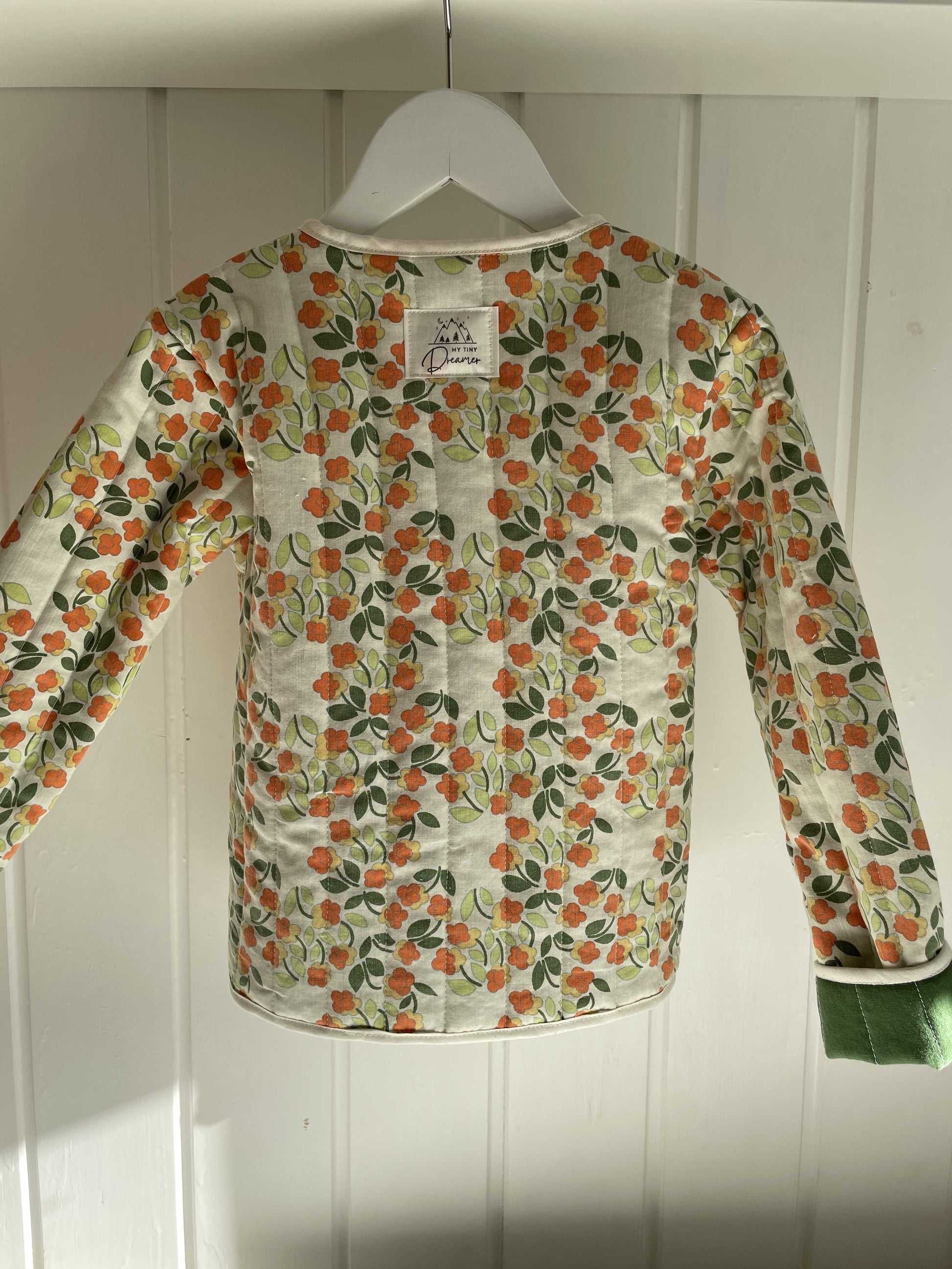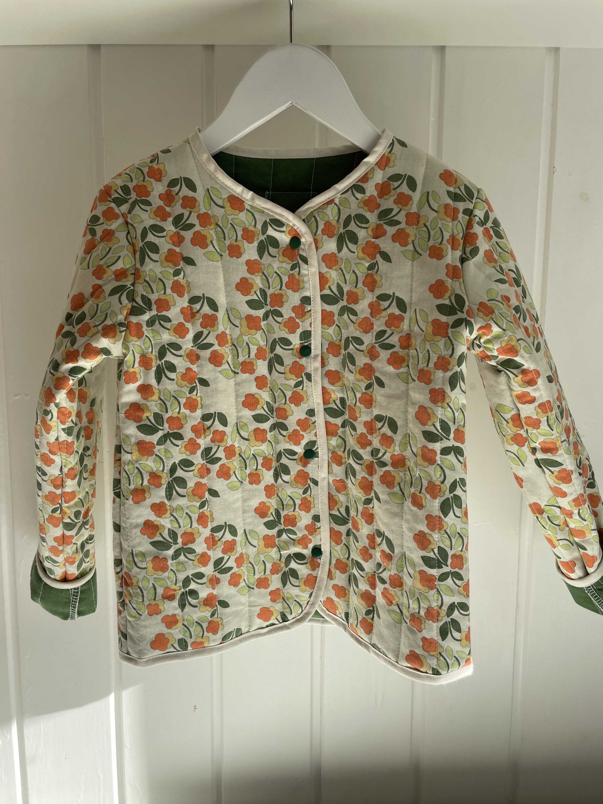 Smuk og unik børnejakke quiltet af de fineste efterårstof med orange blomster. Jakken er vatteret og kan bruges både forår, sommer og efterår. Jakken er syet med kantebånd af samme stof for en smuk finish. Jakken er lukket med grønne trykknapper så den er nem selv at tage af og på.