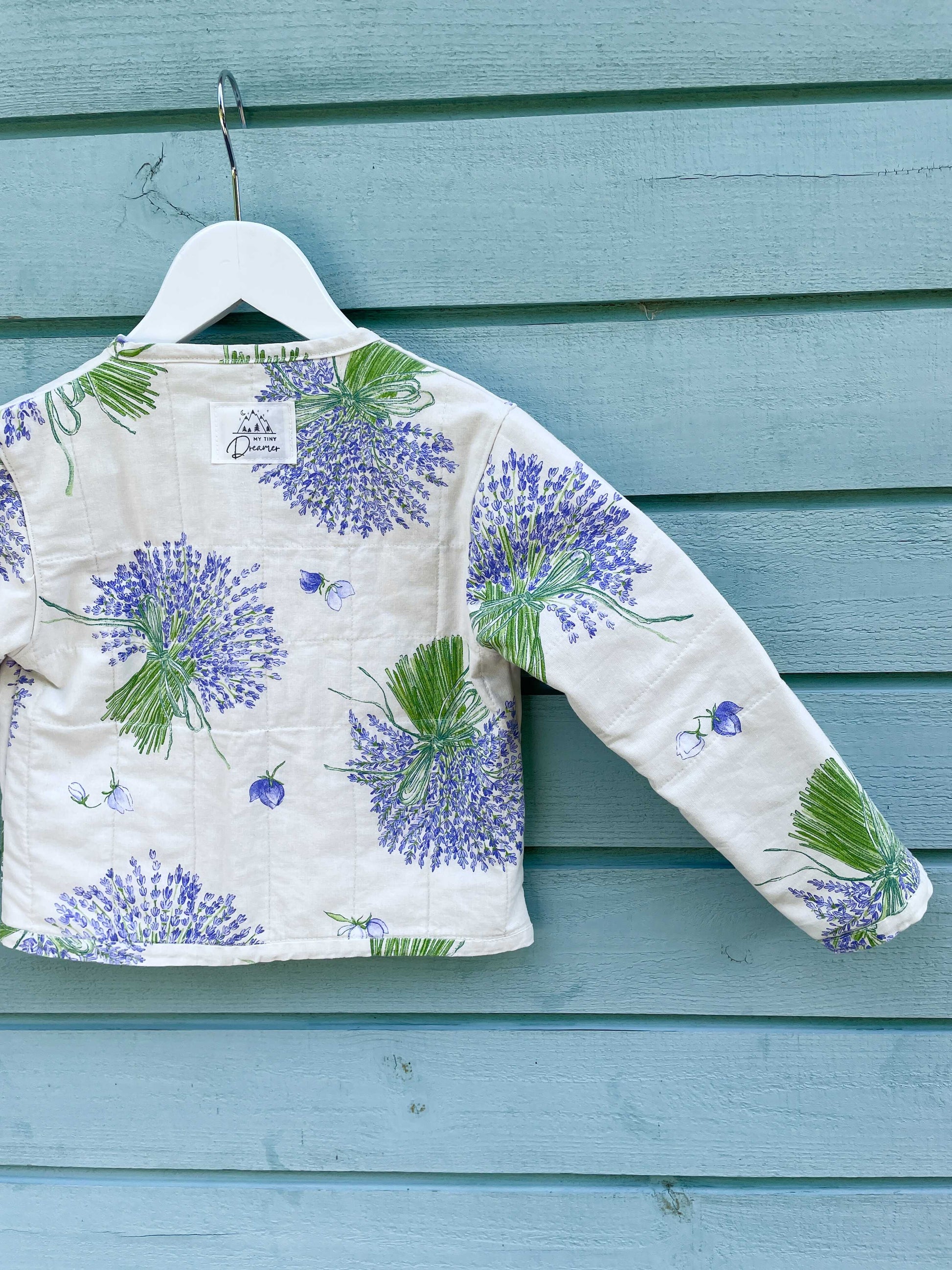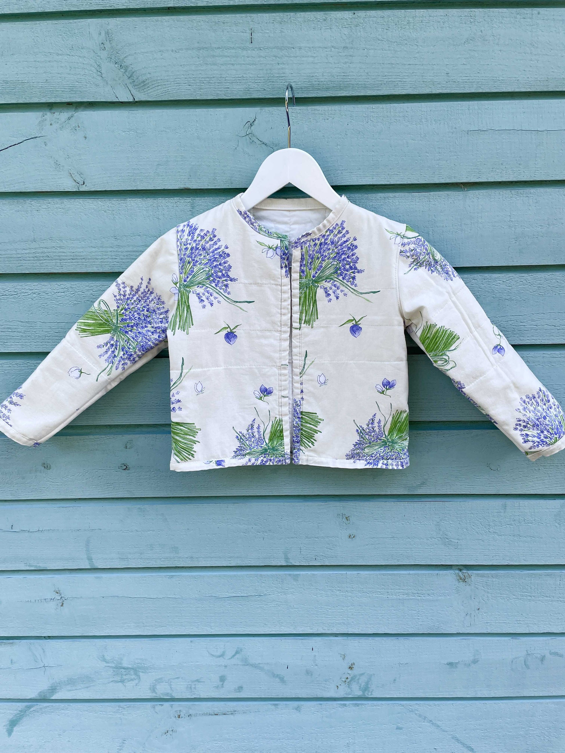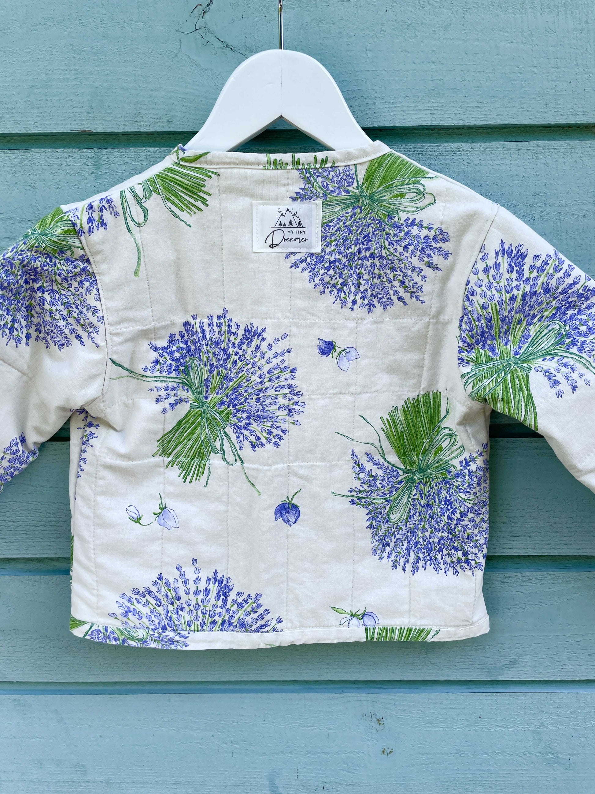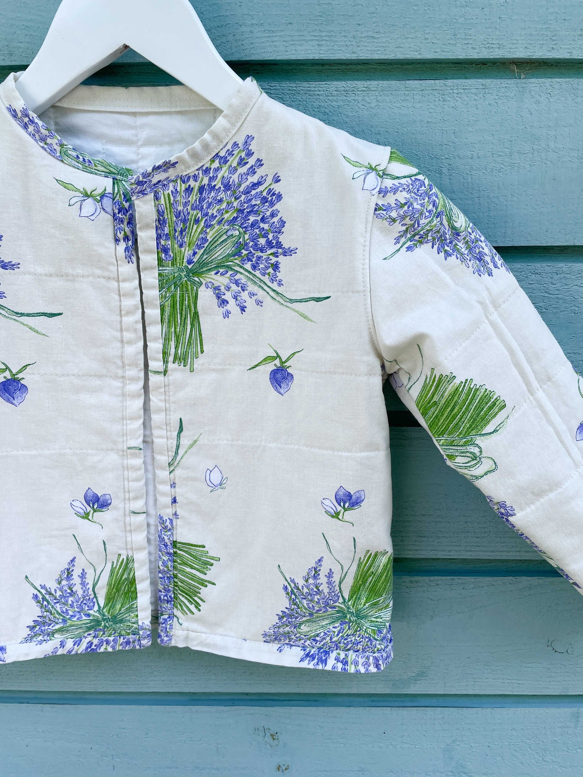 Smuk og unik børnejakke syet af det fineste lille tæppe med lilla blomster. Jakken er vatteret og kan bruges både forår, sommer og efterår. Jakken er syet med kantebånd af samme stof for en smuk finish. Jakken er åbenstående.