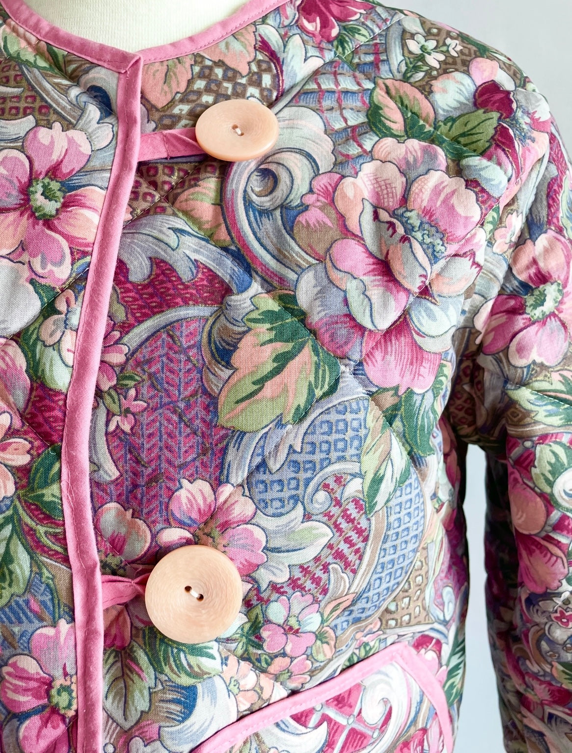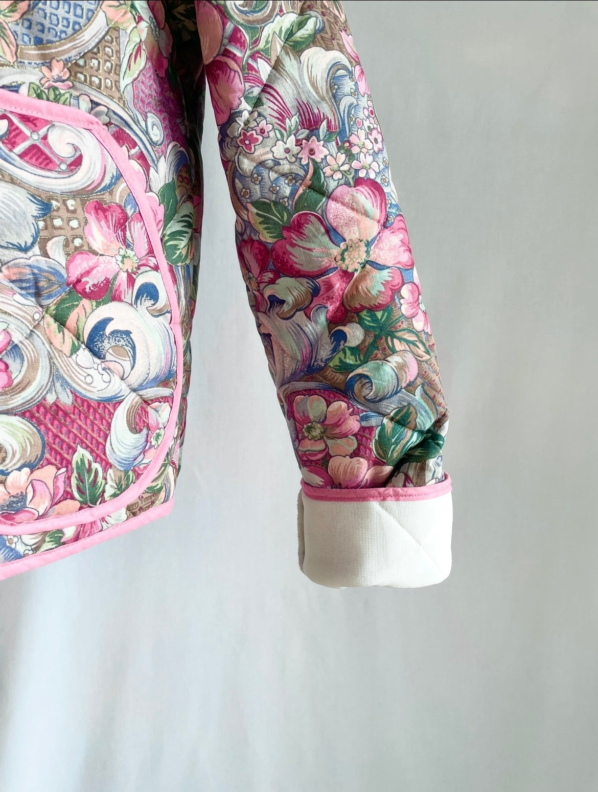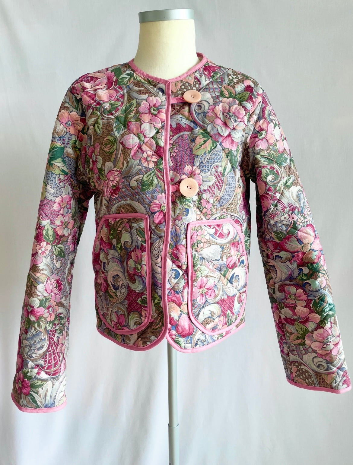 Smuk og unik kort jakke syet af skønt blomstret sengetæppe i lyserøde og grønne nuancer. Jakken er vatteret og kan bruges både forår, sommer og efterår. Den har praktiske lommer, der også pynter, så du altid har et sted til dine ting og dine hænder. Jakken er syet med lyserødt kantebånd for en smuk finish og lukkes med to store vintageknapper.