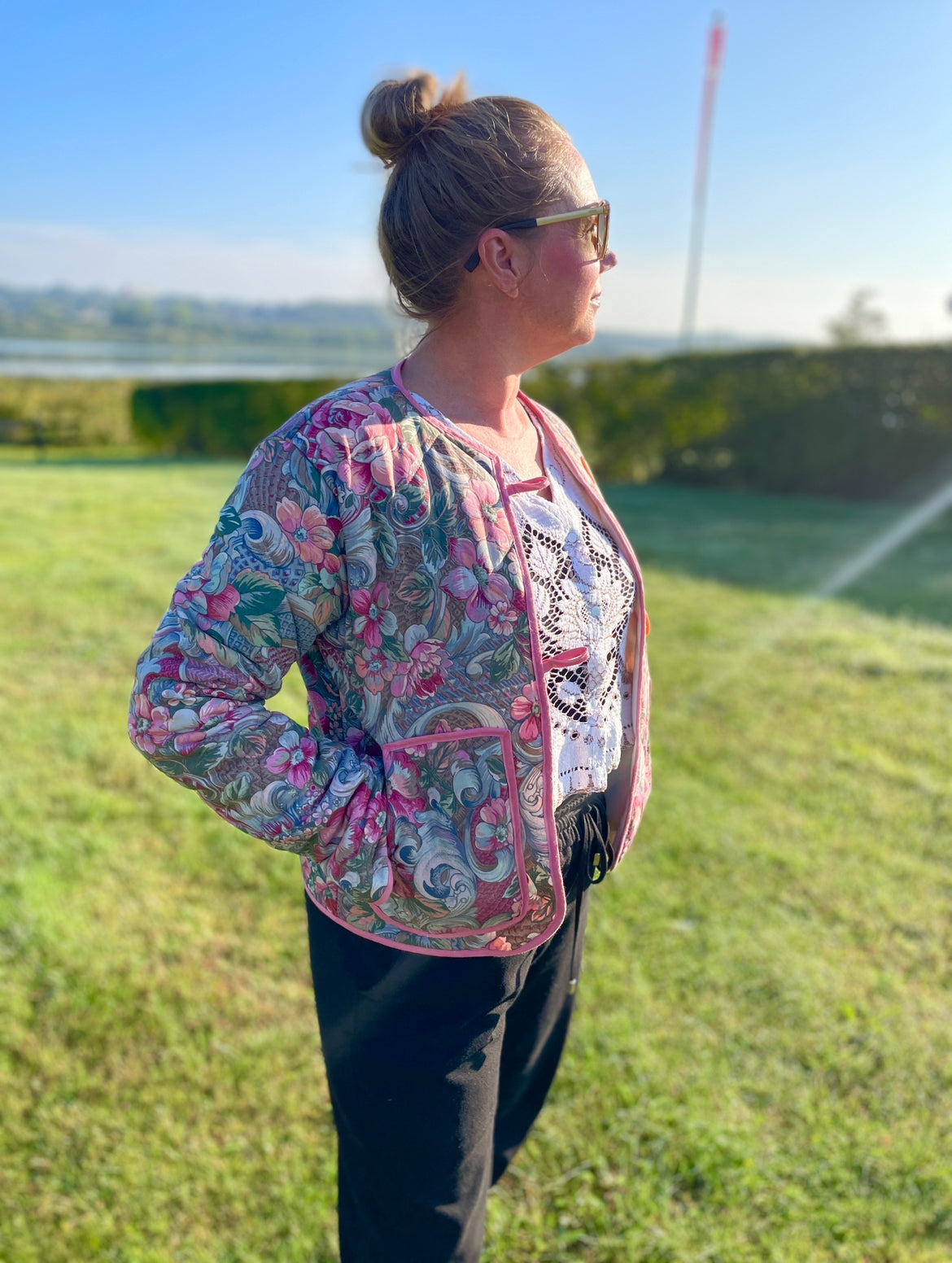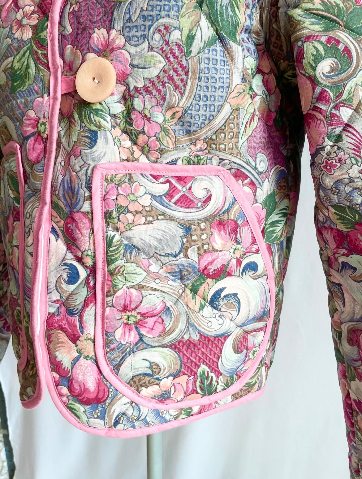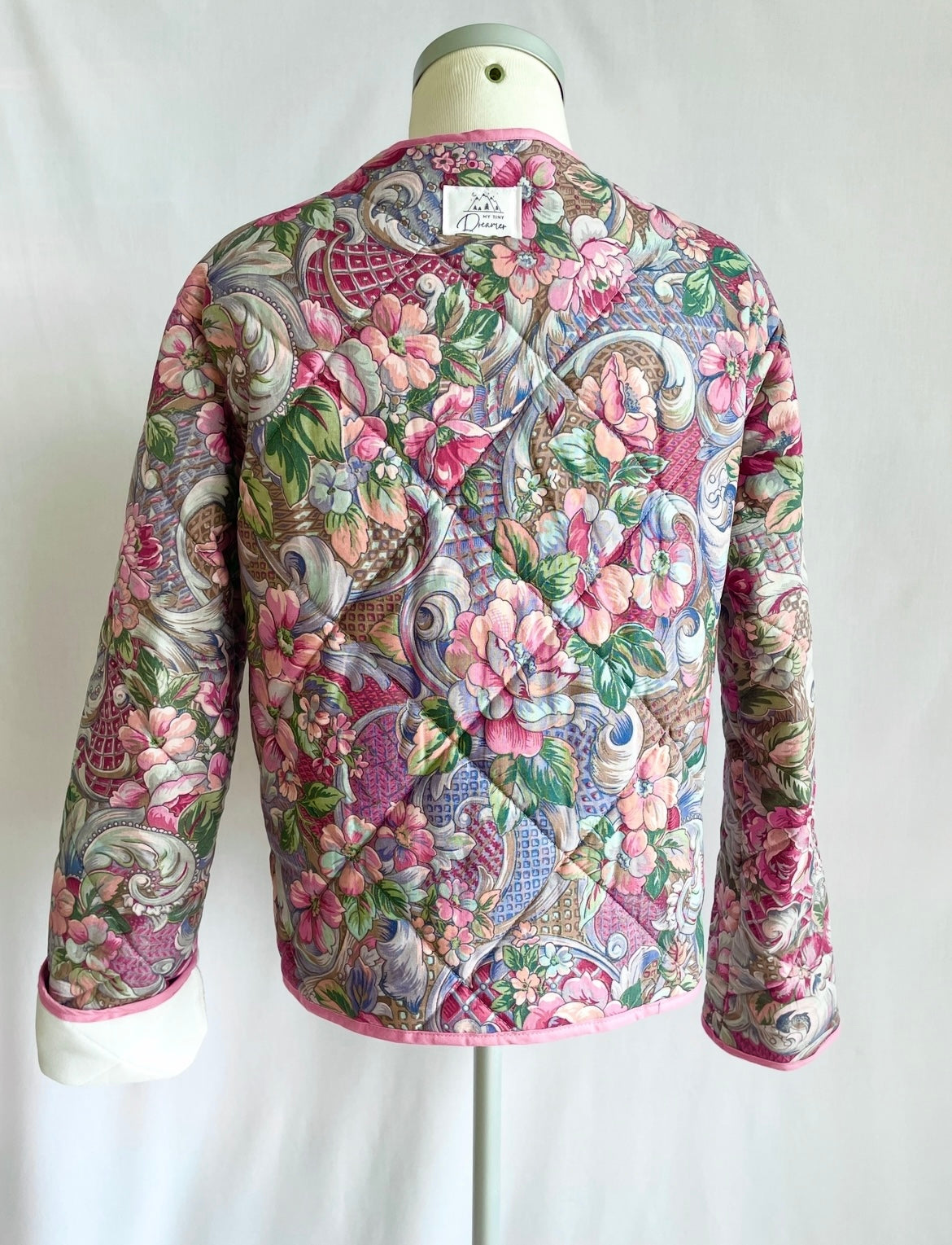 Smuk og unik kort jakke syet af skønt blomstret sengetæppe i lyserøde og grønne nuancer. Jakken er vatteret og kan bruges både forår, sommer og efterår. Den har praktiske lommer, der også pynter, så du altid har et sted til dine ting og dine hænder. Jakken er syet med lyserødt kantebånd for en smuk finish og lukkes med to store vintageknapper.