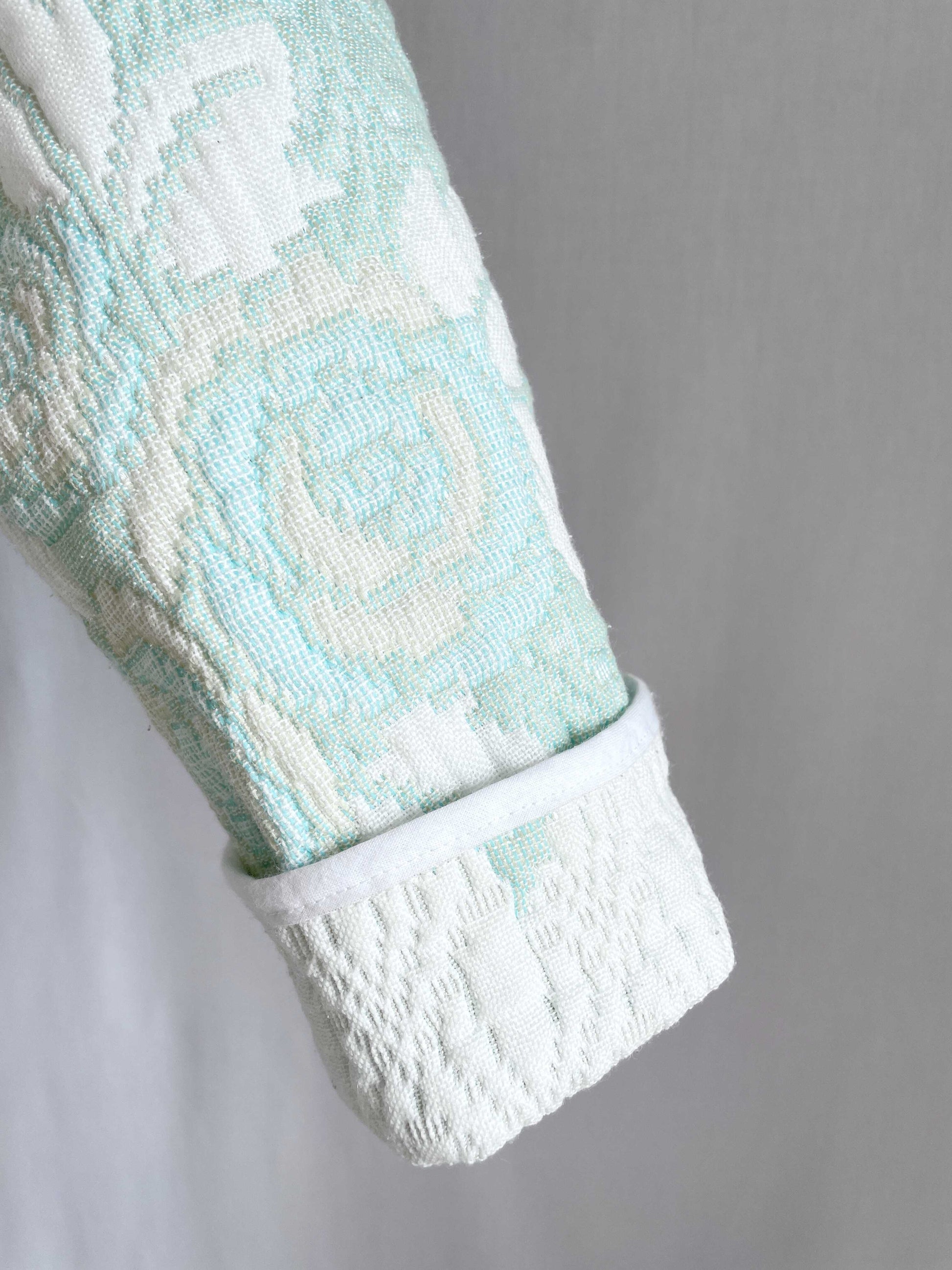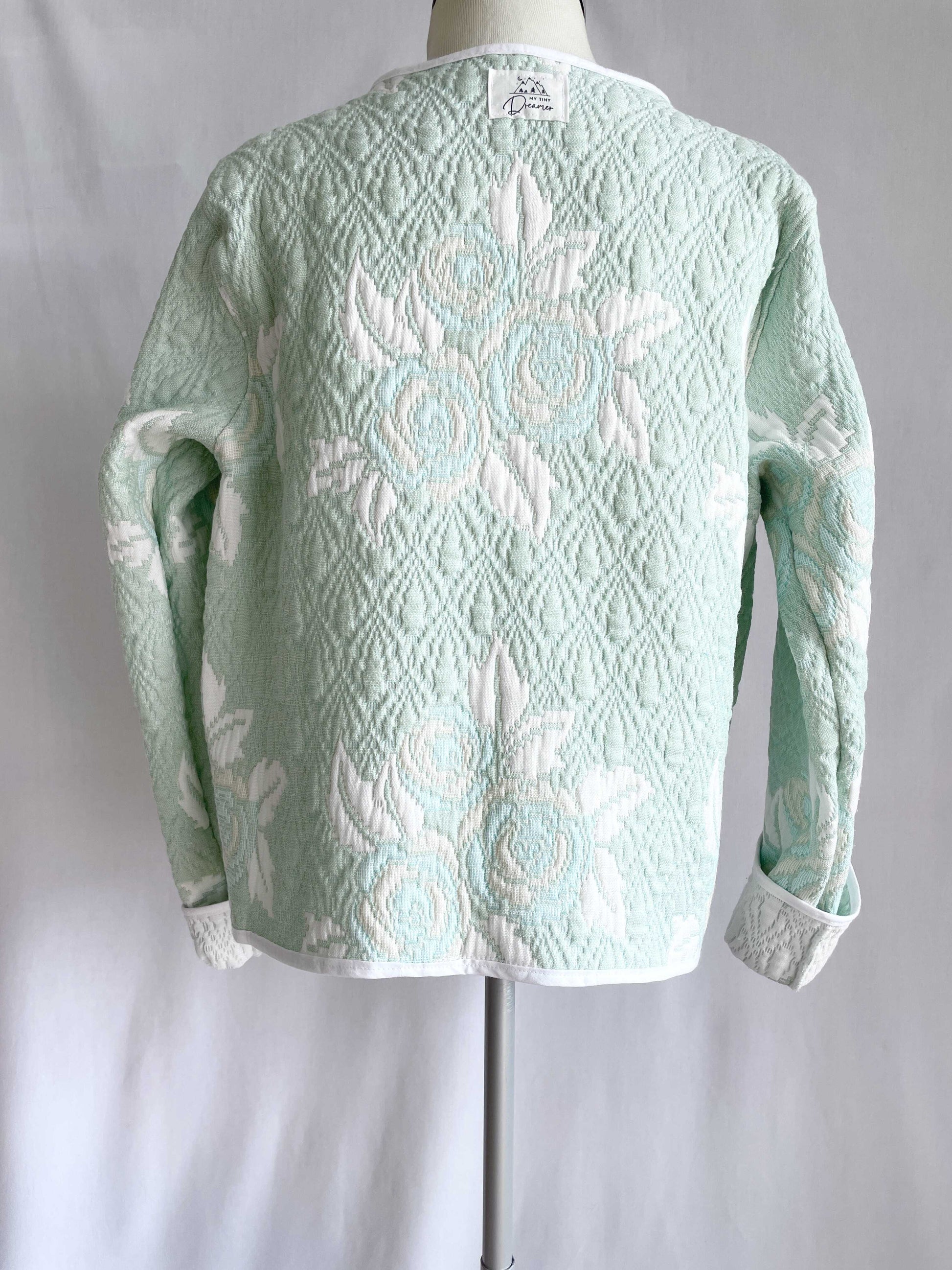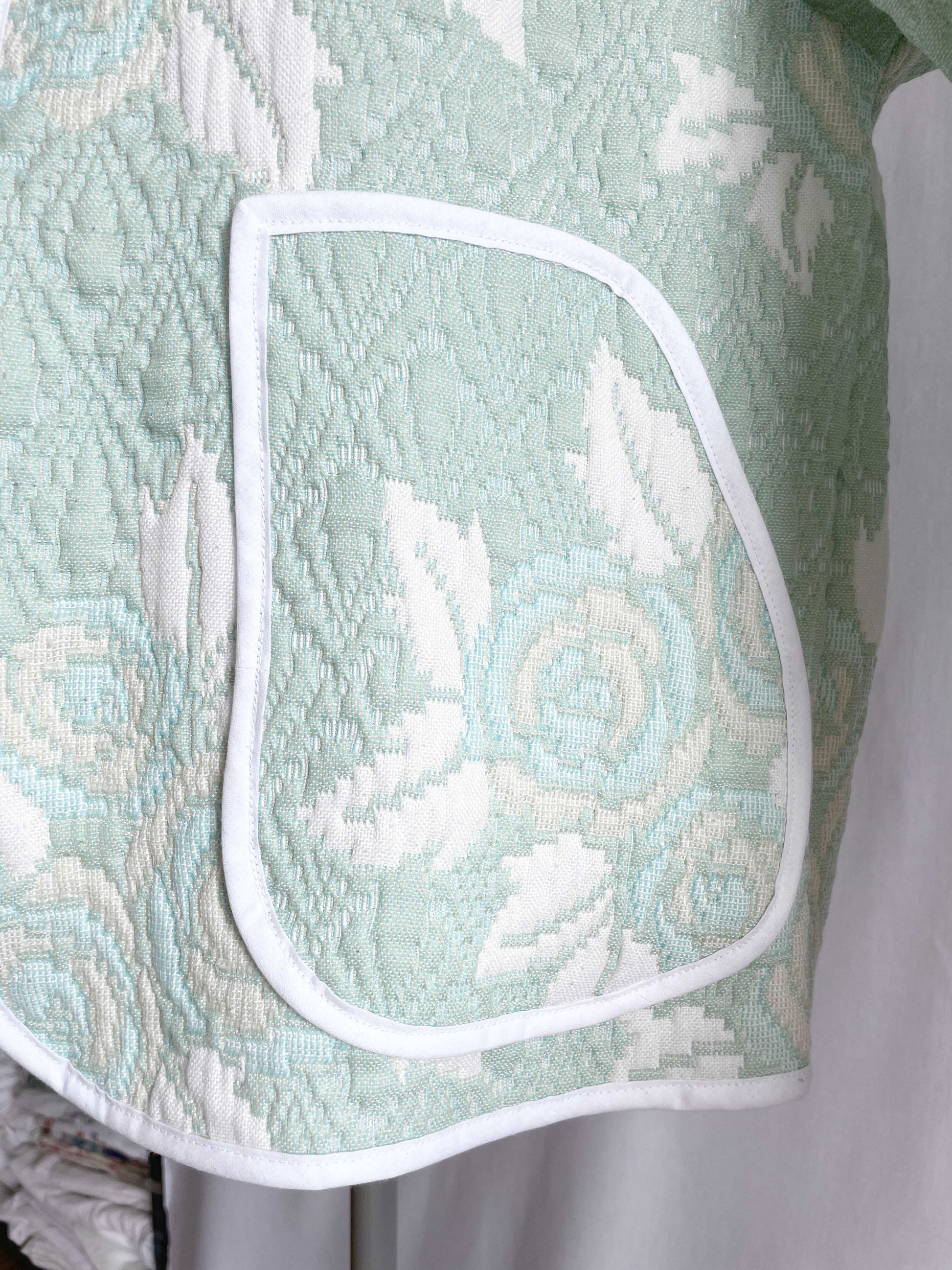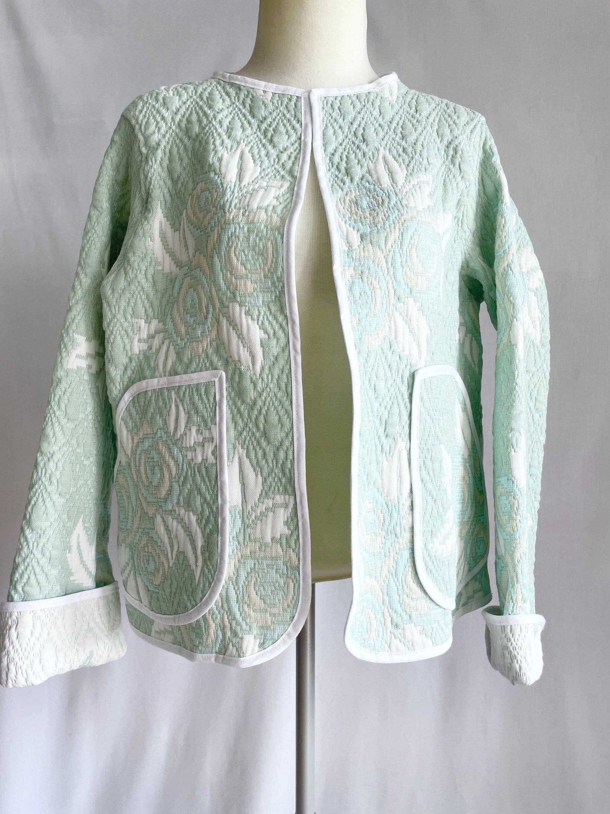 Smuk og unik kort jakke syet af lækkert turkis sengetæppe med blomster. Jakken er let vatteret og helt perfekt som sommer og overgangsjakke. Den har praktiske lommer, der også pynter, så du altid har et sted til dine ting og dine hænder. Jakken er syet med kantebånd for en smuk finish.