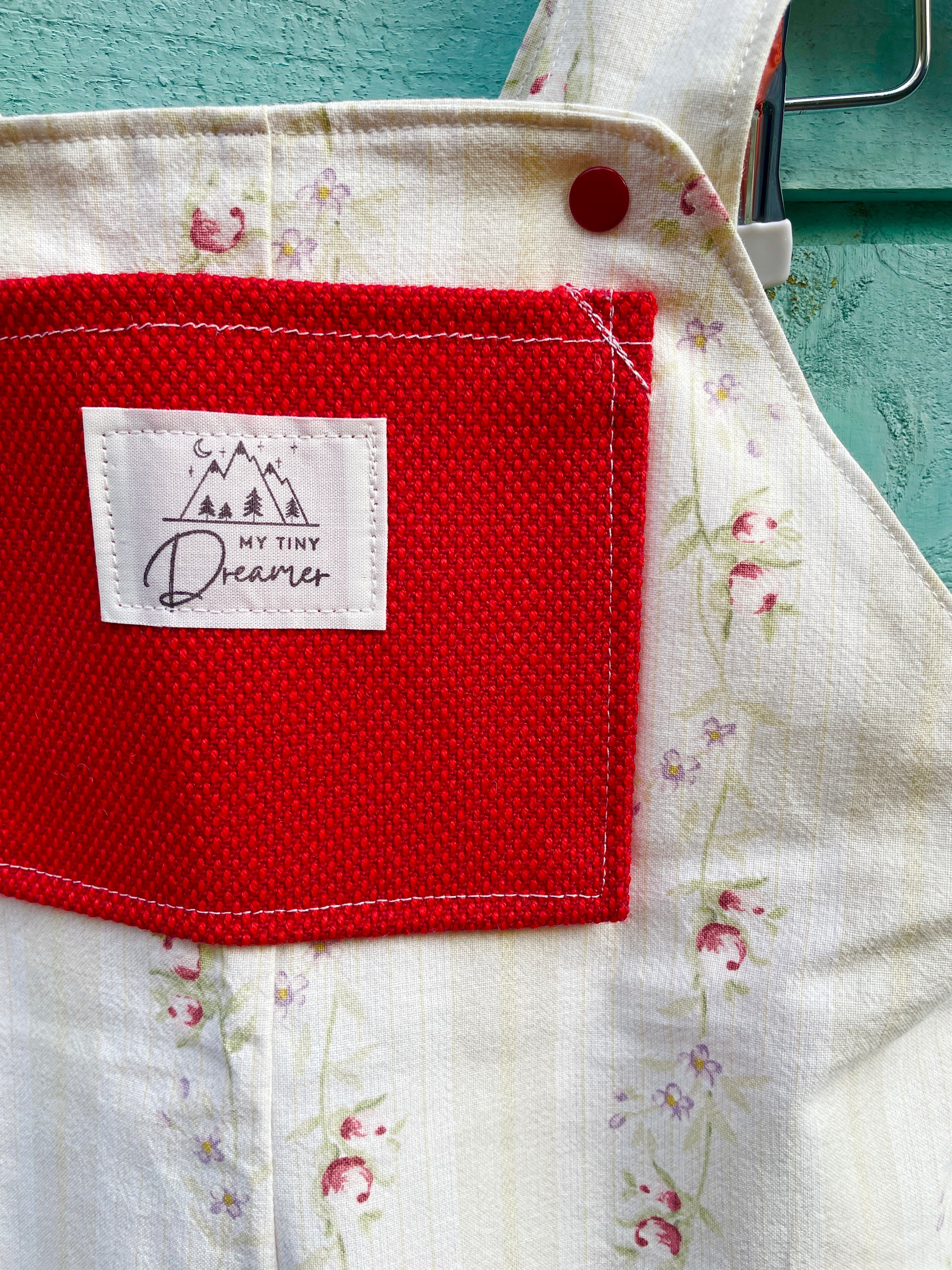Søde overalls i retrostof med røde blomster. Lukkes med røde trykknapper. Lommen foran er syet af eksklusive overskudsmaterialer fra Aarhus Møbelpolstrer.