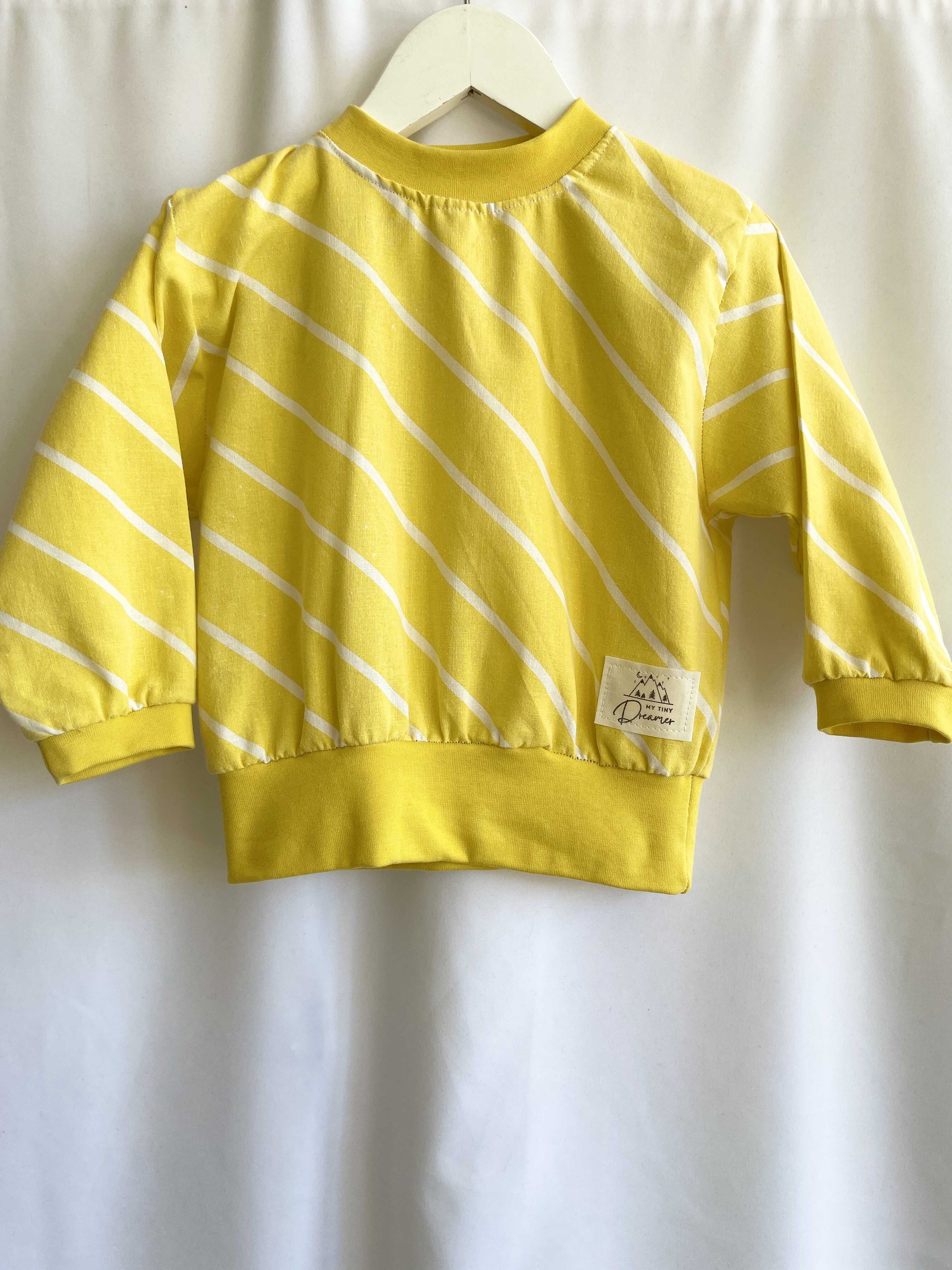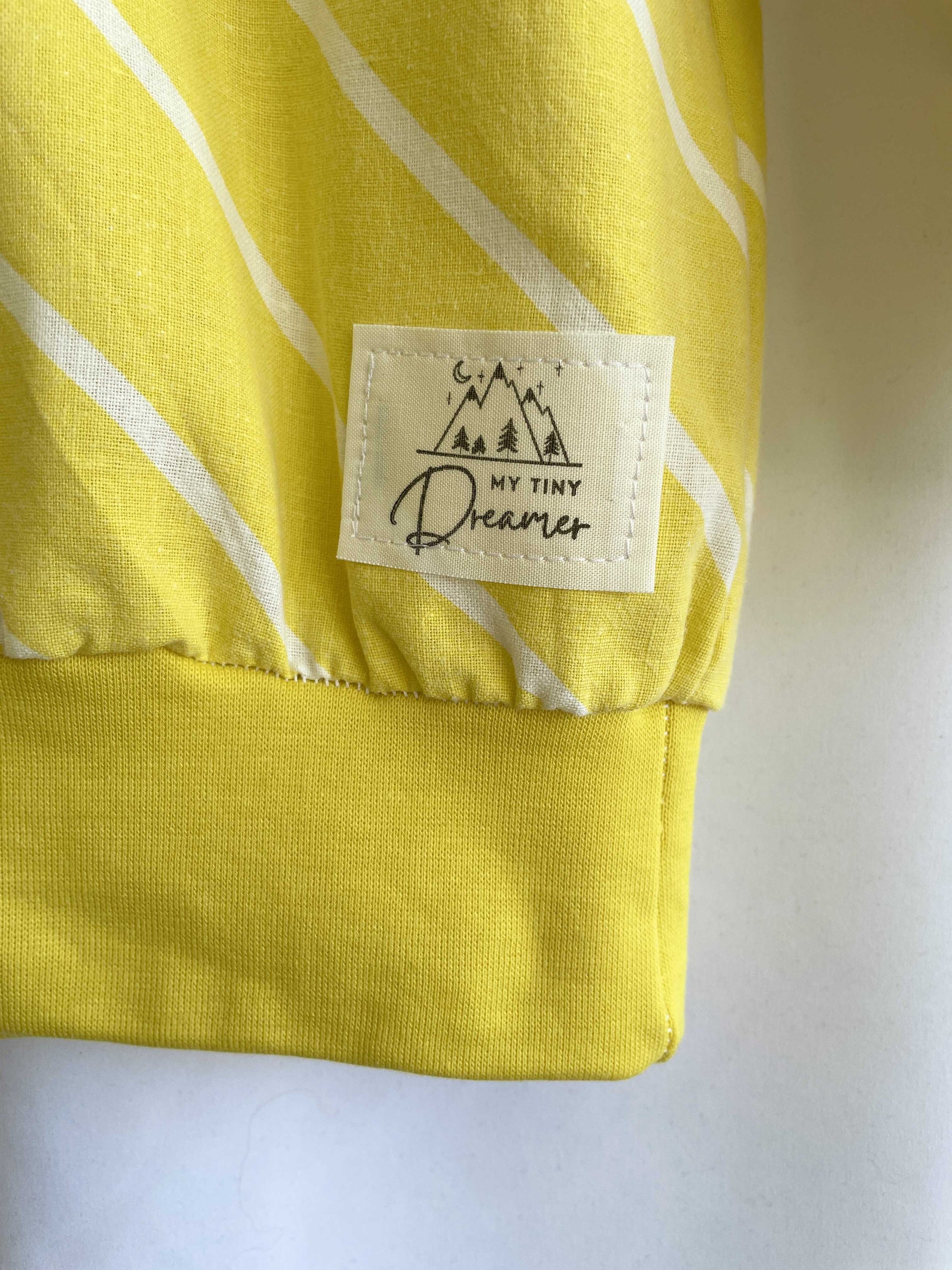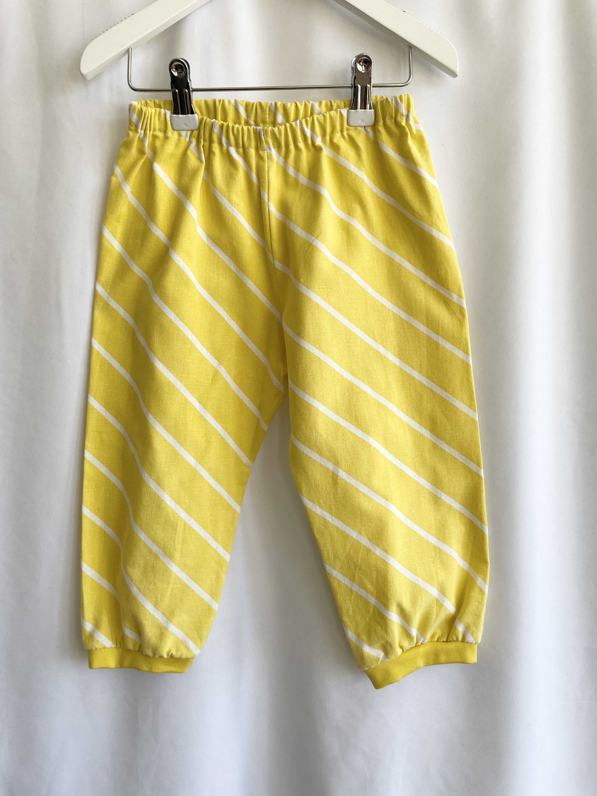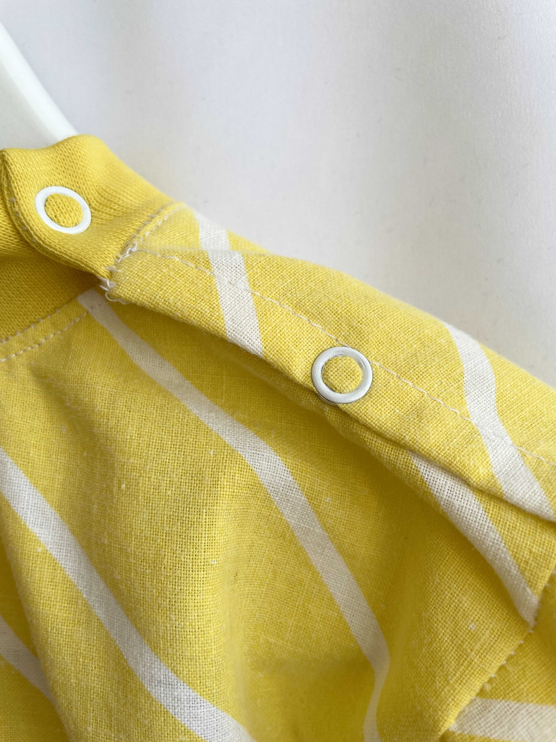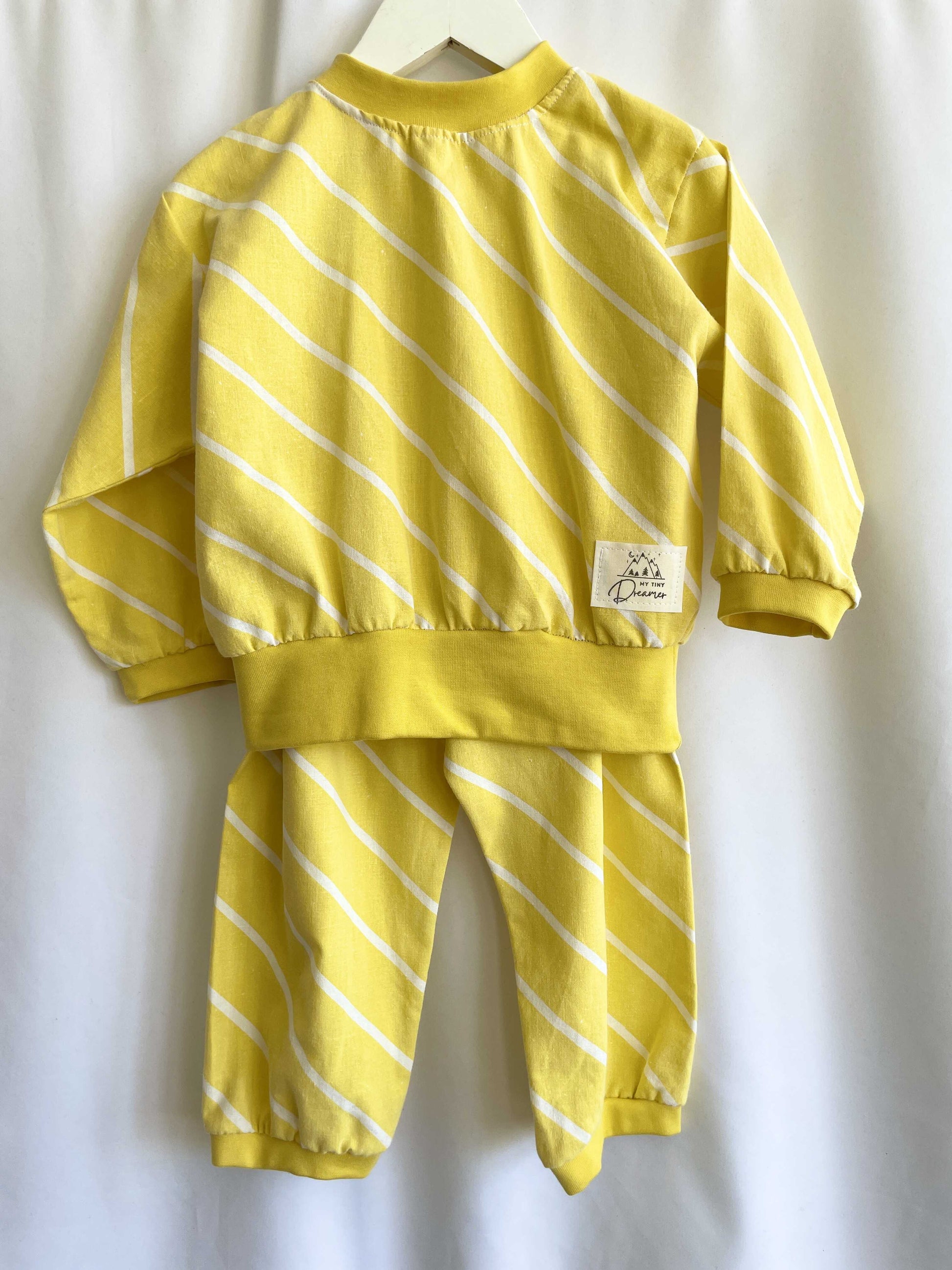 Det fineste solgule sæt, syet af et retro dynebetræk. Mønsteret med gul bund og hvide striber på skrå giver et charmerende og legende udtryk, der er ideelt til både hverdag og fest.