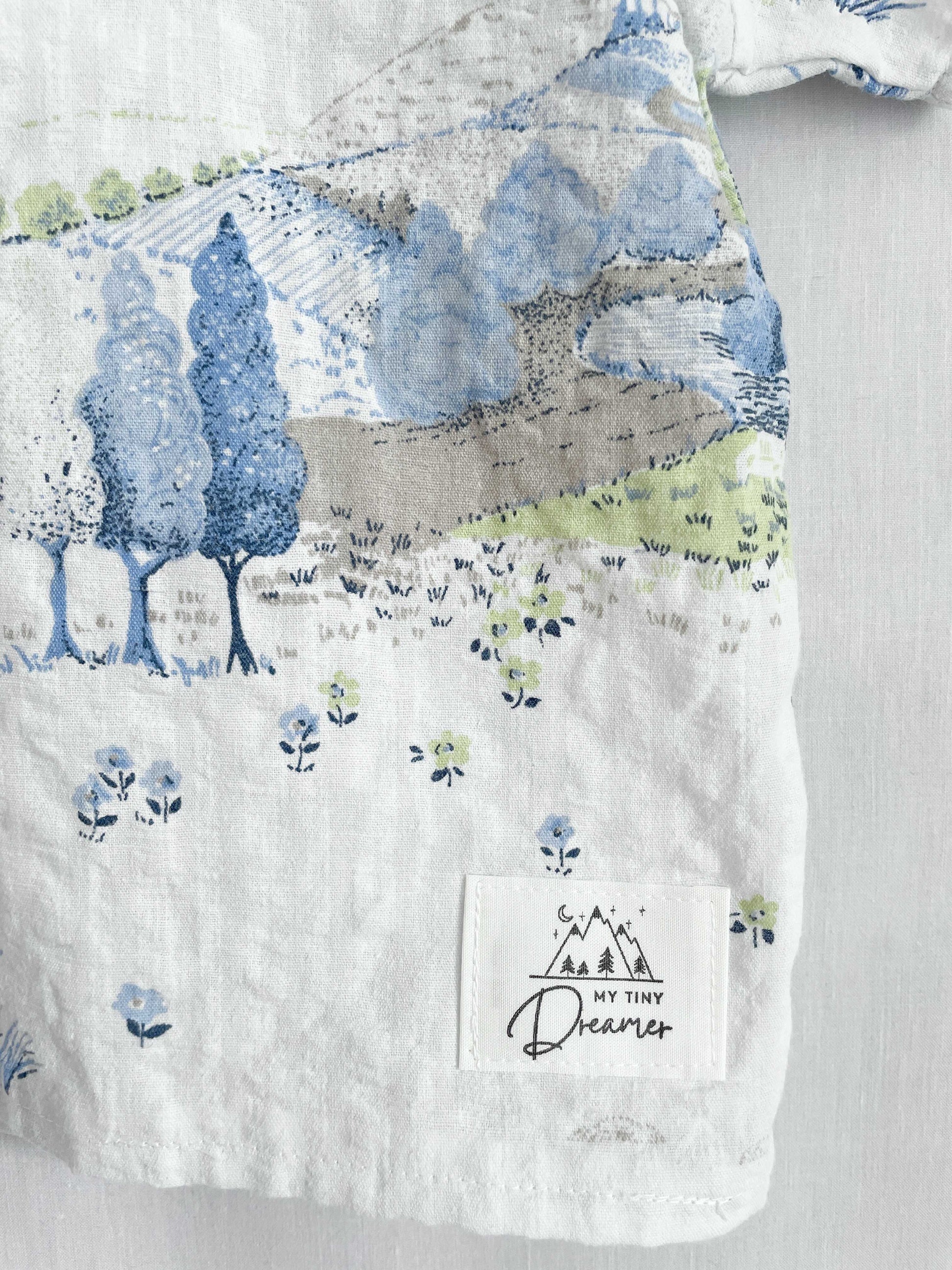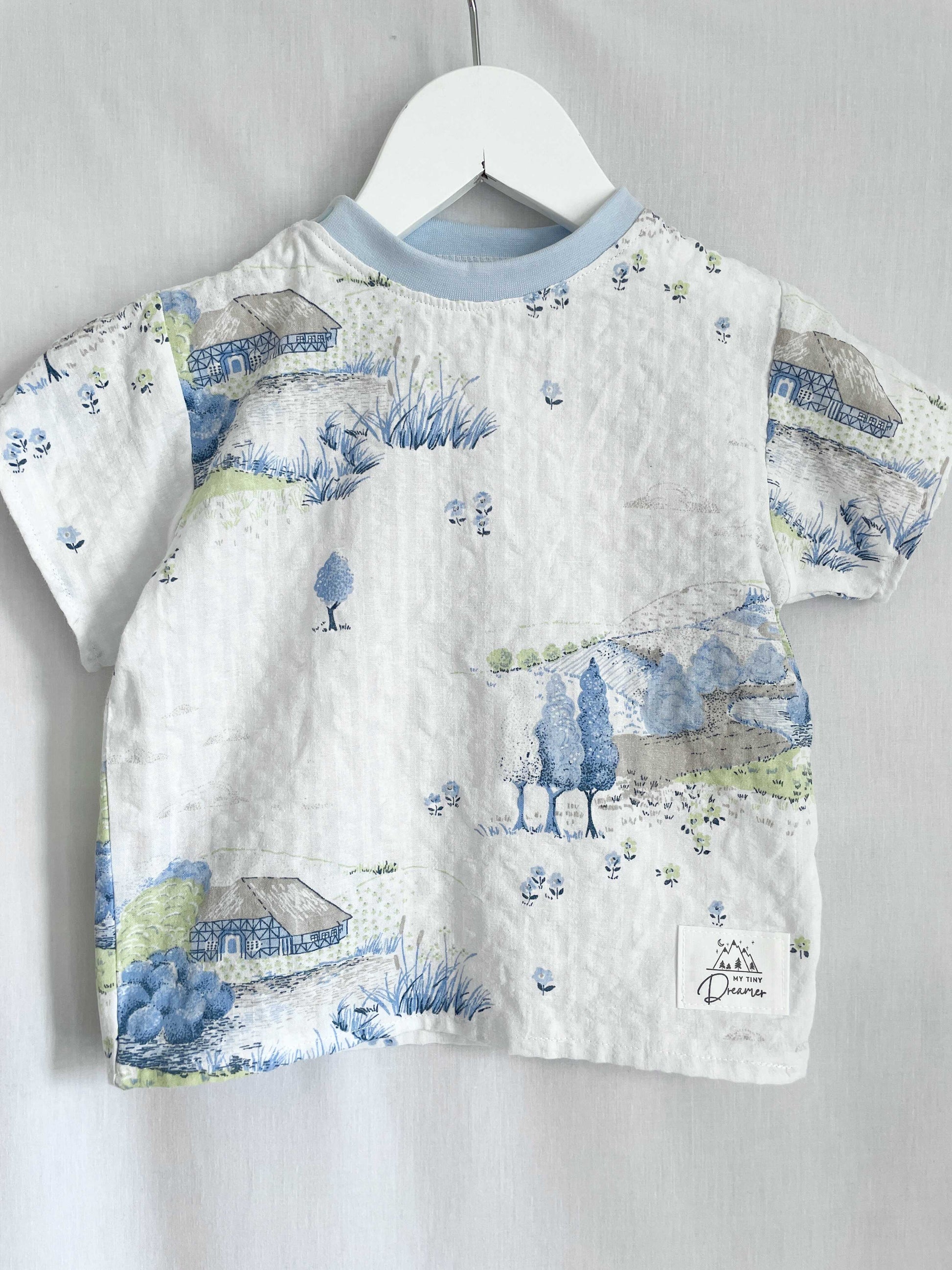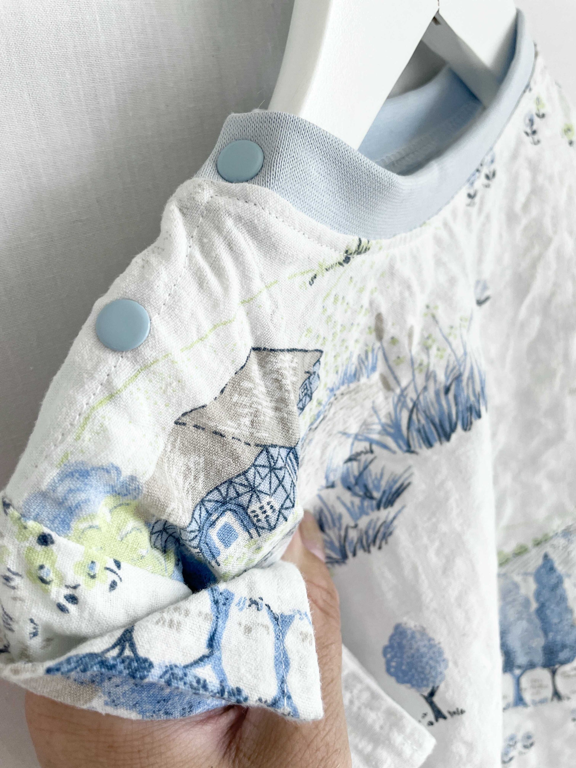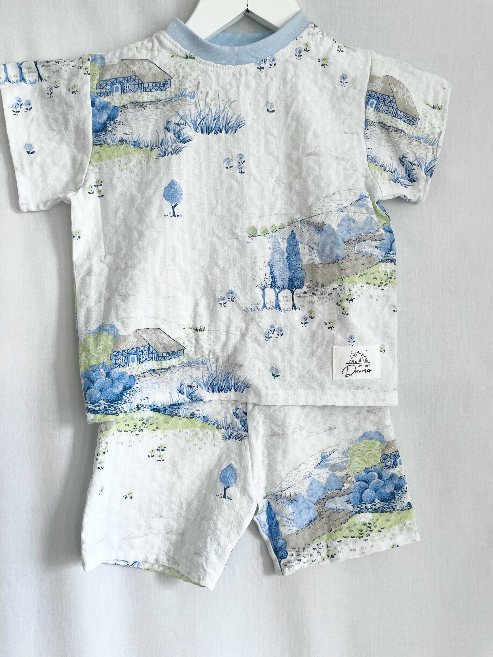 Sommersæt syet af lækkert og luftigt bæk og bølge sengetøj. Det er blødt og rart at have på og perfekt til varme sommerdage. Sættet har fine motiver af live på landet i blå og grønne nuancer med lyseblå rib og lyseblå trykknapper i skulderen så den er nem at tage af og på.