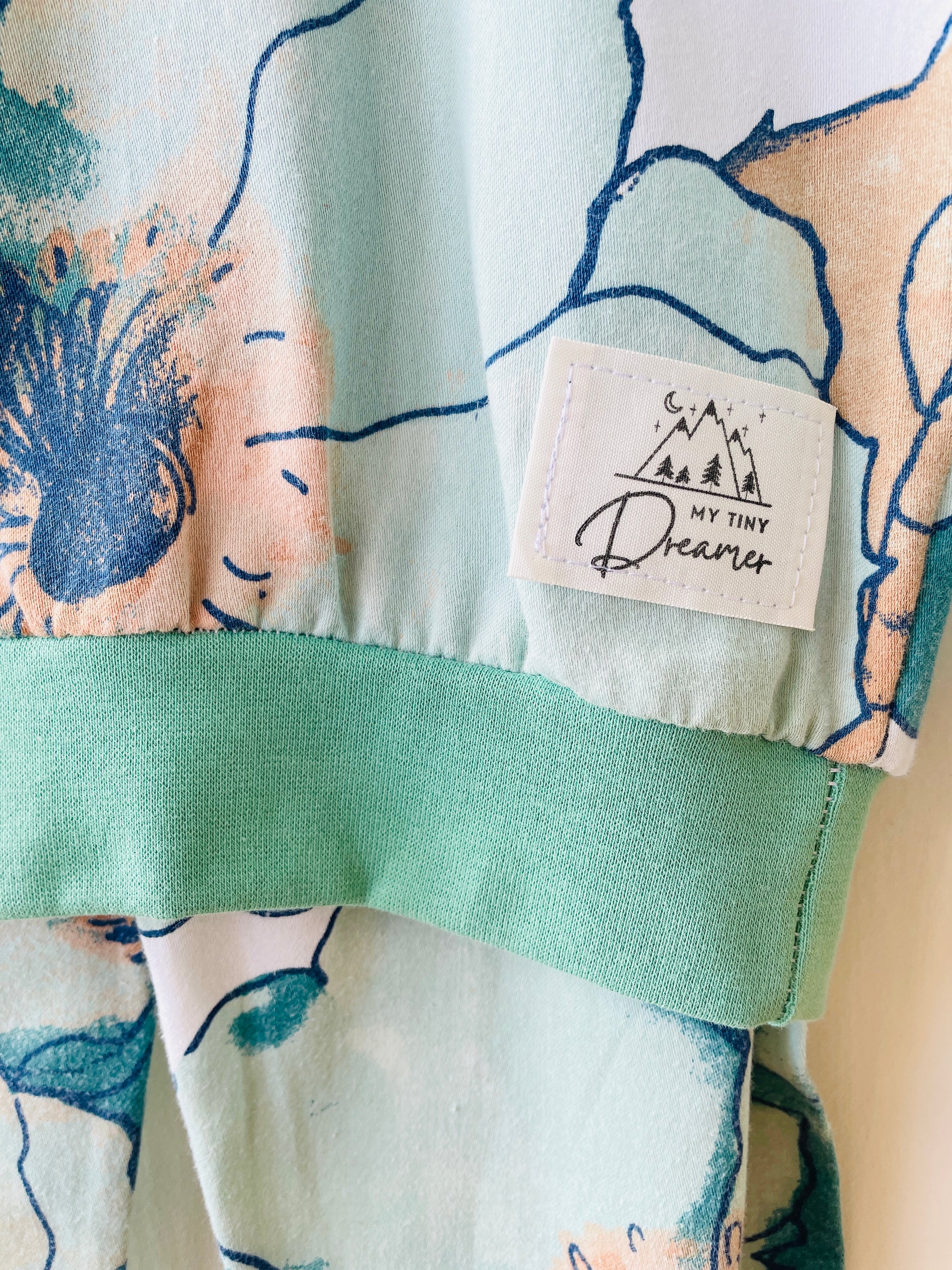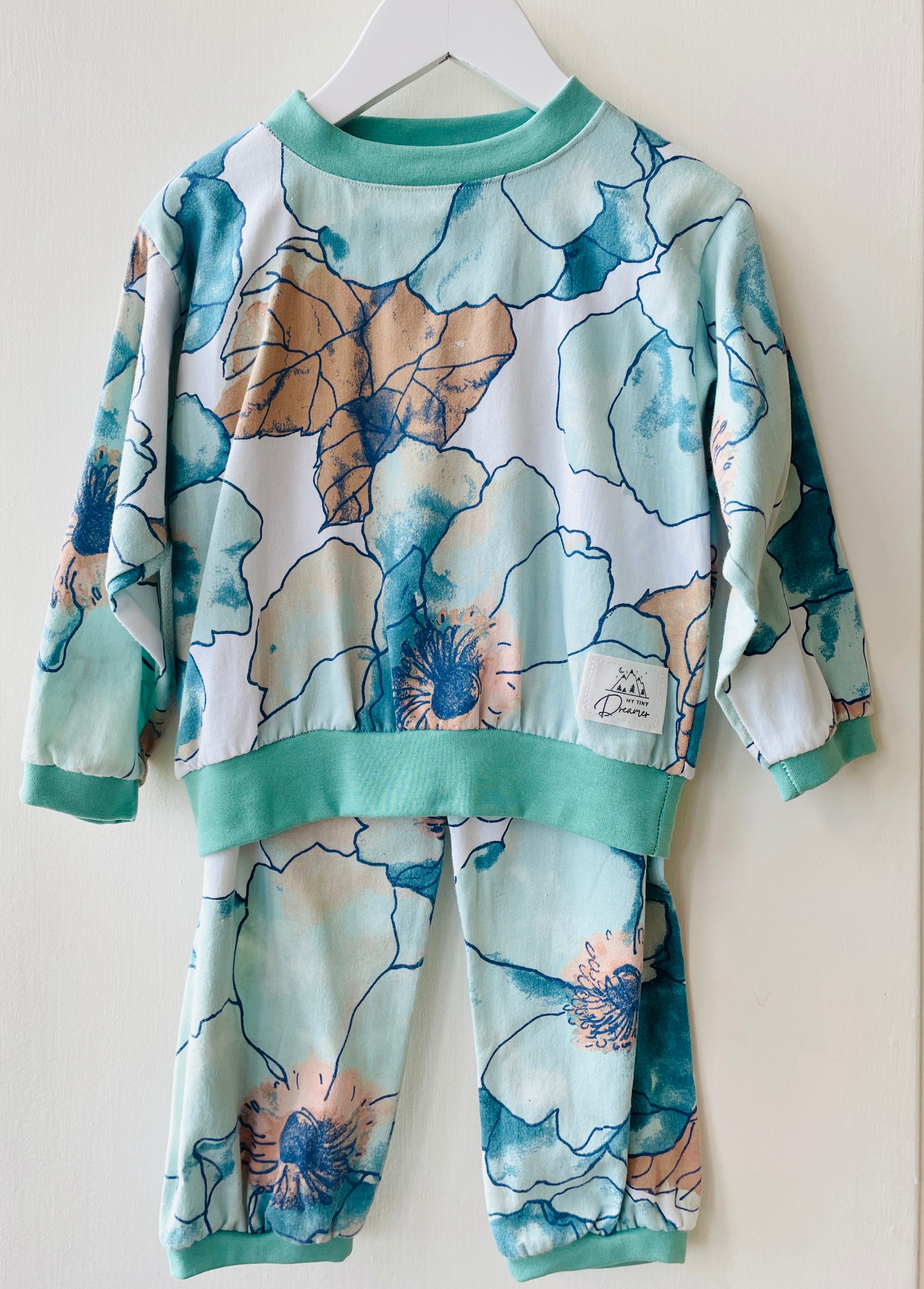 Det fineste sæt med lange ærmer og ben, perfekt til både drenge og piger. Sættet er syet af blødt, vintage sengetøj i betagende nuancer af turkis og terracotta. Dette unikke tøj er ideelt til både leg og hygge, og det bløde materiale sikrer maksimal komfort hele dagen.