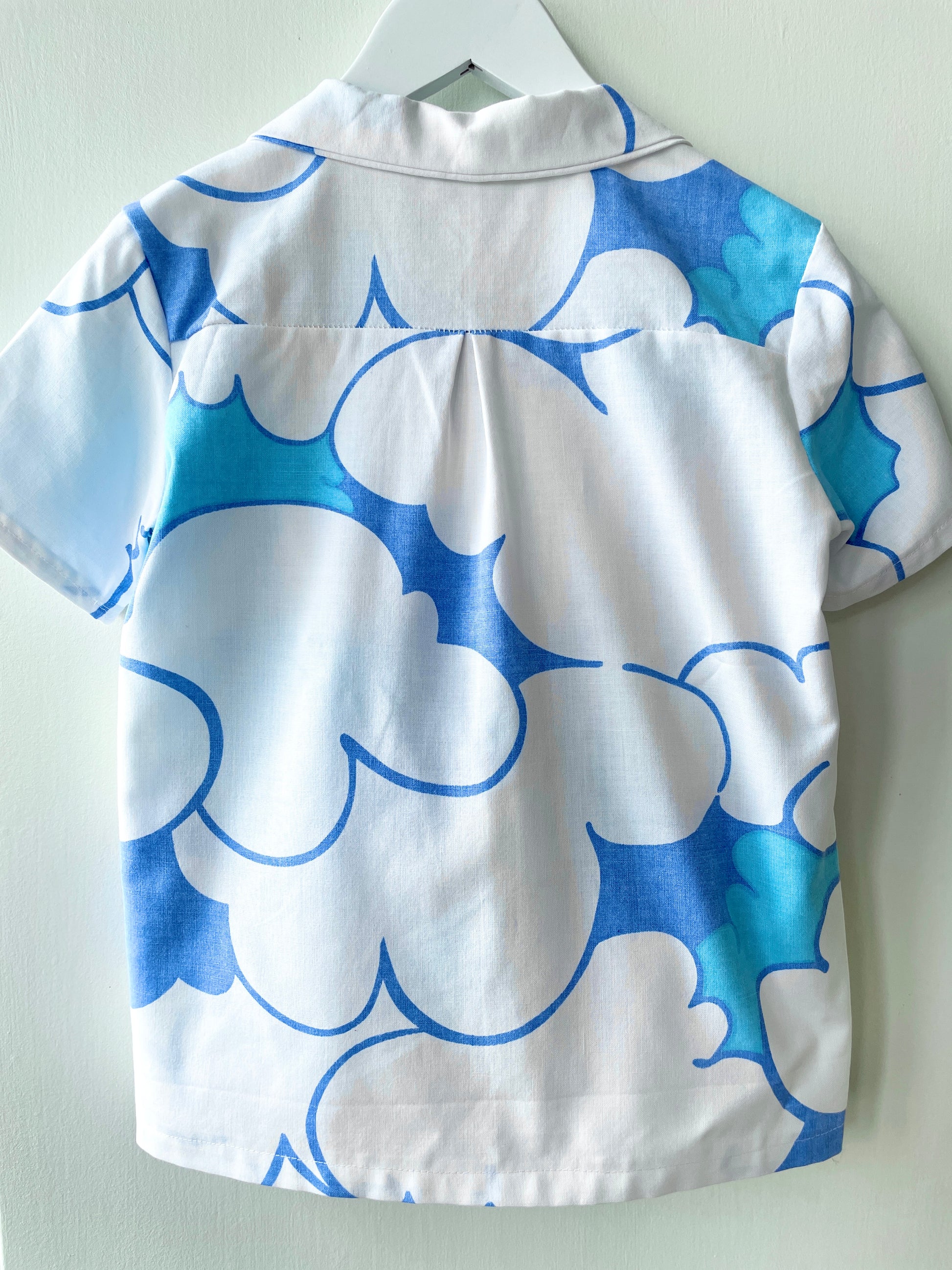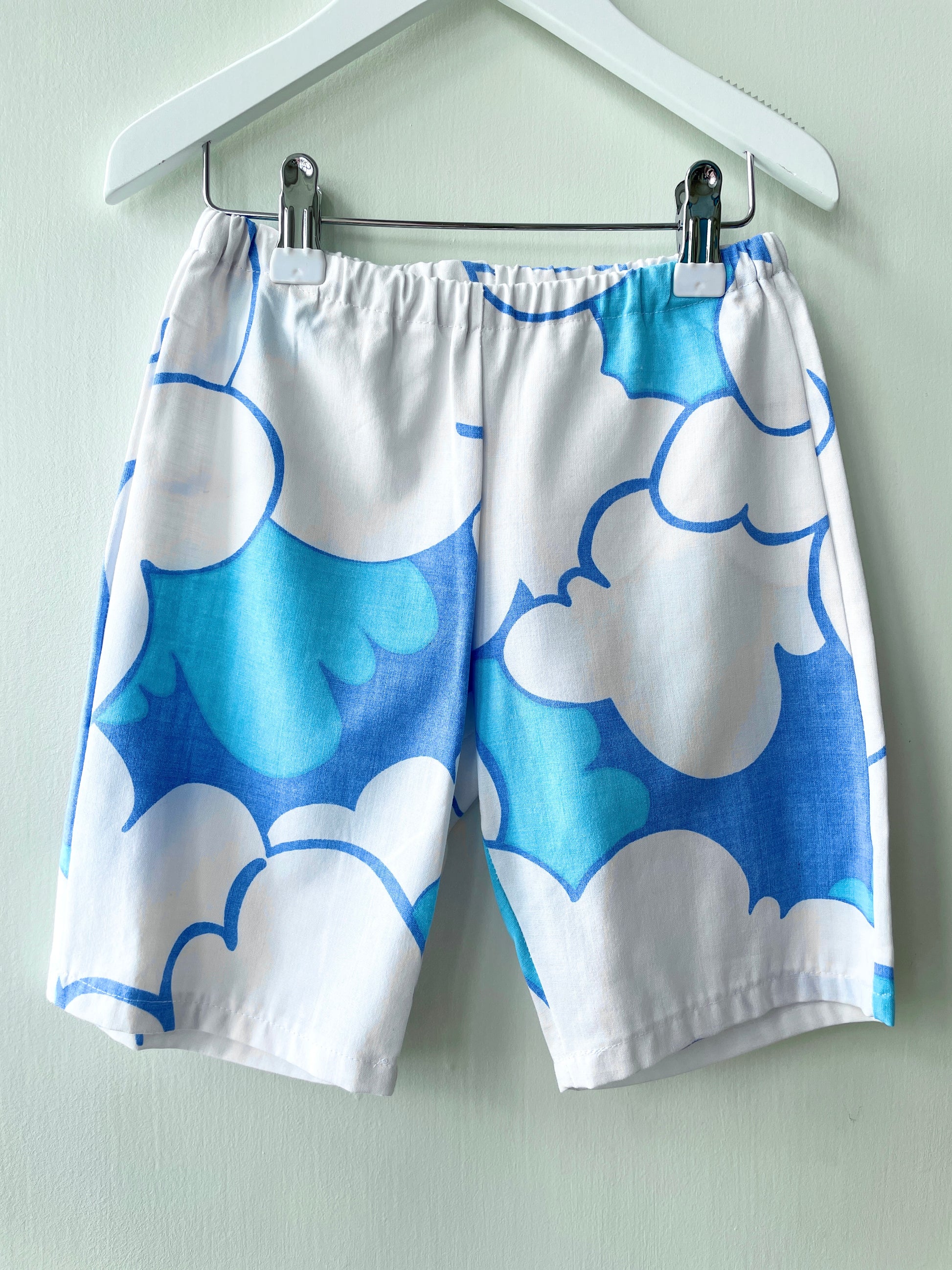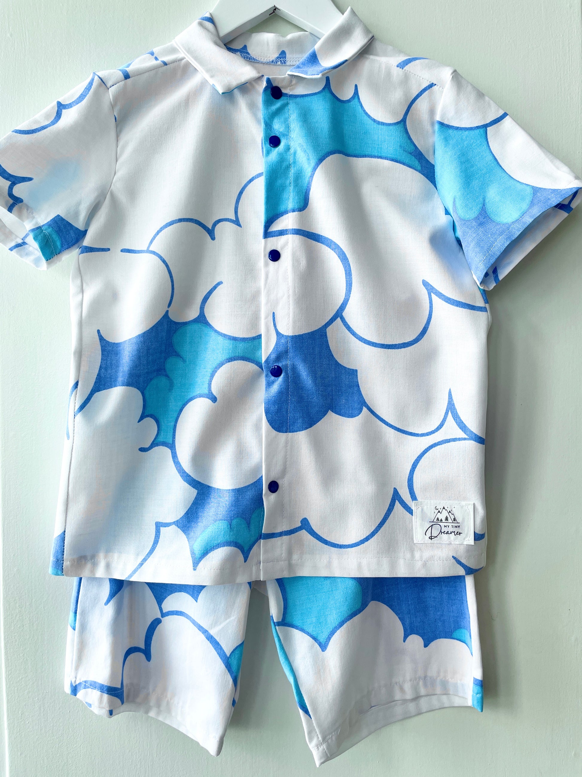 Det fineste sæt med skjorte og shorts til piger og drenge syet af retrotekstiler med de fineste blå skyer.