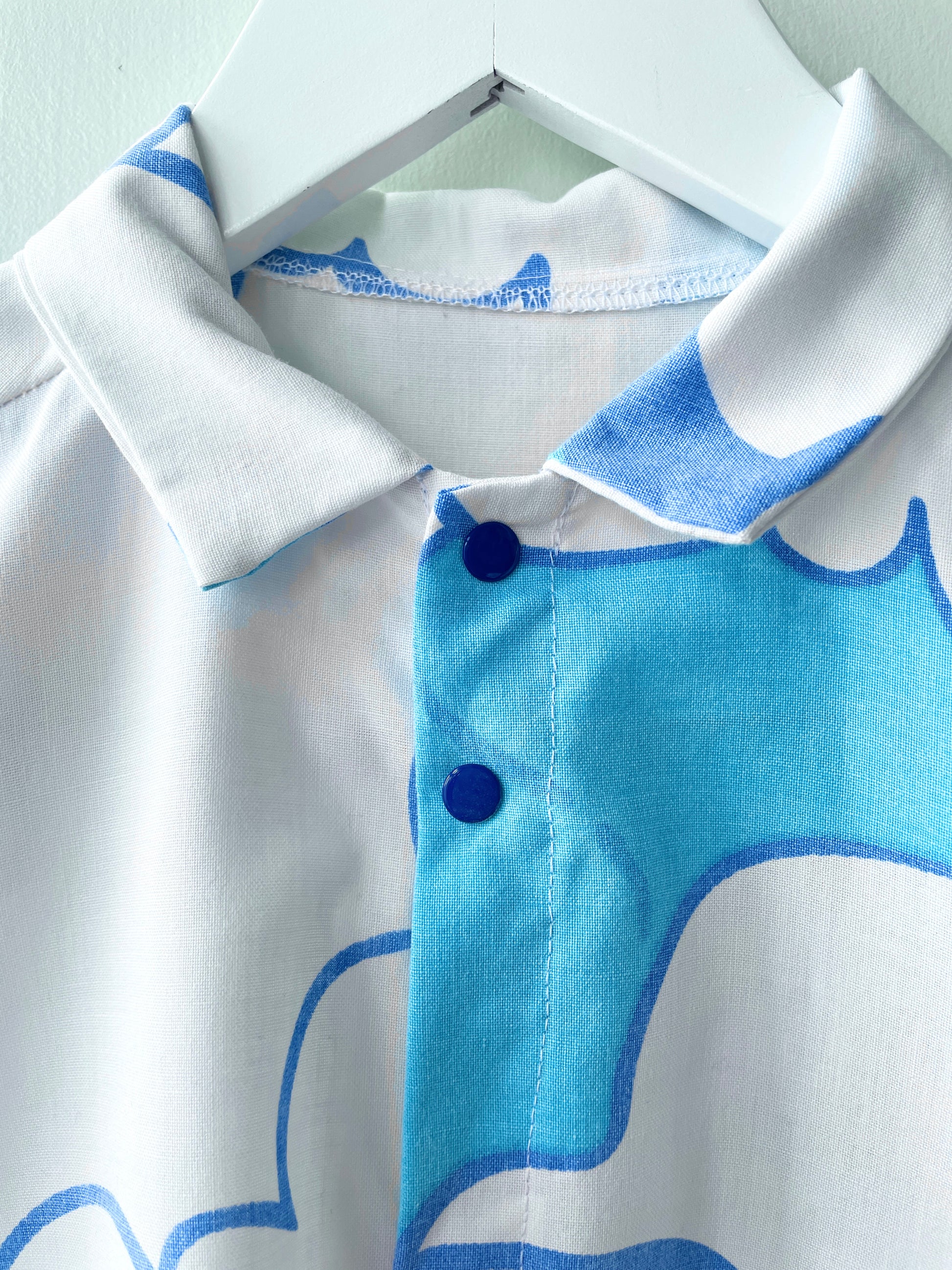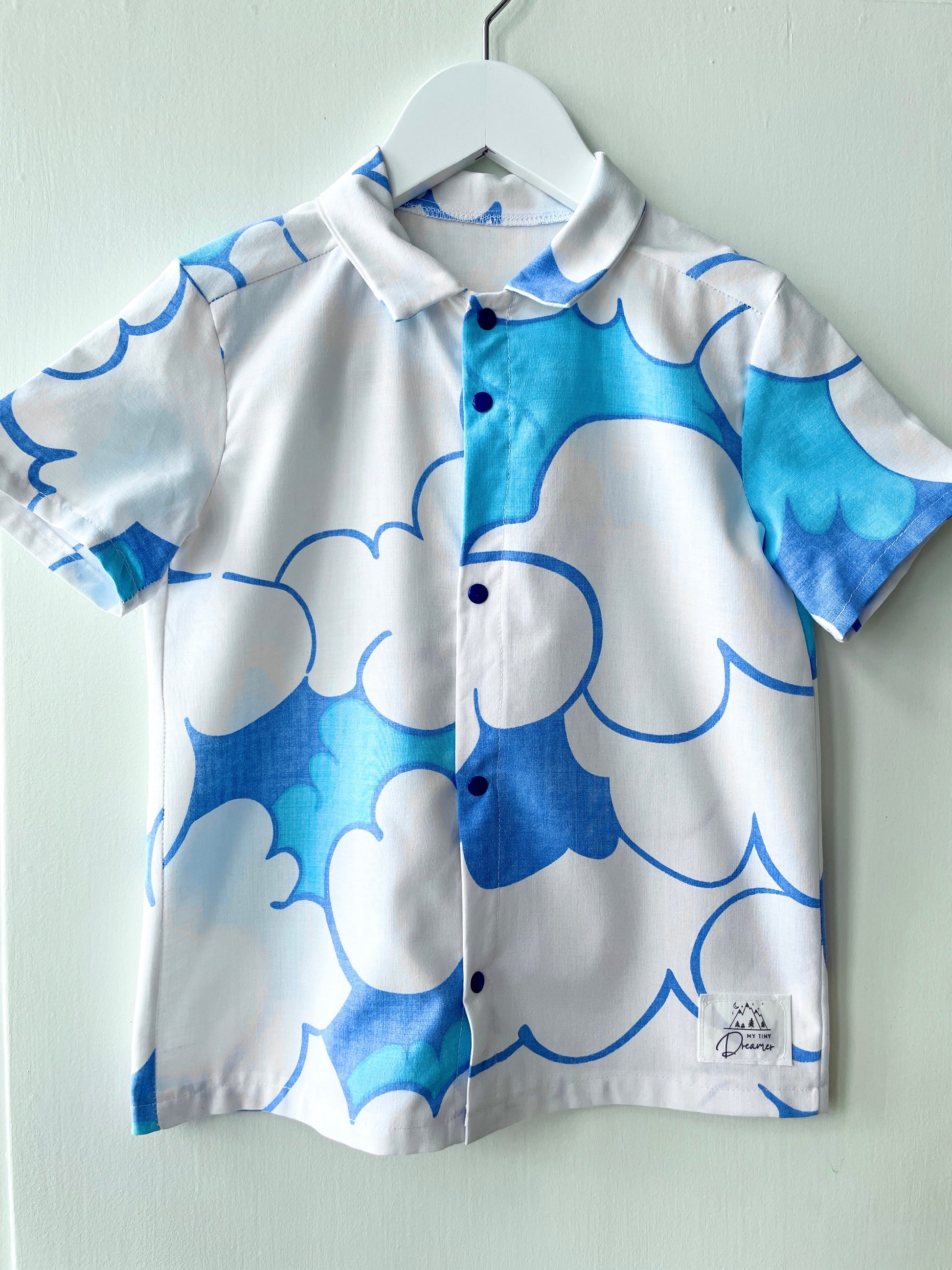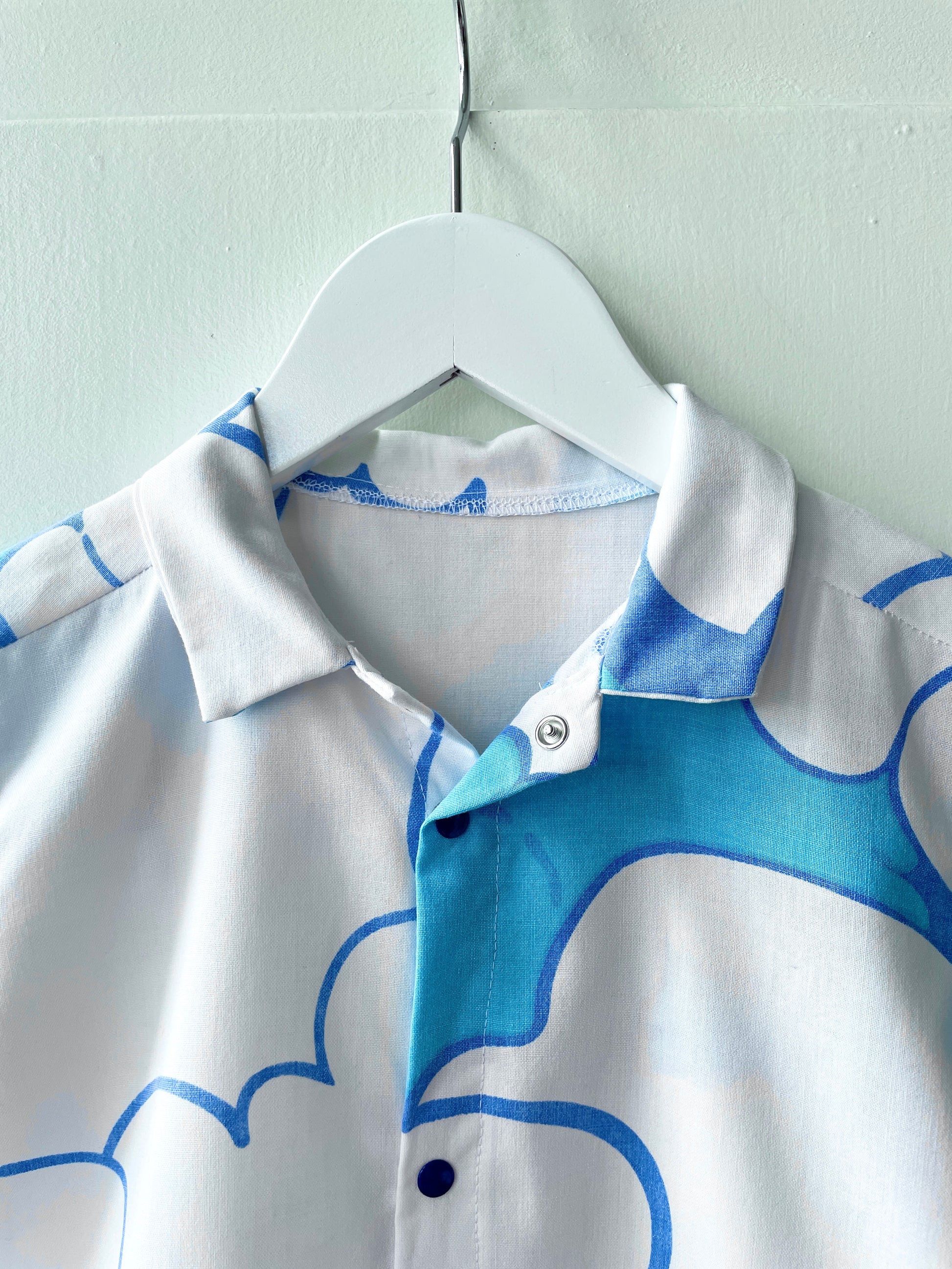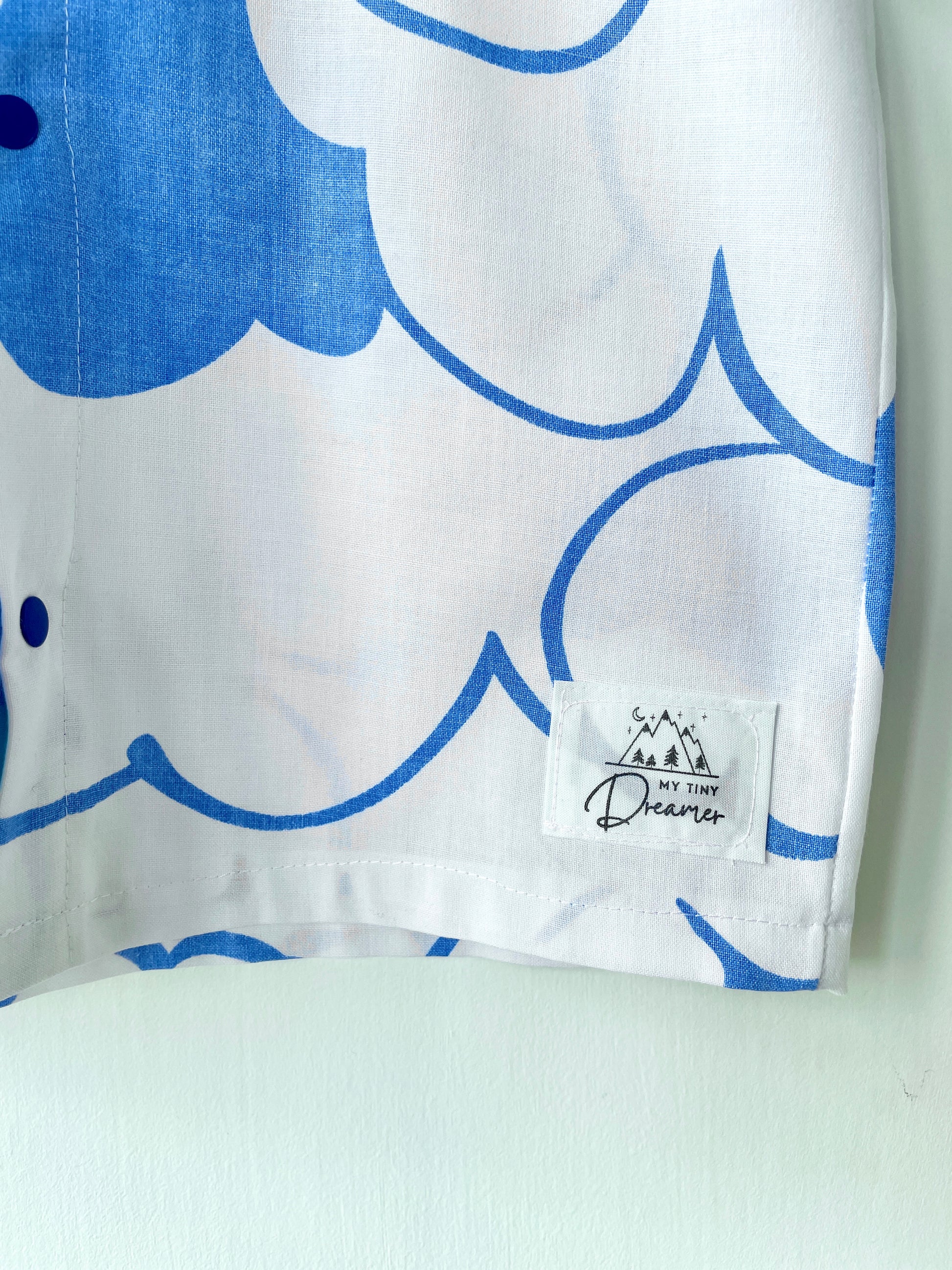Det fineste sæt med skjorte og shorts til piger og drenge syet af retrotekstiler med de fineste blå skyer.