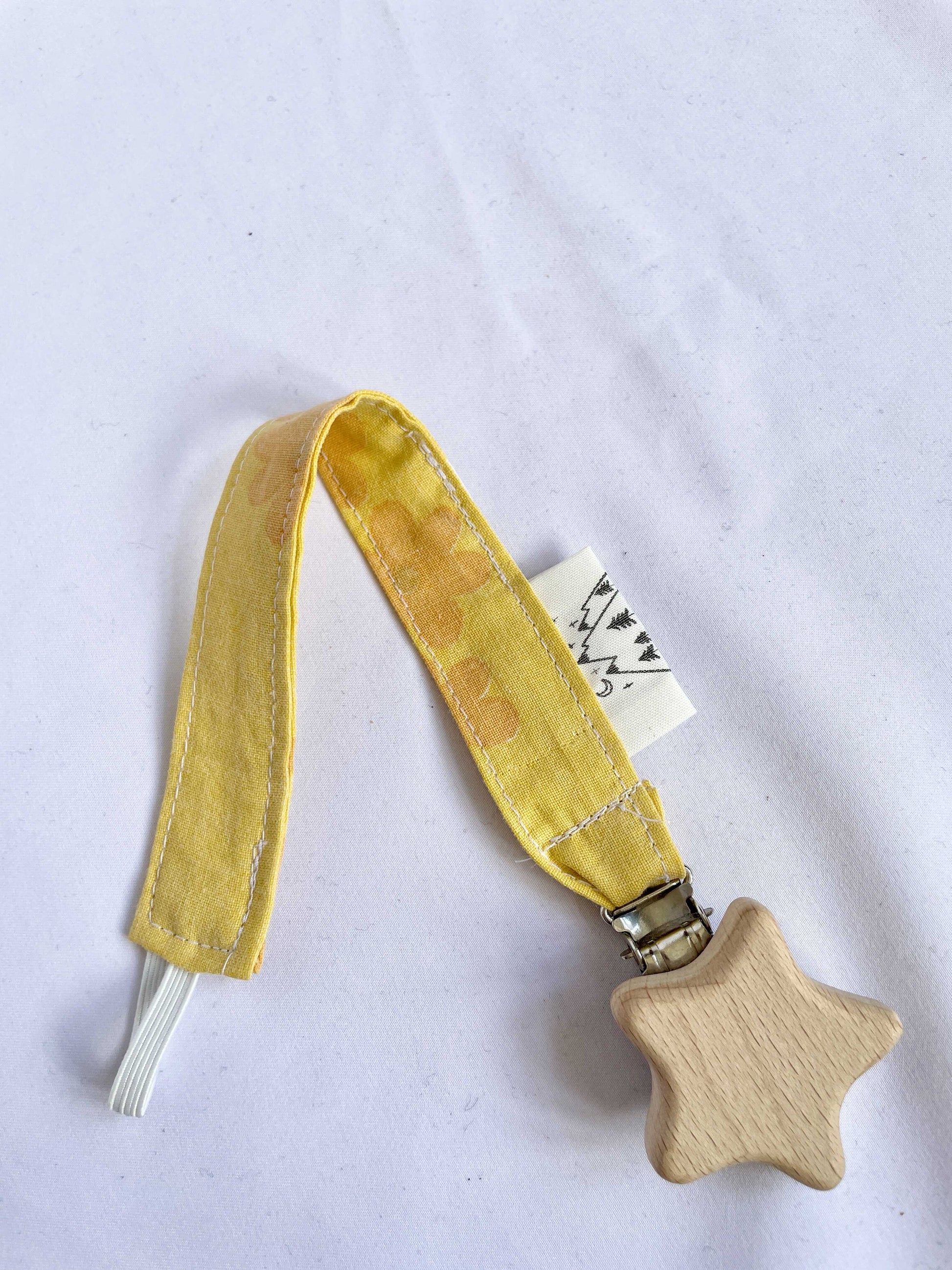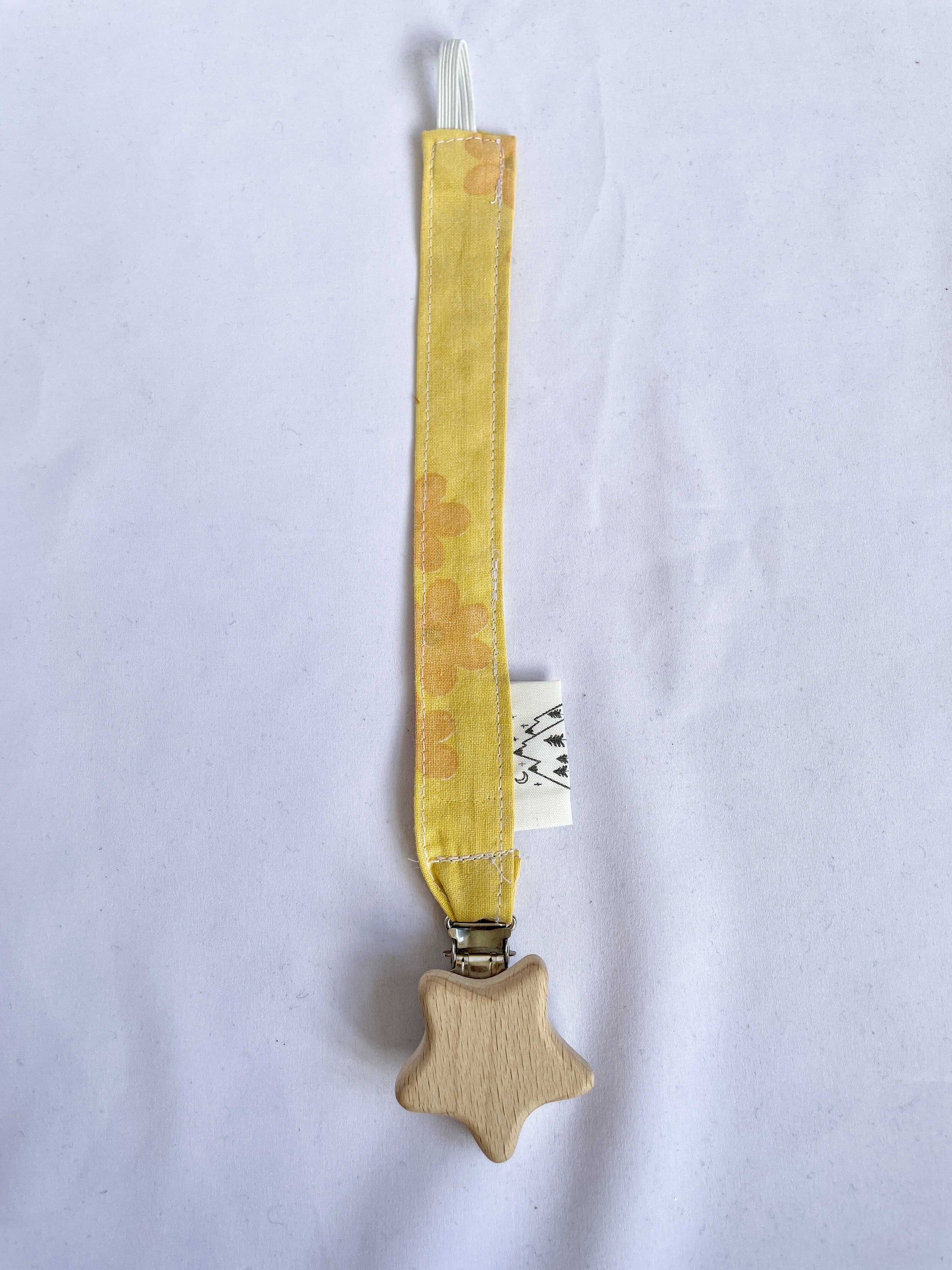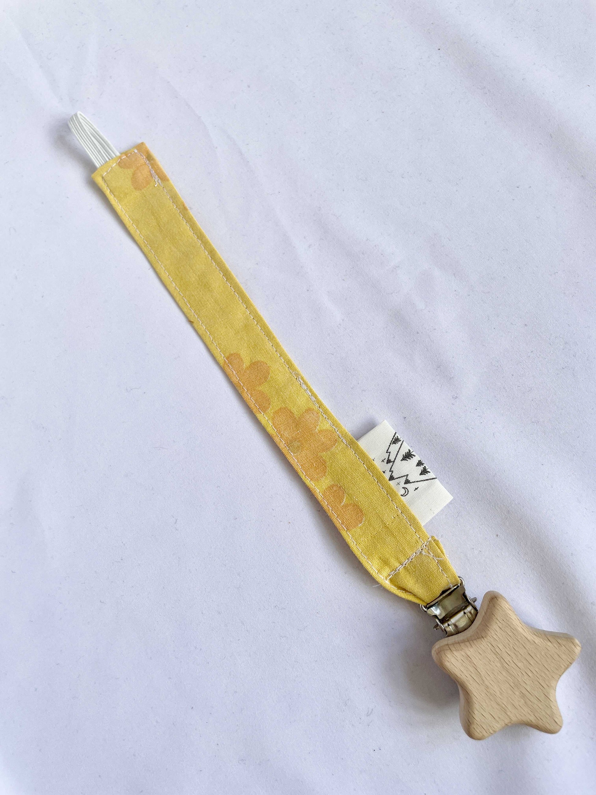 Charmerende suttesnor, syet af resterne af det blødeste gule sengetøj med orange og hvide blomster. Suttesnoren kombinerer bæredygtighed med en nostalgisk følelse, hvilket gør den både praktisk og unik. Denne suttesnor har en pyntesøm hele vejen rundt.