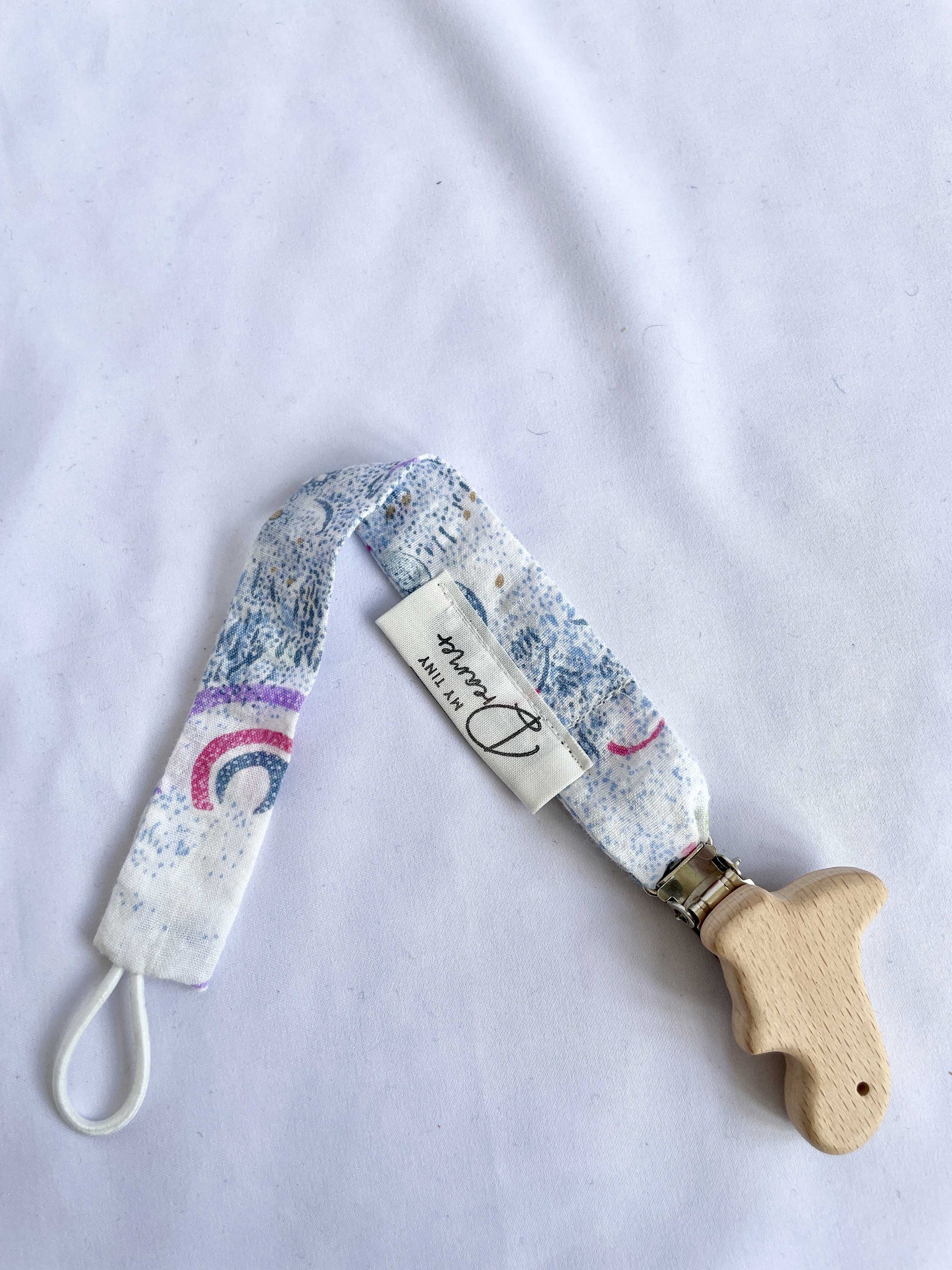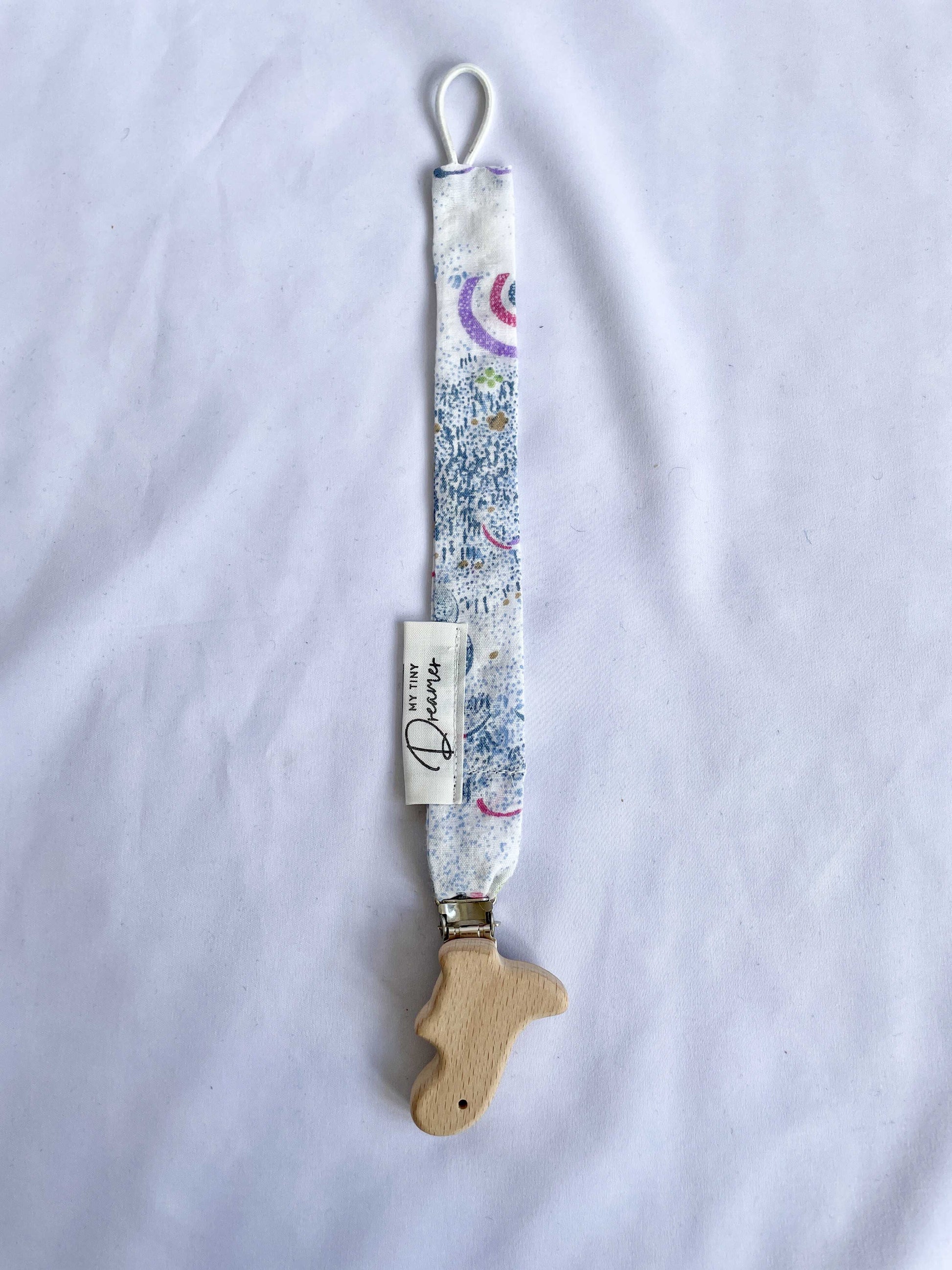 Charmerende suttesnor, syet af resterne af det fineste bæk og bølge sengetøj med et smukt landskab med regnbuer og træer i smukke farver. Suttesnoren kombinerer bæredygtighed med en nostalgisk følelse, hvilket gør den både praktisk og unik.