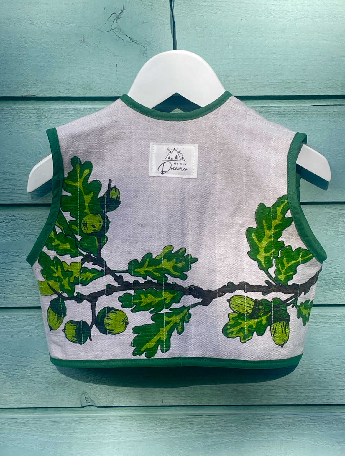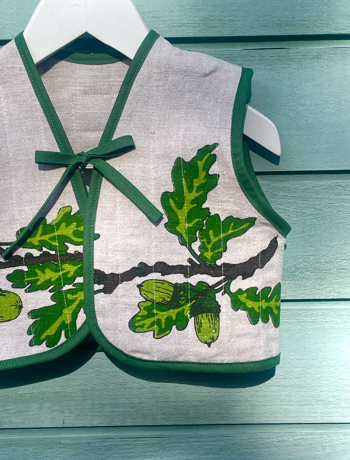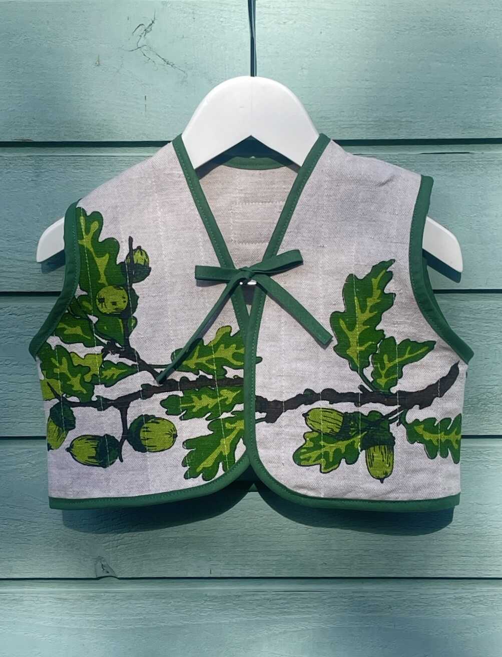 Sødeste lille vest med de fineste efterårsgrene med agern. Syet af skønne dækkeservietter med let vattering. Vesten er afsluttet med matchende kantebånd for en smuk finish og lukkes med bindebånd.